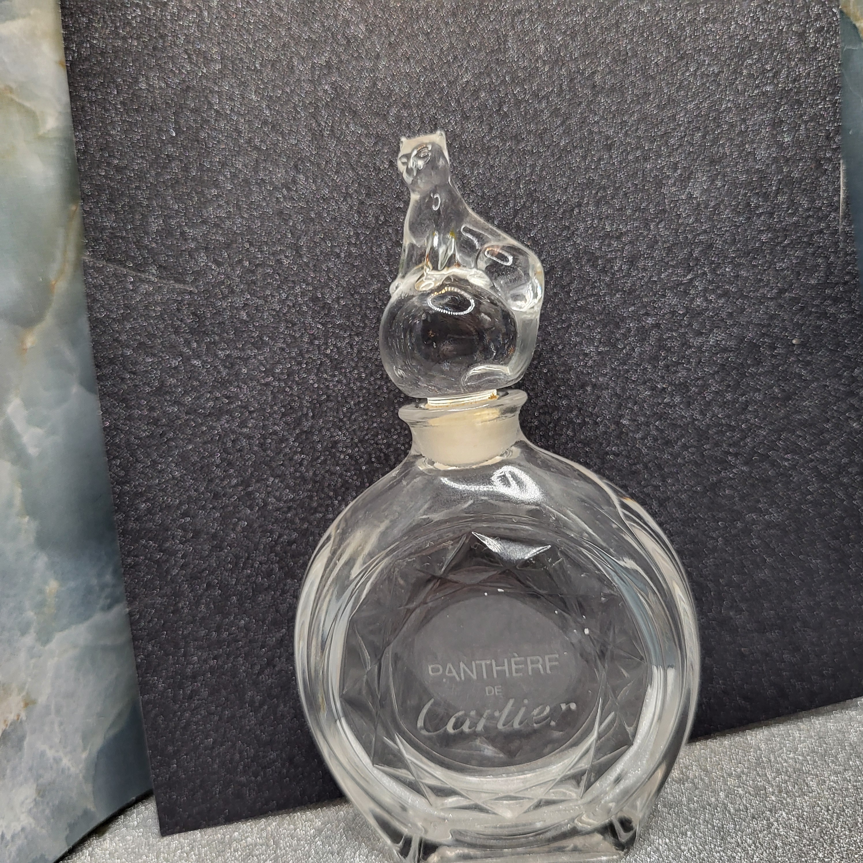 This is an authentic empty decanter-style bottle that once held Eau de Toilette Pantere’ by Cartier of France. The collectible glass decanter-style bottle is topped with the iconic Cartier panther, which is in excellent condition. According to the original owner, this bottle was purchased approximately in 1992. AdminCode: CAJ1/ne