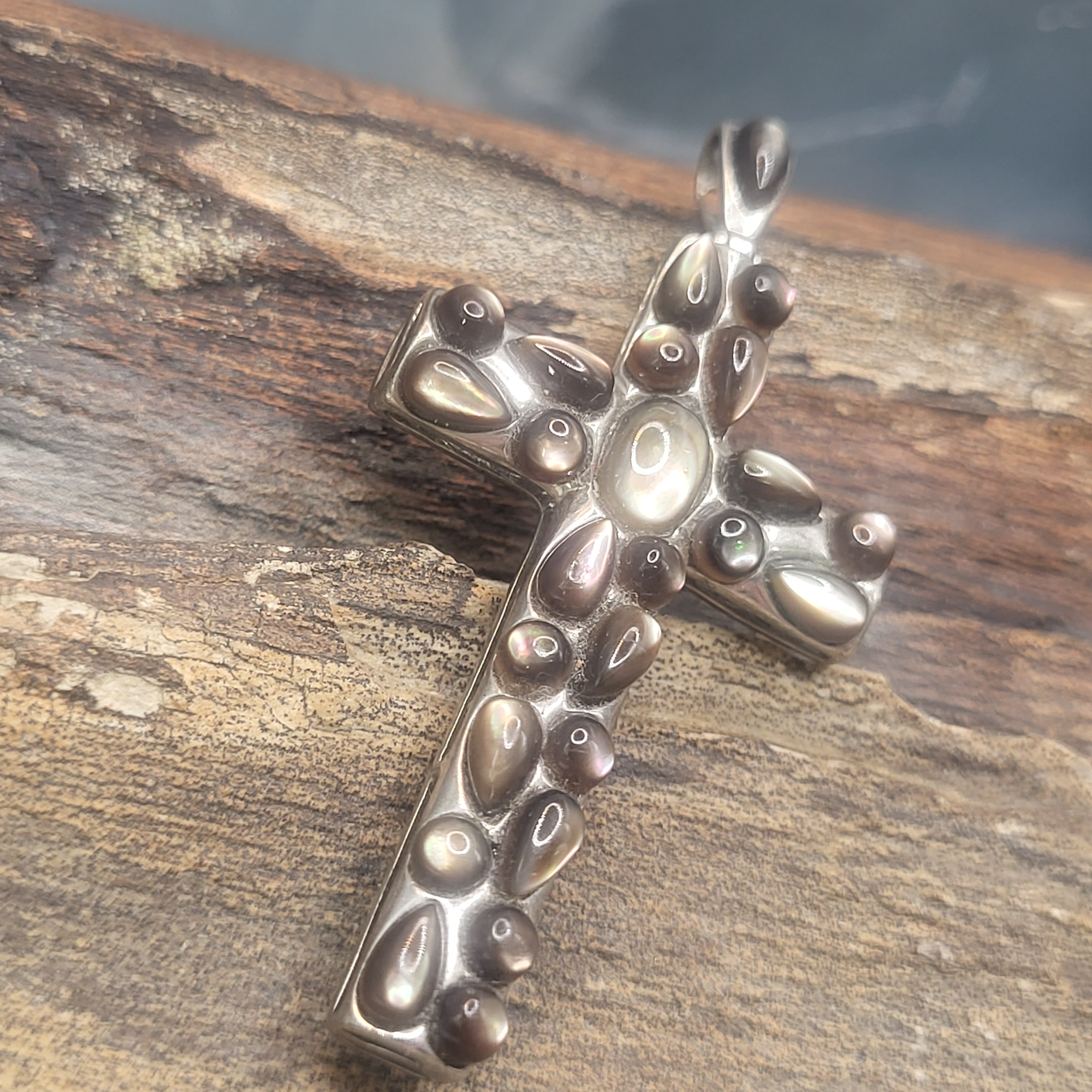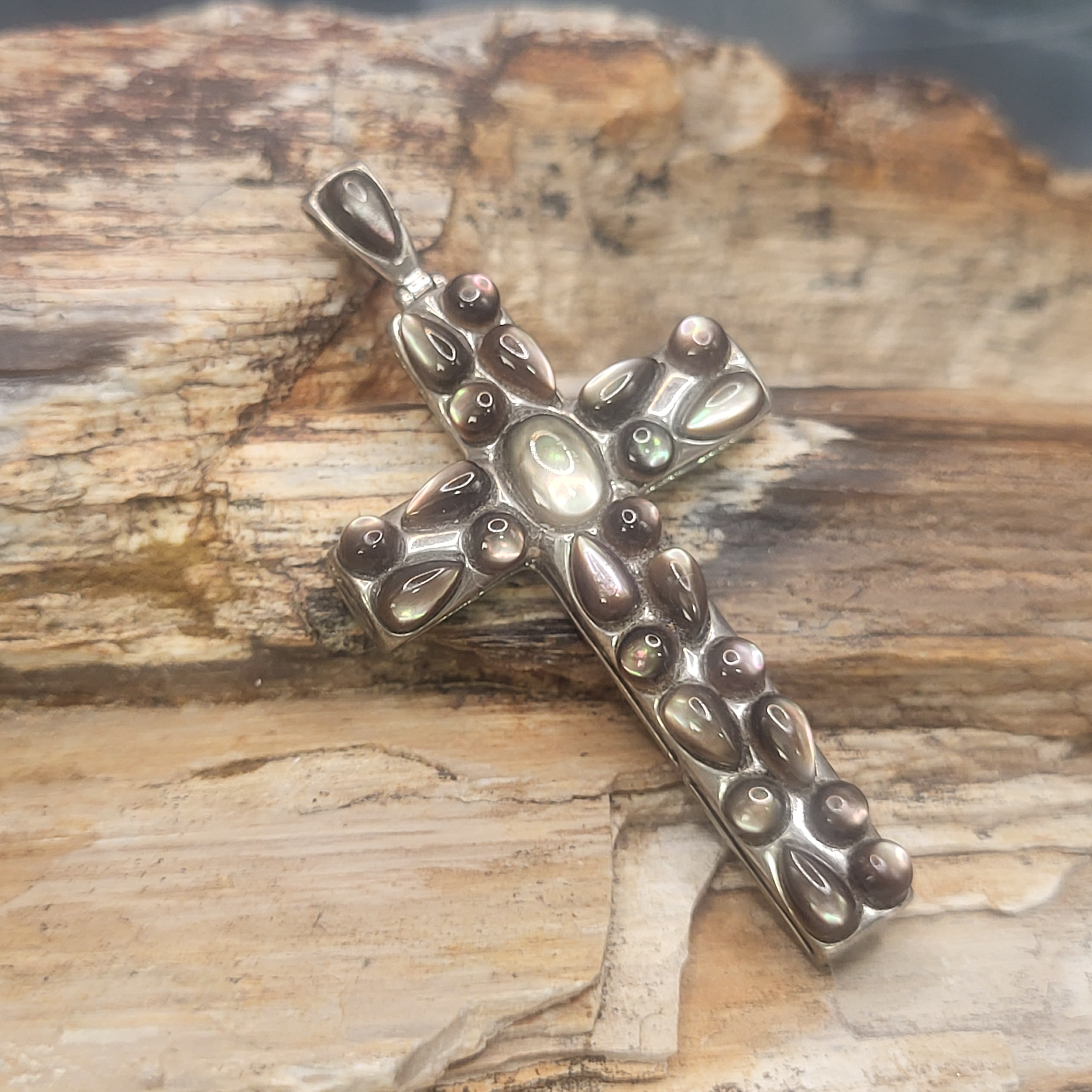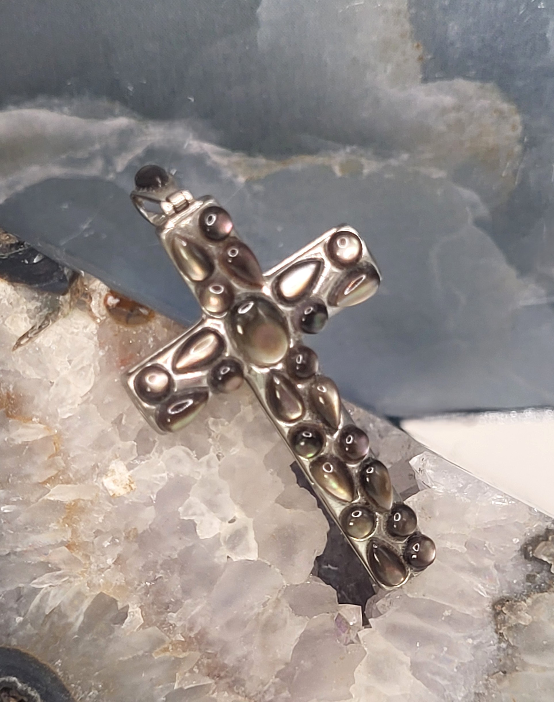 This sterlng silver pendant is quite stunning with polished cabachon abalone shells encrusting the front of the cross in a cobblestone look, whle the back of the cross is equallly beautiful with a reticulated, ornate back gallery. The bail is decorated with a cut-out heart on the back and a pear-shaped abalone cabochon on the frong. The bail is attached to the cross with a hinge, so it folds forward and backward and can accommodate an approximate 3mm wide chain. It weighs 6.56 grams. AdminCode: KBJS/bg