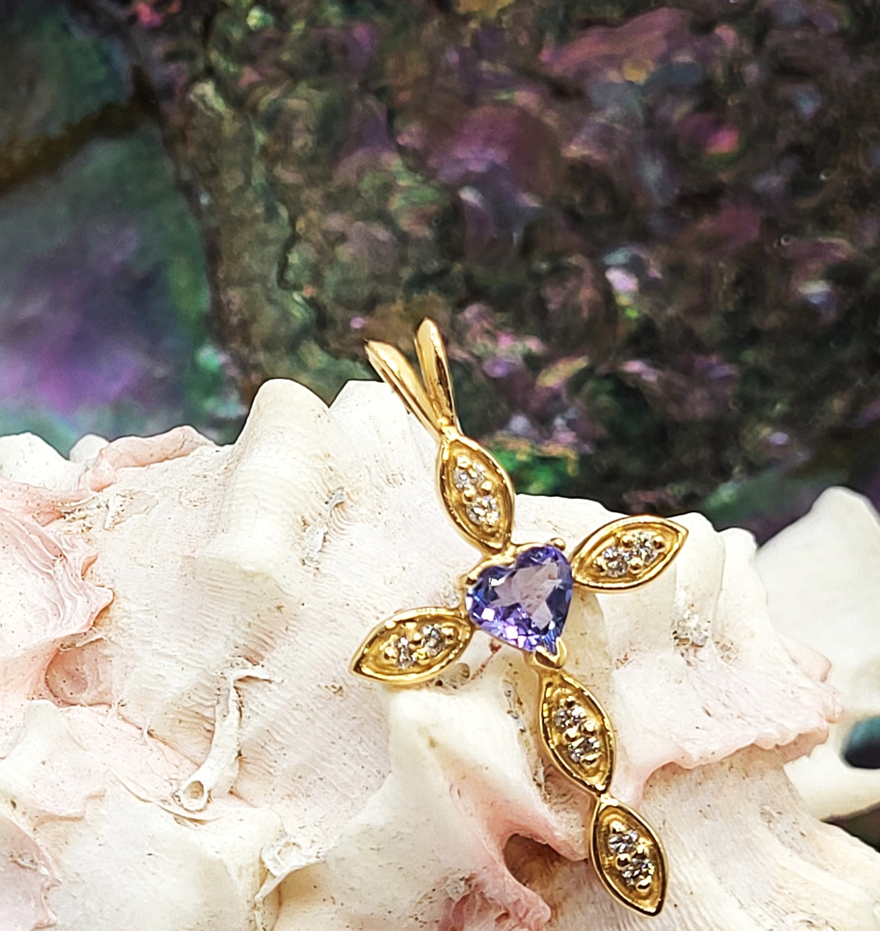 This is a 14 karat yellow gold cross pendant with an approximate .55 carat heart-cut, prong-set, genuine tanzanite and approximately .20 carat total weight of round, brilliant-cut, H, SI2-I1 clarity diamonds on the rail and arms. The cross is approximately 1.25" tall and 7/8" wide and the rabbit ear bail can accommodate an approximate 1.25mm thick chain. Admin: G11241/14ilt