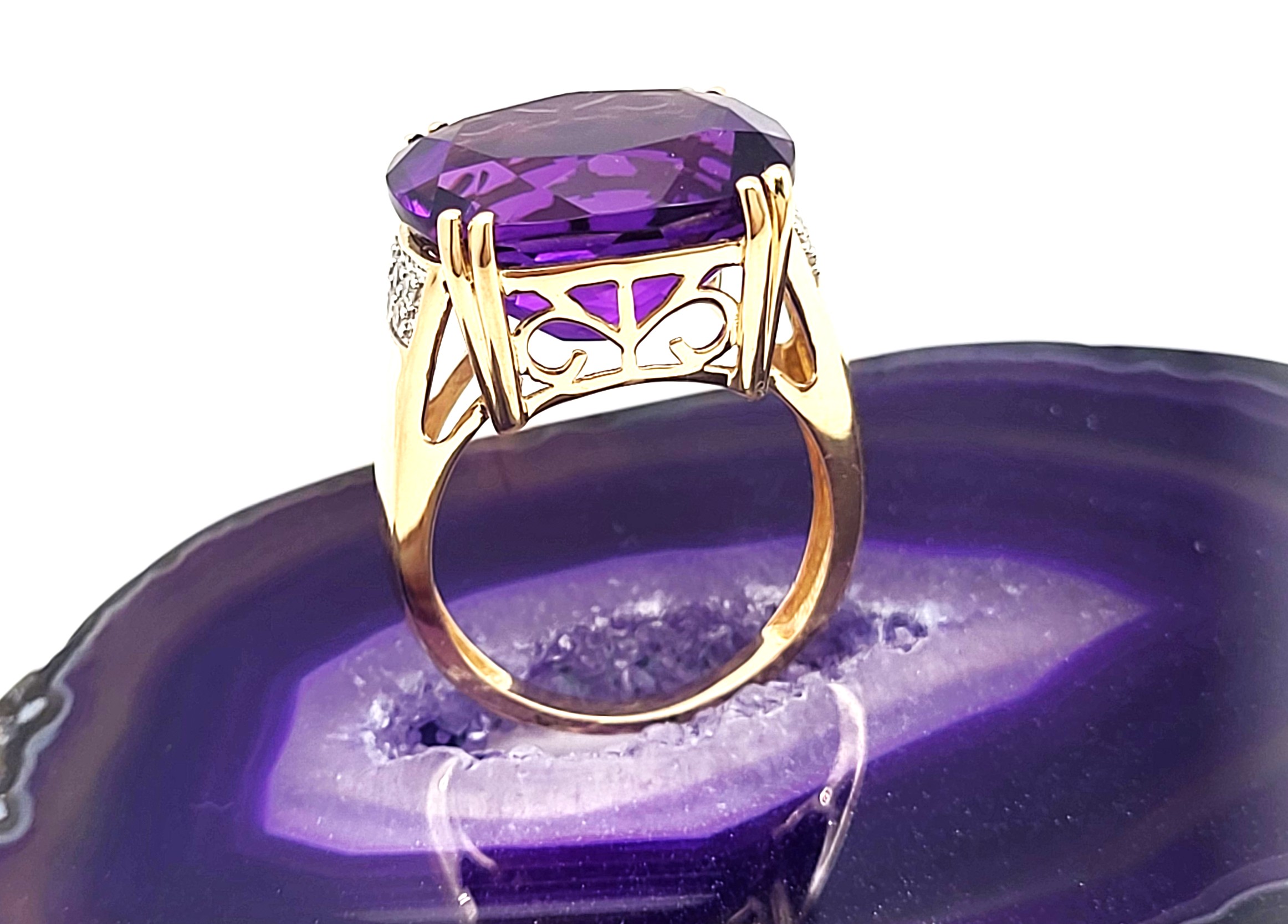 This 14 karat yellow gold ring features an impressive 11.25 carat, cushion-cut, natural amethyst that is set with alluring split prongs over a swirling, reticulated bridge. The wide cathedral shoulders have .17 carats total weight of micro-pave set, round, brilliant-cut, H-I color, I1 clarity diamonds. The ring is US size 7. See below for sizing options and other information.