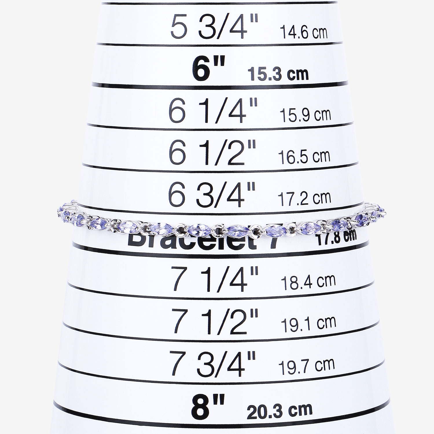 This sterling silver bracelet features 27 marquise-cut, prong-set, genuine tanzanites that sparkle like lavender ice! There are 3.78 carats of tanzanite in the bracelet and the sterling silver has a tarnish-resistant rhodium finish to give maximum shine with minimal effort! The bracelet is 7" long with a hidden box clasp that has 2 safety clips. 7.61 grams. AdminCode: Qblb