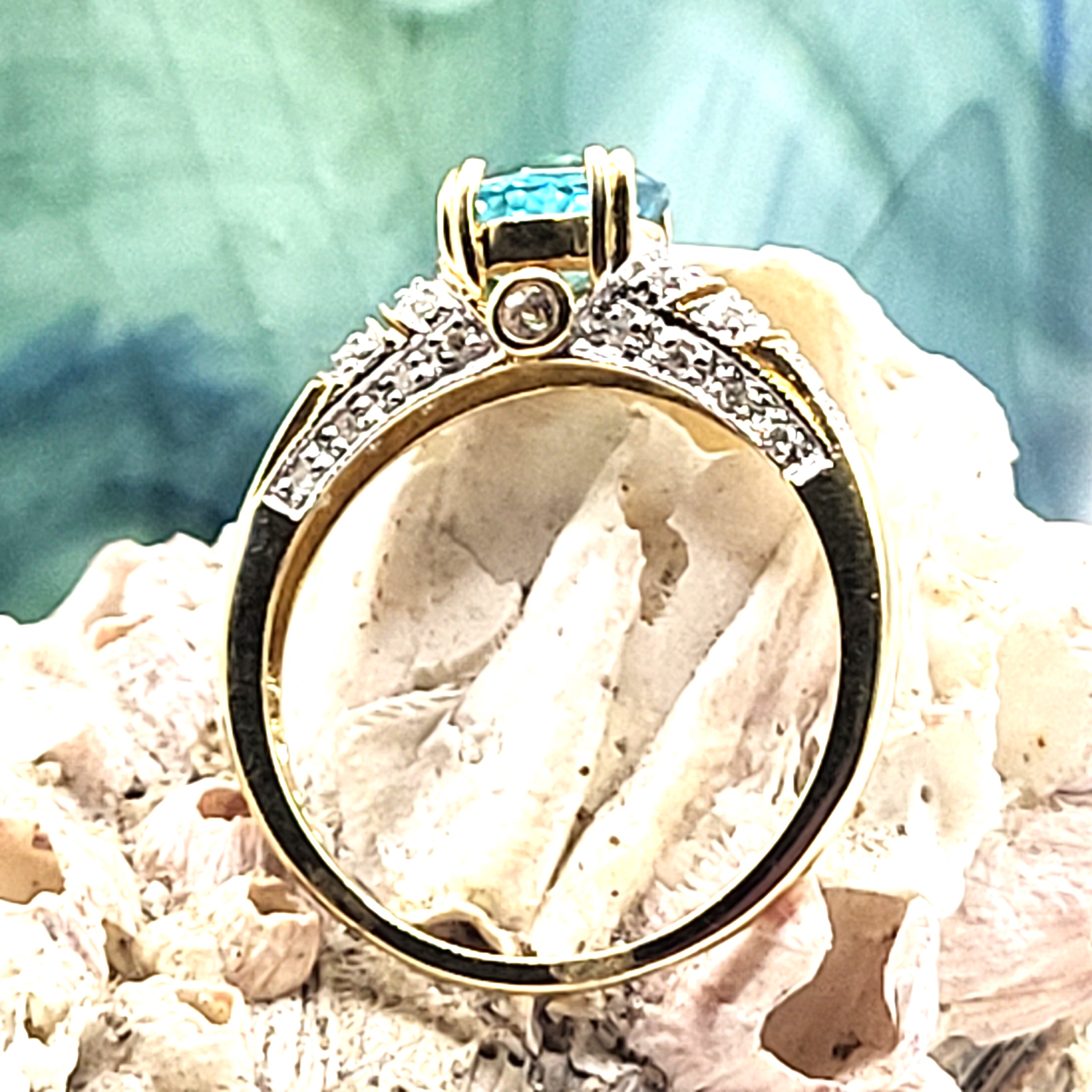 This is a 14 karat yellow gold ring that features a gorgeous oval-cut, East-West set with double prongs, genuine blue zircon, approximately 2.00 carats. There are .25 carats total weight of round, brilliant-cut diamonds in the bridge and along the shoulders. This ring is an approximate US size 10 and can be sized for an additional charge. Please contact Bidfair Fine Jewelry for sizing details. Admin: 33110/10lh