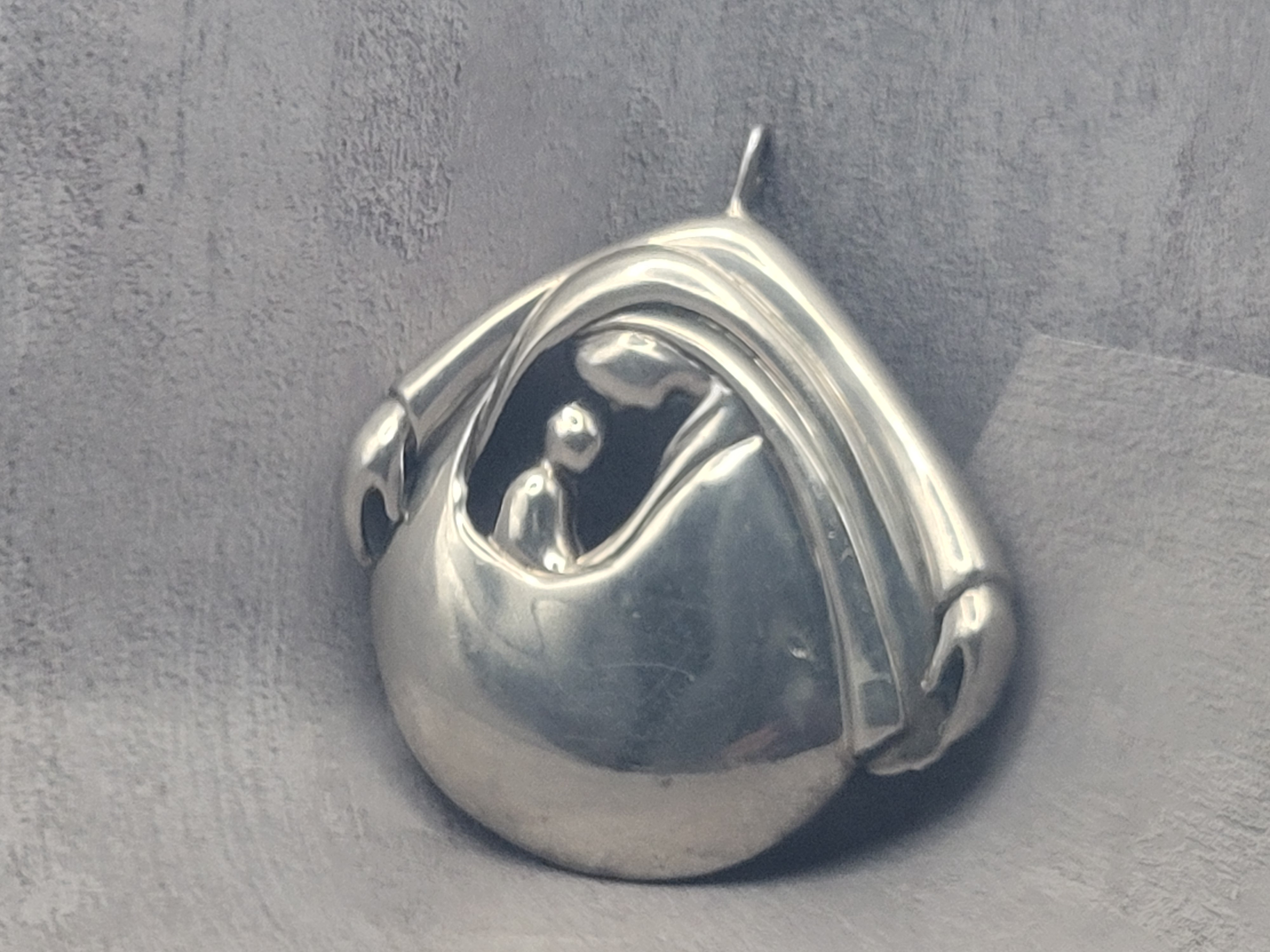 This is just in time for the 30th anniversary of the Sterling silver ornament called "Circle of Hope" by renowned artist, Susan Gorman. Released in 1996 as a limited edition item, this piece is marked as 990. Unknown how many were made in this collection. This ornament measures approximately 3.5" in diameter and has a ring affixed at the top that has an approximate 3.80mm opening for a ribbon or hook or chain. This sterling silver ornament is marked on a tag on the back with "925" the number of the item 990, the year "1996" and the Susan Gorman hallmark " . Admin: Khh/29.brr