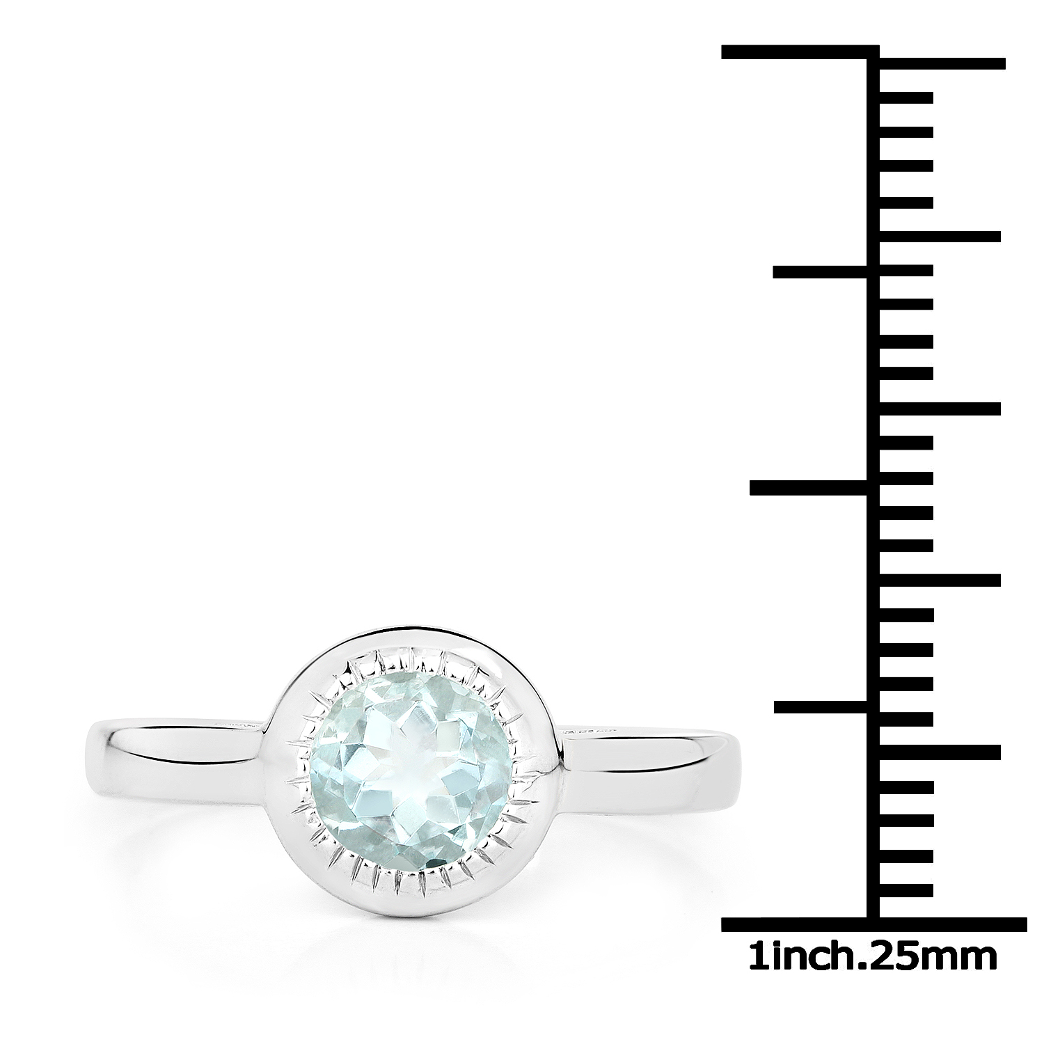 This sterling silver ring features a .75 carat round, genuine aquamarine that is bezel-set with a crimped frame. The 5mm pale, watery blue gemstone is supported and slightly raised on cathedral shoulders. The ring is protected with a tarnish-resistant rhodium finish. This aquamarine ring looks great alone, but also plays well with others, if you like stacking! The ring is US size 6. See sizing details and other information below. AdminCode: 98715/11-il