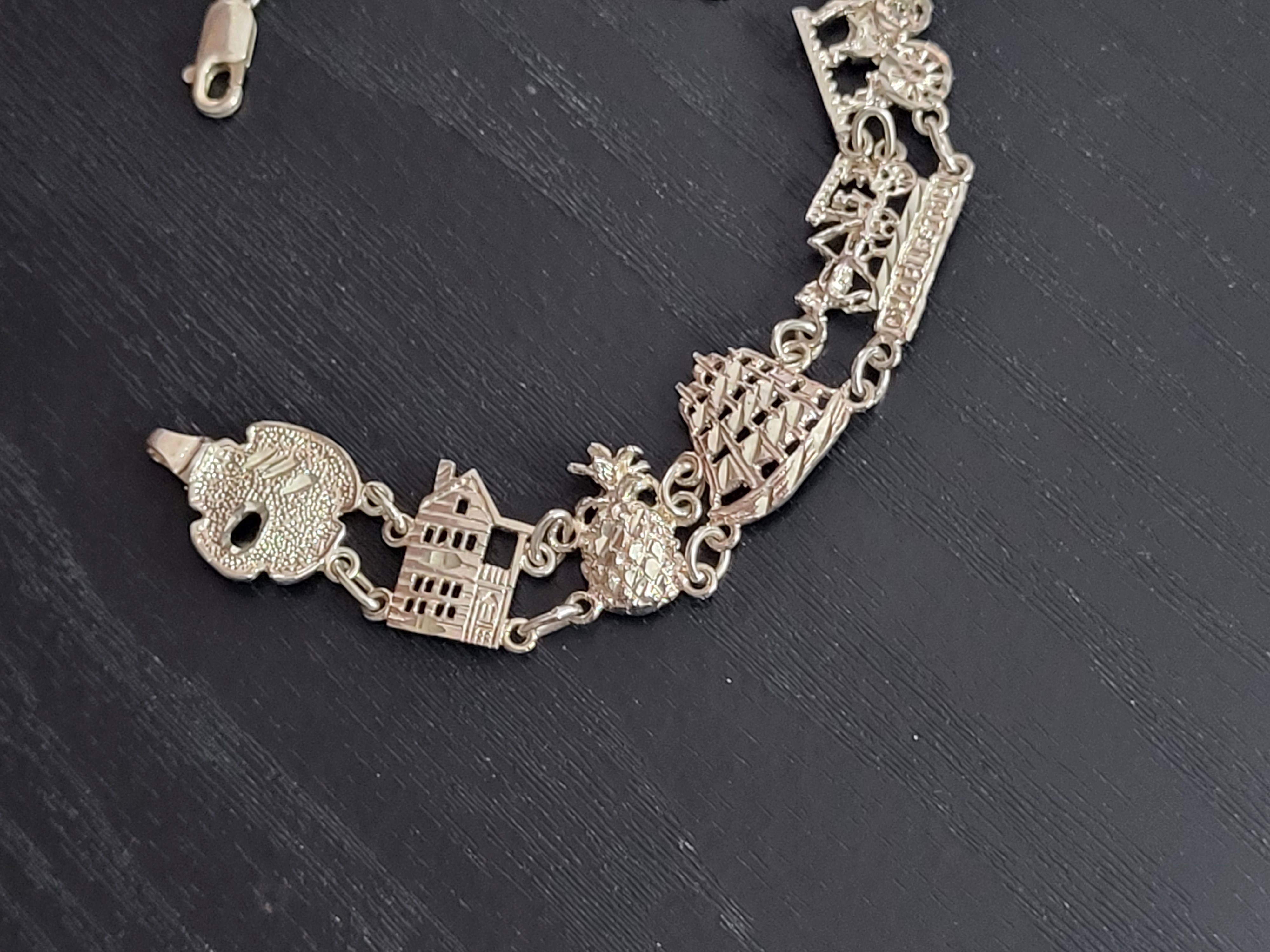 If you are from Charleston SC, or simply have wonderful memories of a visit to this historic southern city, this bracelet will be a fond reminder! Some of the things Charleston is best known for are represented on the individual links of this bracelet. It is 7" long with a lobster clasp. 15 grams. Admin: 33121/5-bg