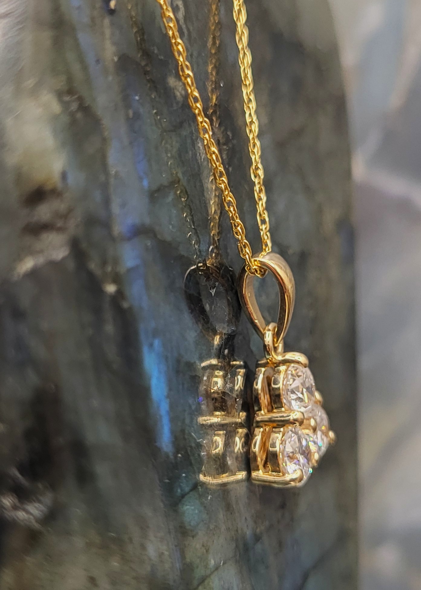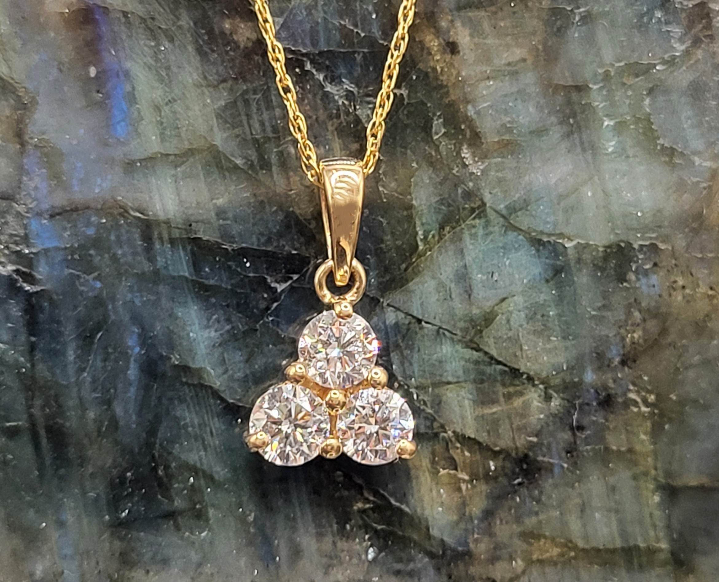 This 14 karat yellow gold necklace features three beautiful lab-grown diamonds in a trefoil design. The .75 carats of round, brilliant-cut, colorless, VS clarity, lab-grown diamonds are prong-set and suspended from a solid bail attached to an affixed ring at the top of the trefoil, in a ‘doorknocker’ style. The necklace includes a 14K yellow gold, 18" fine rope chain with a lobster clasp, but the bail can accommodate up to a 2mm chain. Admin: Q5743/30-ieo