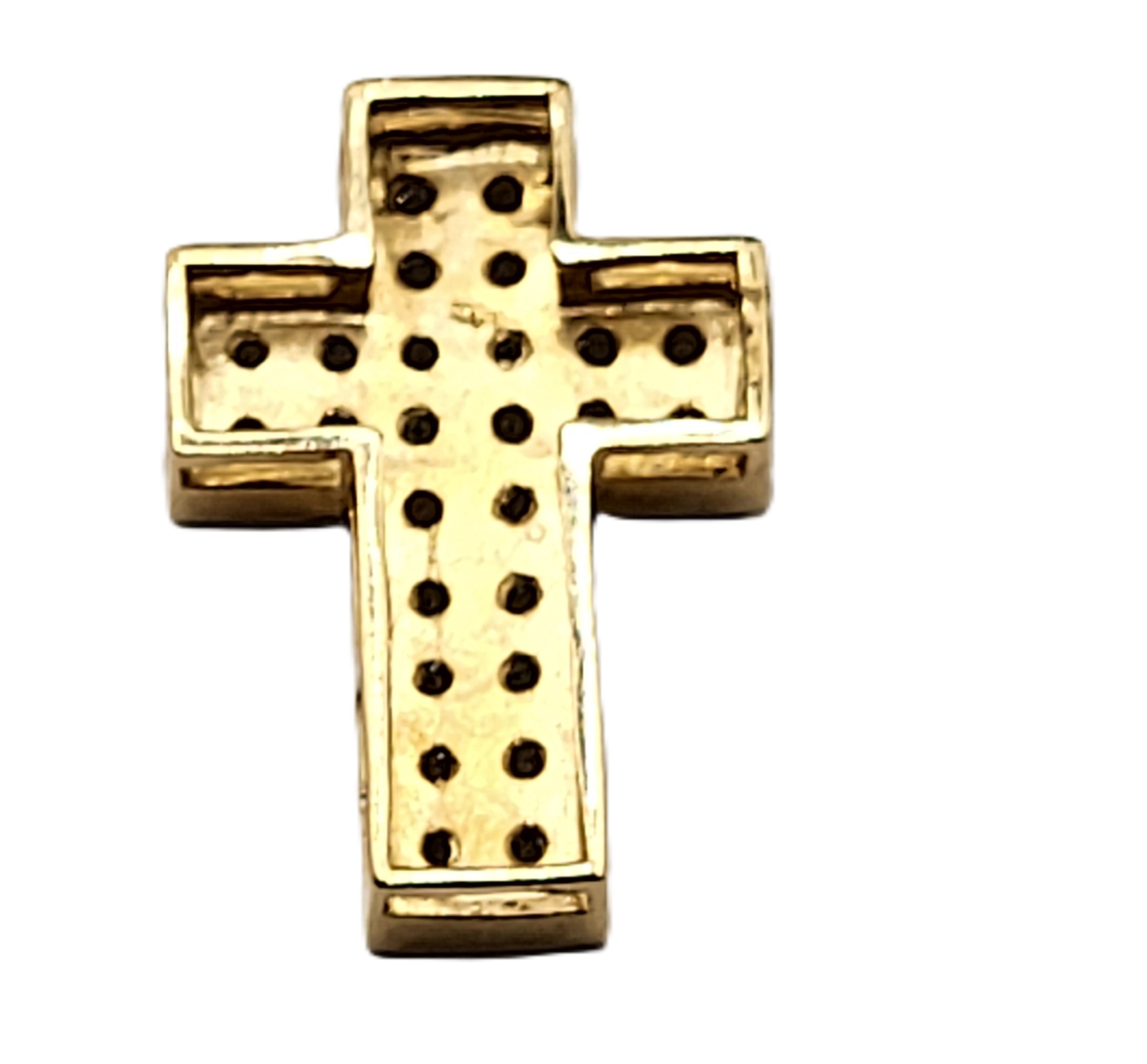 This glittering pendant has a slide-style bail with an approximate 2.2mm opening. This is a 14 karat yellow gold religious pendant that is set with nearly a carat (.99 carats total weight) of round, brilliant, I color, SI2- I1 clarity diamonds. The pendant is approximately 1"L x 5/8"W x 2.25mm thick. Read below for other important information. Admin: G11241/18tt