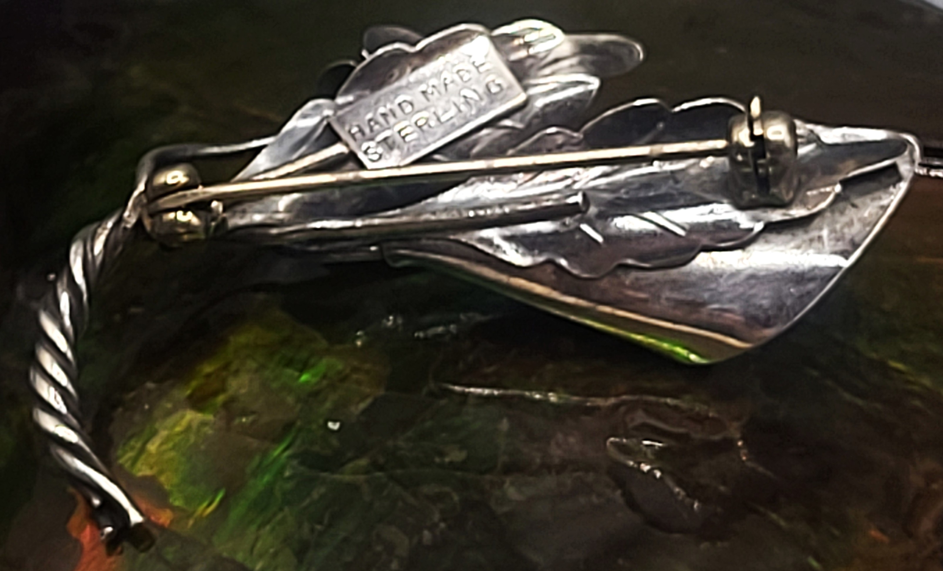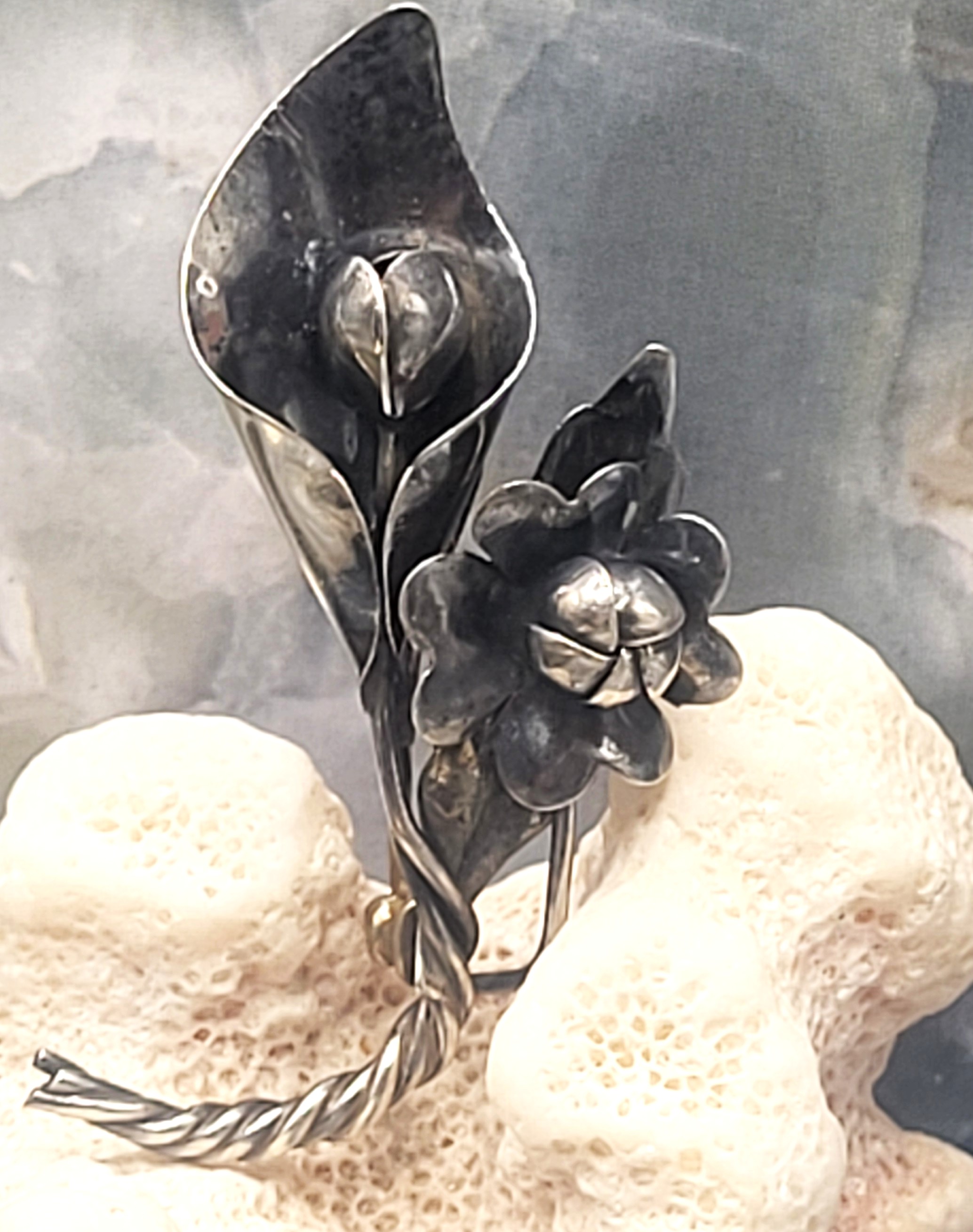 This vintage sterling silver brooch, pin is a work of art, as well as a piece of fine jewelry. The twisted stems end in a curve resembling the letter "J". Fine sheets of sterling silver are cut into heart-shaped flower petals, and are curved into the budding centers. Even the backs of the flowers are etched with incredible detail of tendrils and venations. The brooch is approximately 1" long and has a locking "C" clasp.