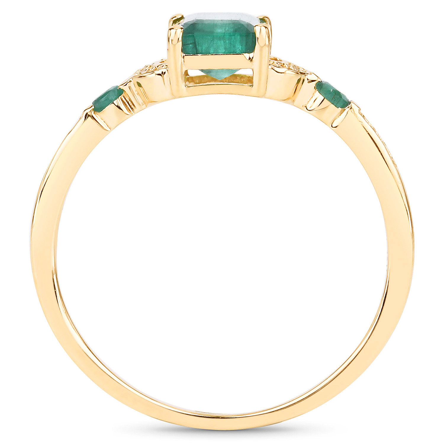 This 14 karat yellow gold ring features a 7x5mm, octagon-cut, Zambian-mined, genuine emerald. The .93 carat emerald is prong-set on stirrup-like shoulders that taper to the shank and glitters with .04 carats total weight of channel-set, H-I color, I1 clarity, round, brilliant-cut accent diamonds. A .05 carat round, faceted, tension-mounted emerald adorns each shoulder to make this ring ‘pop’. The ring is US size 7. Sizing options and other information provided below. AdminCode: NQnis/nbp
