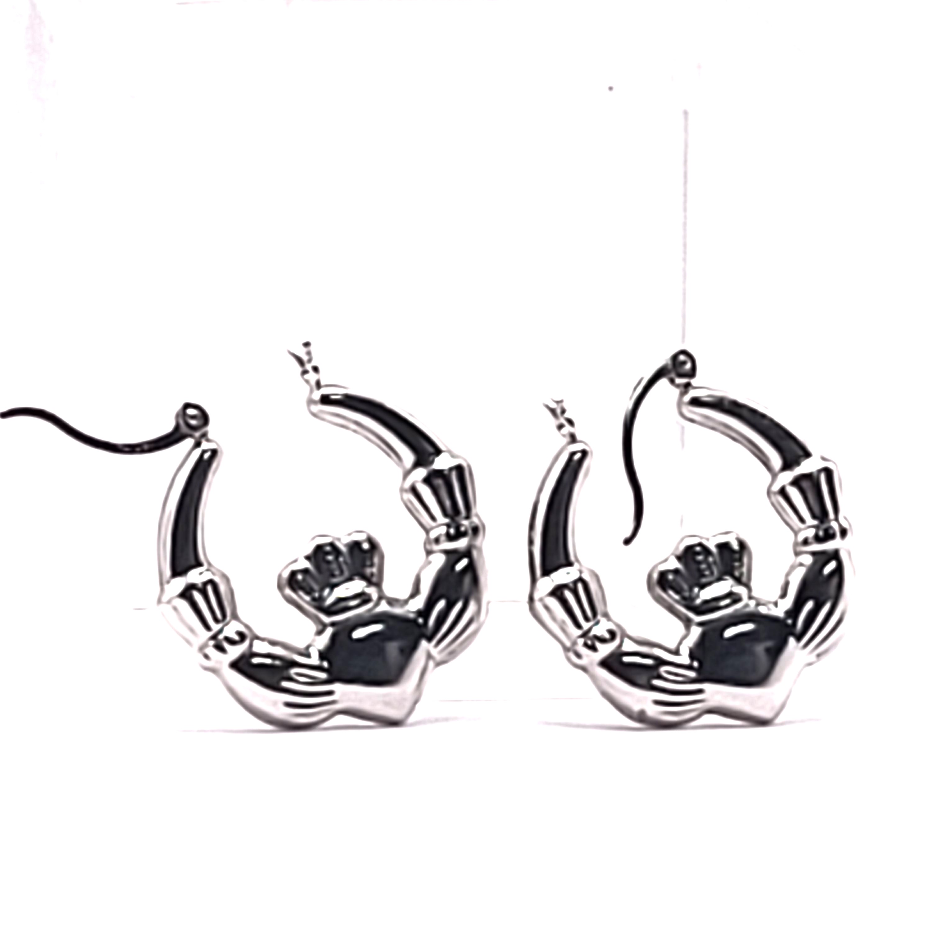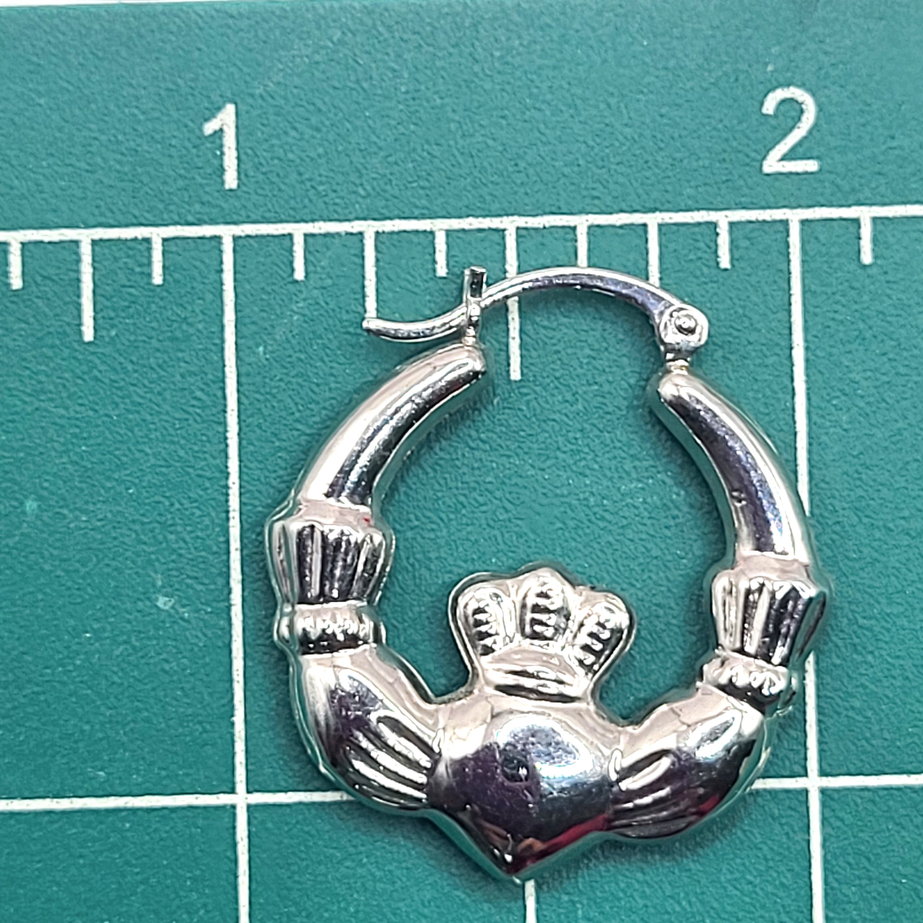 The claddagh is worldwide recognized symbol of love that originated in Ireland nearly 500 years ago! (Read more about the claddagh below.) These 14 karat white gold hoop earrings are designed as "Claddagh" symbol and have hinged bar closures. They are approximately 1" diameter and weigh 2.87 grams total (about 1 1/2 grams each) for a light, comfortable wear. They attach to the earlobe with a hinged posts and a built-in snap lock back Admin: 33110/27ea