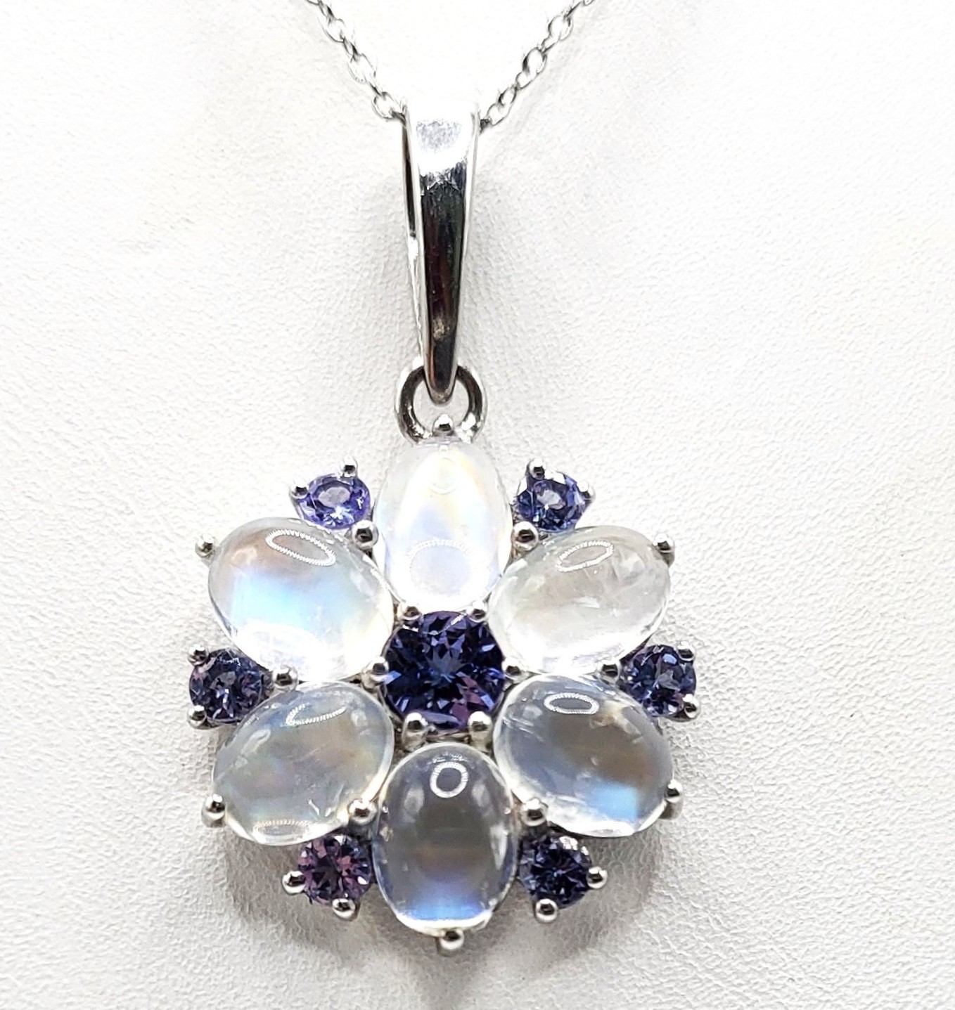 . – #RainbowMoonstone #TanzaniteJewelry #SterlingSilverPendant #GemstoneNecklace #MoonstoneMagic #TanzaniteGlow #FloralJewelry Atomic13Auction #SpectralBloom #JewelryWithStory #BidFairExclusive #MysticGemstones #HandcraftedElegance #MoonstoneAndTanzanite #JewelryCollectorsDream.#JuneBIrthstone