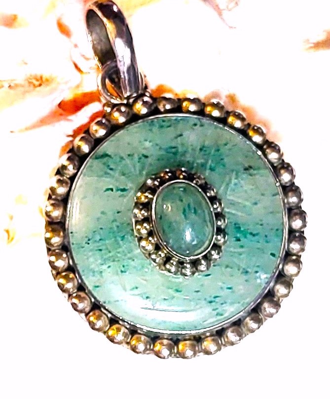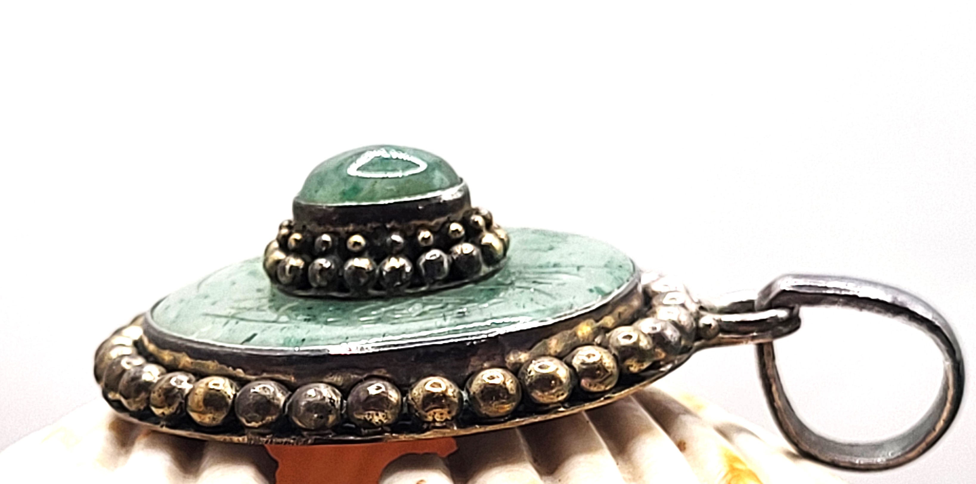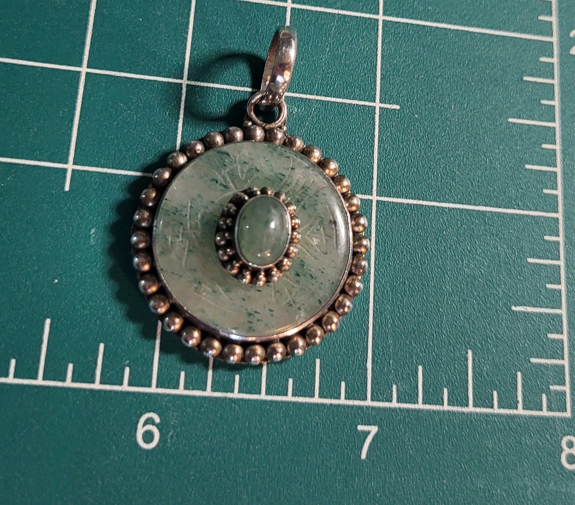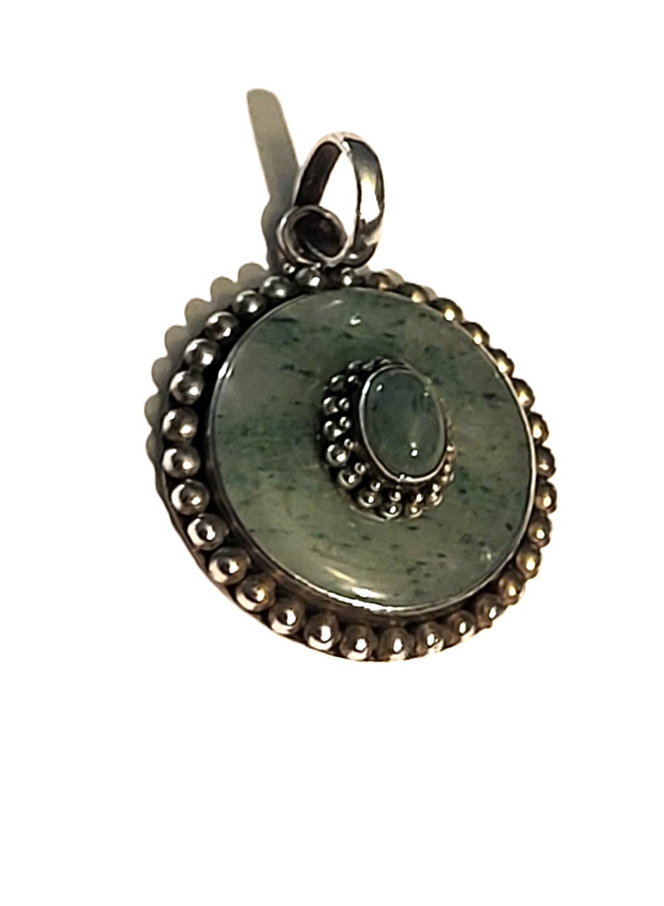 This is a vintage sterling silver pendant (circa 1960’s) that features an oval-shaped, cabochon jadeite stone that measures 7x5mm and has a double beaded frame that is centered inside a round pi stone-like disc set in a smooth bezel with a beaded border. The ‘pi stone’ jadeite is carved with symbols resembling Asian letters in 6 stations around the front face.. The bail is approximately 7.6mm and attached to an affixed ring at the top of the pendant. The back of the pendant is a flat, sterling silver disc with a die struck "925". The entire pendant is approximately 1.5" in diameter.  Admin Code: 7277-1/12