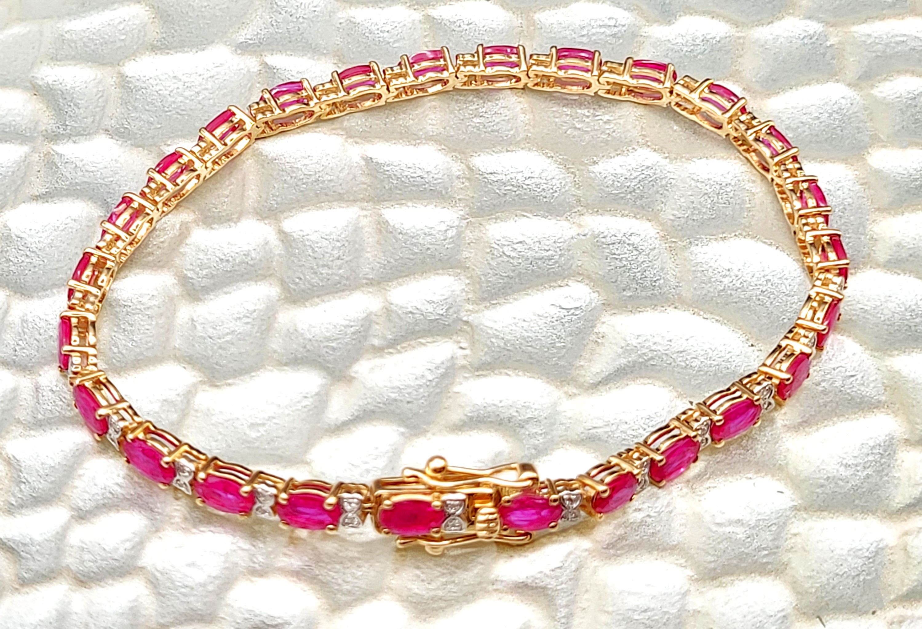This 14 karat yellow gold bracelet contains over 5.00 carats of genuine, oval-cut rubies and each ruby represents an individual link. The links are separated by diamond-accentuated bow-tie shaped hinge covers. That means this bracelet has 5.87 carats of precious gemstones when you sum up the 5.72 carats total weight of rubies and the .15 carats total weight of round, faceted H-I color, I1 clarity diamonds! The bracelet is 7" long and has a hidden box clasp with 2 figure-eight safety clips. Admin: Q5743/31-bigr
