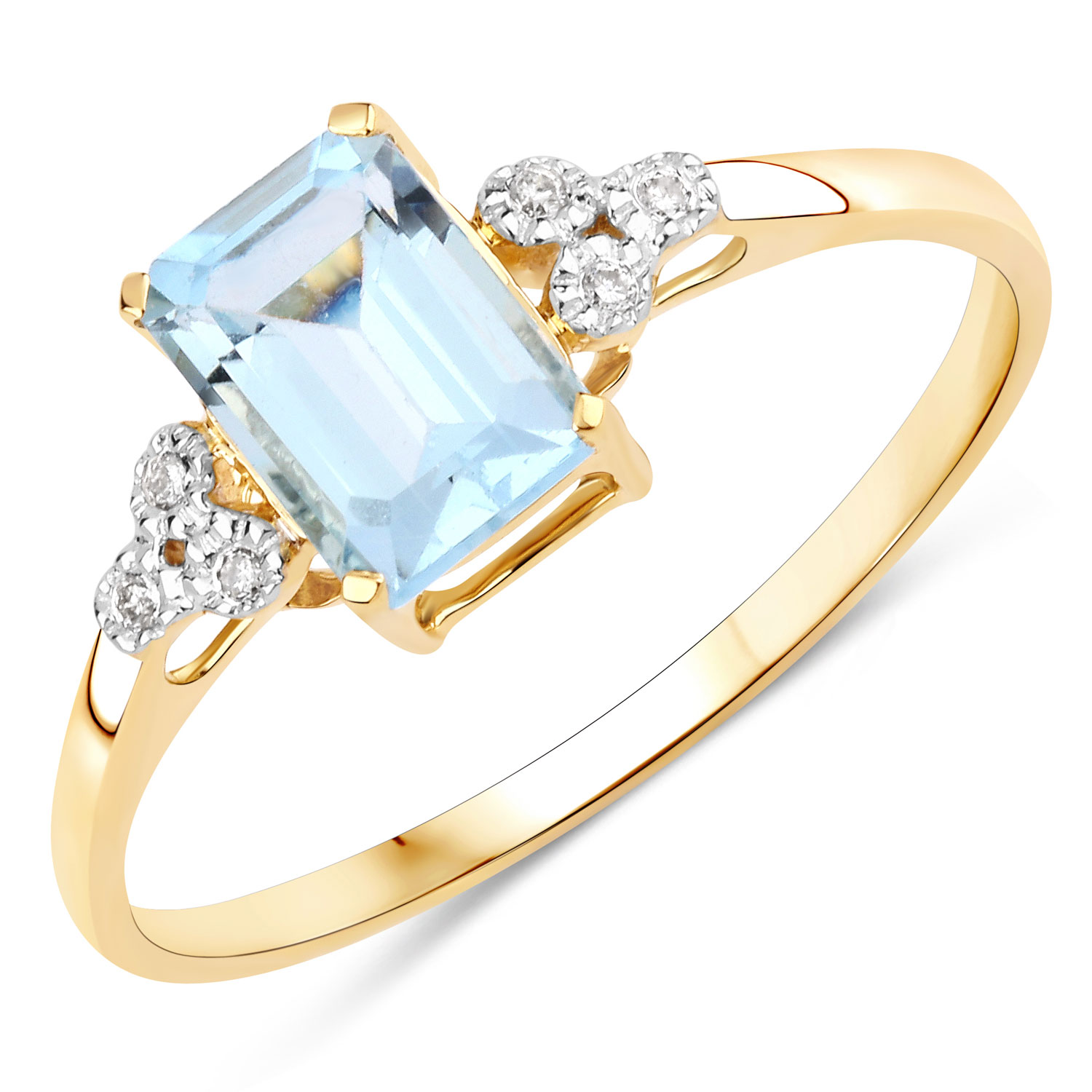 This 14 karat yellow gold ring features a .80 carat octagon-cut, genuine aquamarine that is prong-set between clusters of genuine, Earth-mined, faceted, accent diamonds totaling .03 carats. The smooth shoulders taper to an approximate 1.7mm shank and the ring is US size 7. See sizing options and other information below. AdminCode: NQnis2/igp