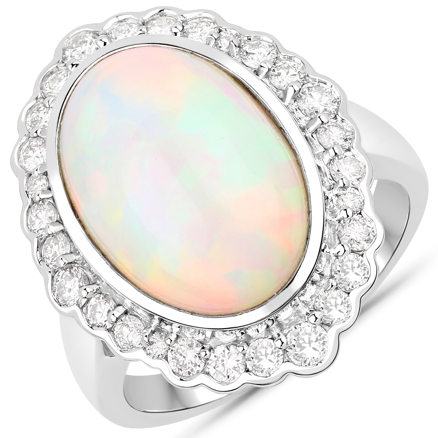 This 14 karat white gold ring stands out with a 5.68 carat oval cabochon, genuine Ethiopian opal. The 15.50×10.55mm gemstone is bezel-set in a scalloped halo of .70 carats total weight round, brilliant-cut, H-I color, SI2 clarity diamonds. The wide, polished white gold shoulders and ornate undergallery support this queen of gemstones and the ring is US size 7. This ring can be sized by your trusted local jeweler. See other auction information below. AdminCode: NQnis/libl