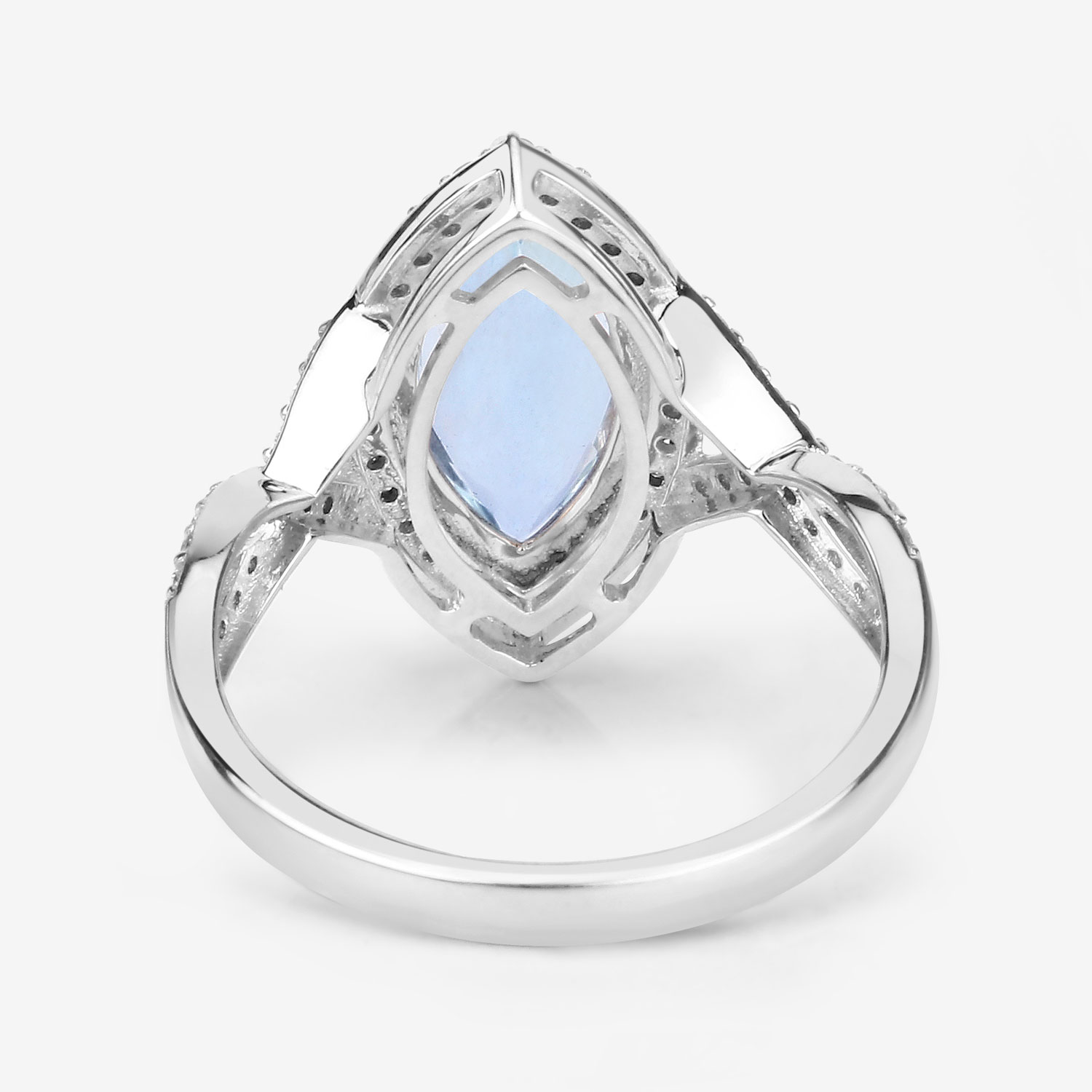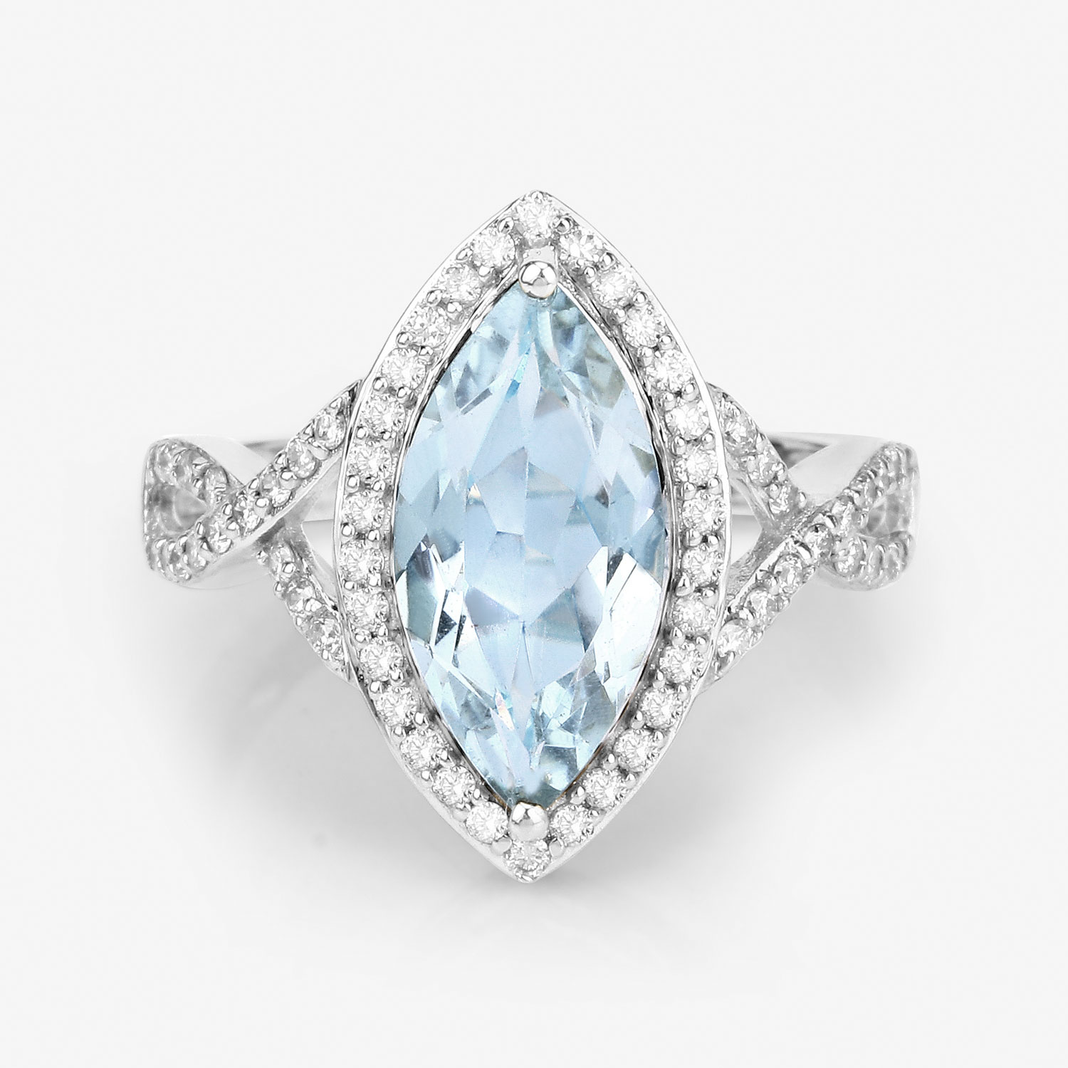 This 14 karat white gold ring features a 1.84 carat, marquise-cut, genuine aquamarine. The 14x7mm aquamarine is prong-set between crossed shoulders wilth .40 carats total weight of round, brilliant-cut, H-I color, I1 clarity diamonds that flow into the channel-set sparkling halo. The ring is US size 7. See sizing options and other information below. AdminCode: NQnis/biln2