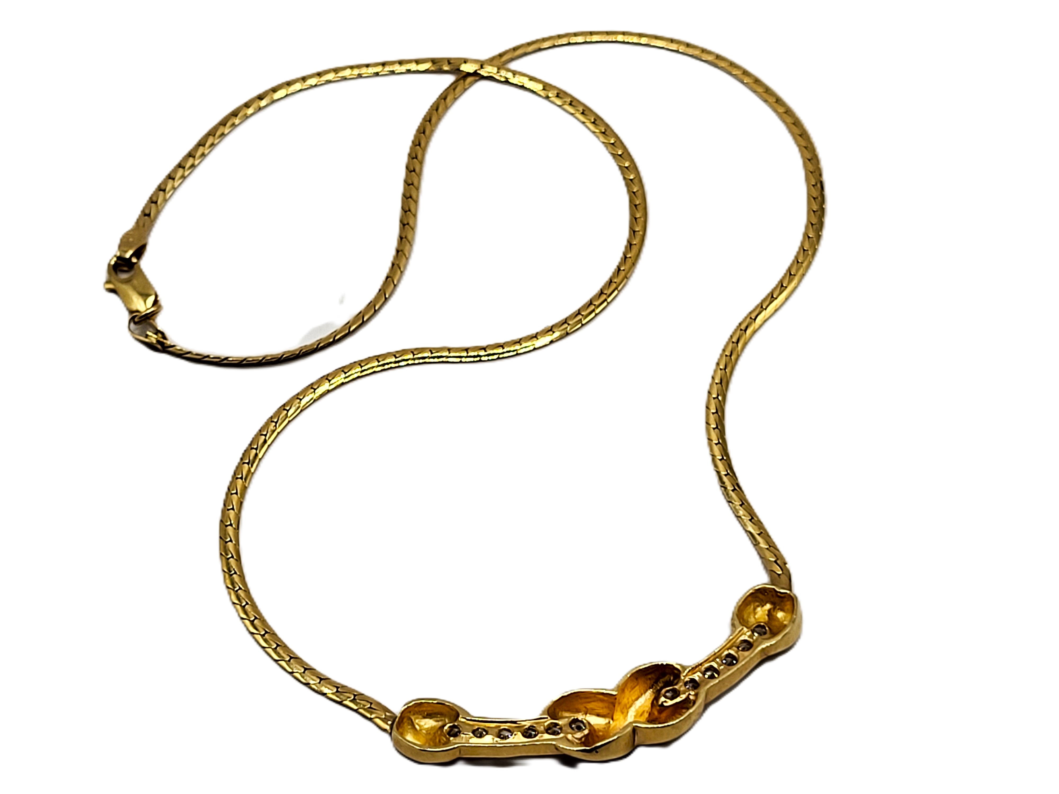 This is a very elegant 14 karat yellow gold necklace that features .66 carats total weight round, brilliant-cut, G-H color, SI2-I1 clarity diamonds along the curved bar with the "X" kiss. The bar is stationary/static on the flat cobra chain. The entire necklace is 17" long with a spring ring. . Admin: G11241/12tit