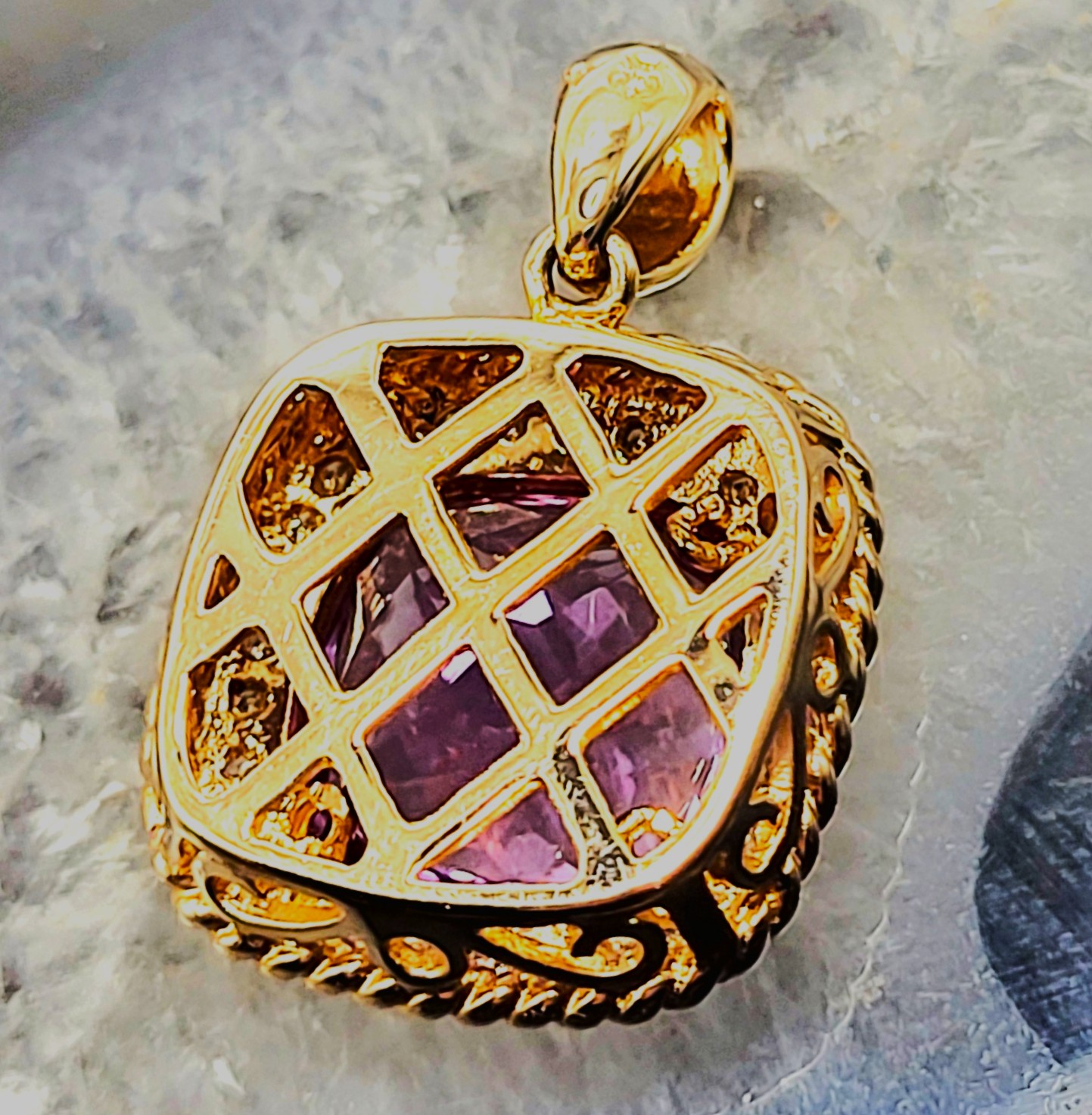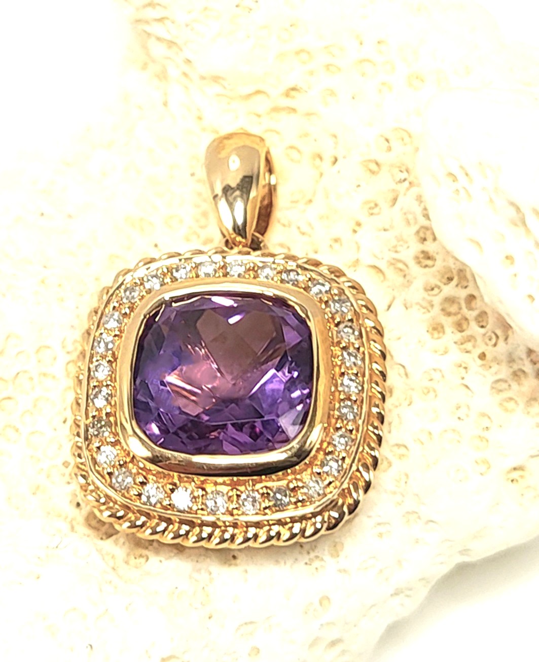 This is a 14 karat yellow gold pendant that features a 3.25 carat cushion-cut, bezel-set, genuine Brazilian amethyst with .16 carats total weight, H-I color, SI2-I1 clarity diamonds in the floating halo. The pendant is 3/4" diameter and has a solid bail that can accommodate up to an approximate 3.25mm chain,