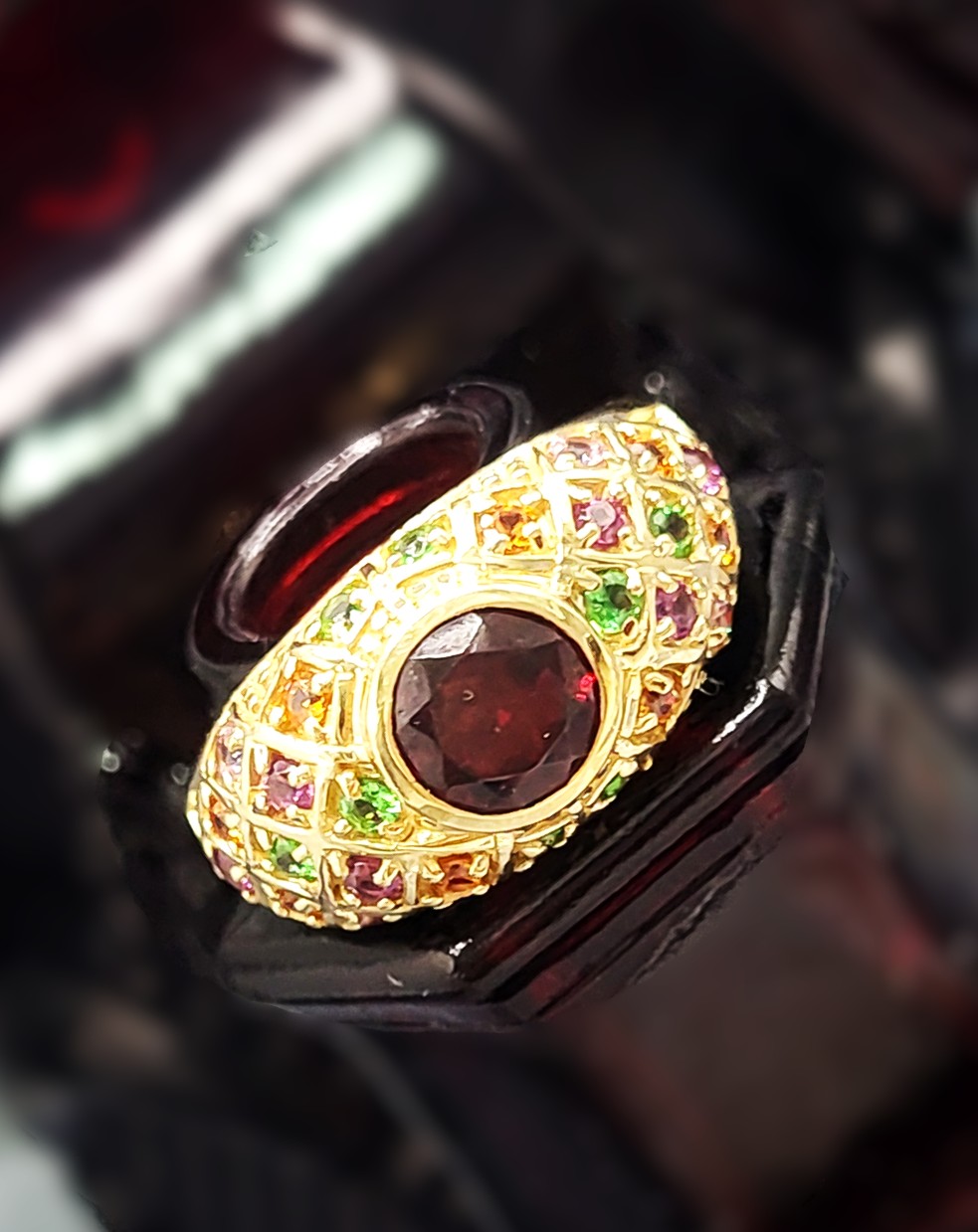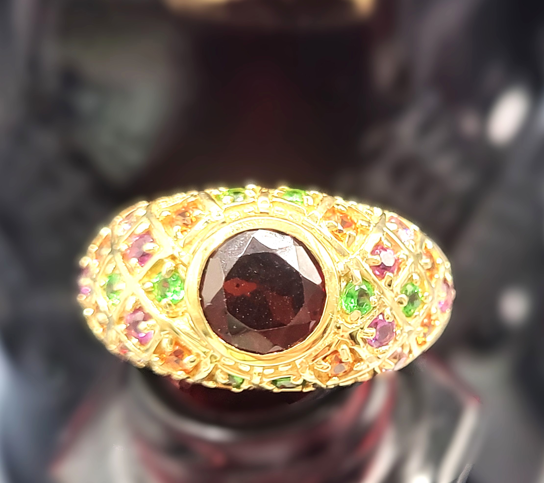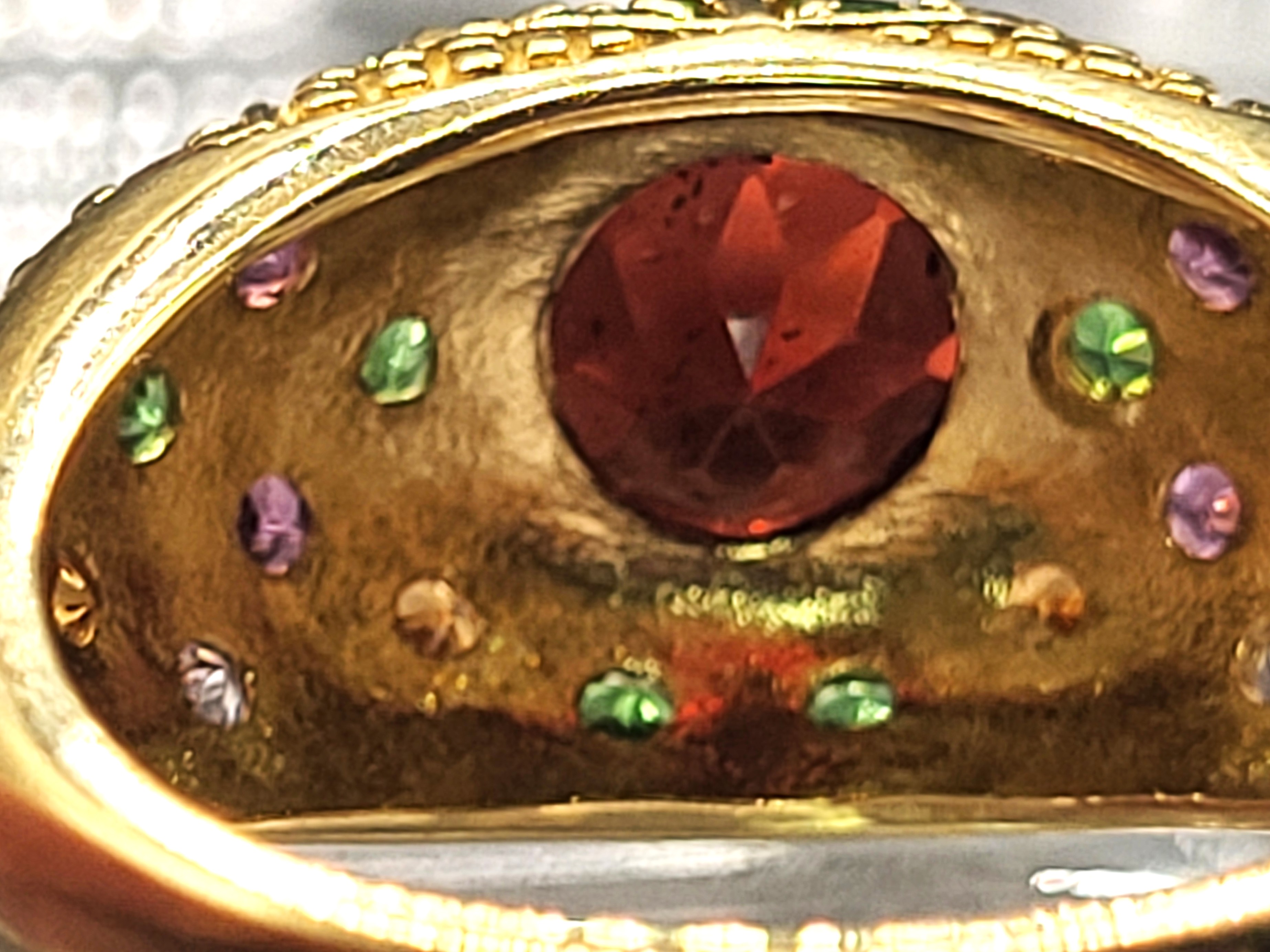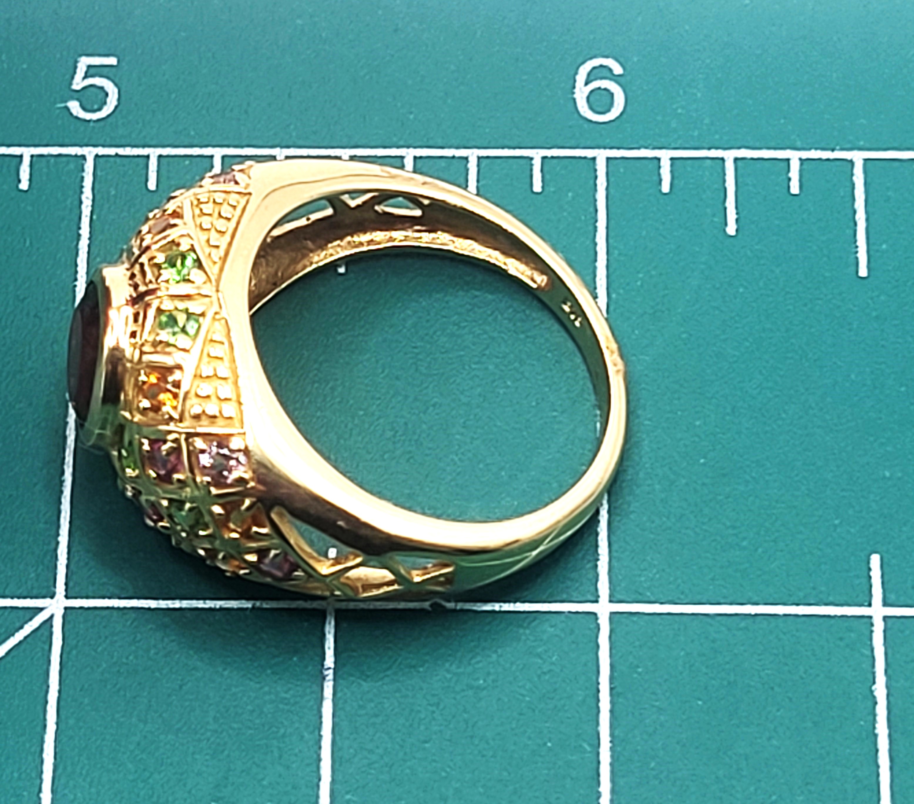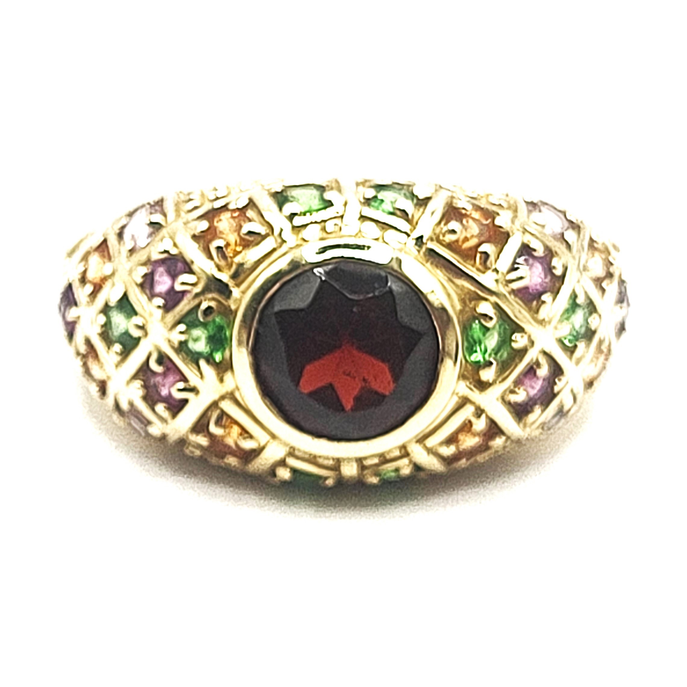 This 14 karat yellow gold features an approximate 1.30 carat round, faceted, genuine red garnet, also possibly Pyrope, that is bezel-set with an approximate 1.00 carat total weight of pink, green, purple, and golden gemstones set along the bridge and shoulders in geometric designs with bead accents. This ring is US size 8 and can be sized for an additional charge. . Admin:33110/26lrr