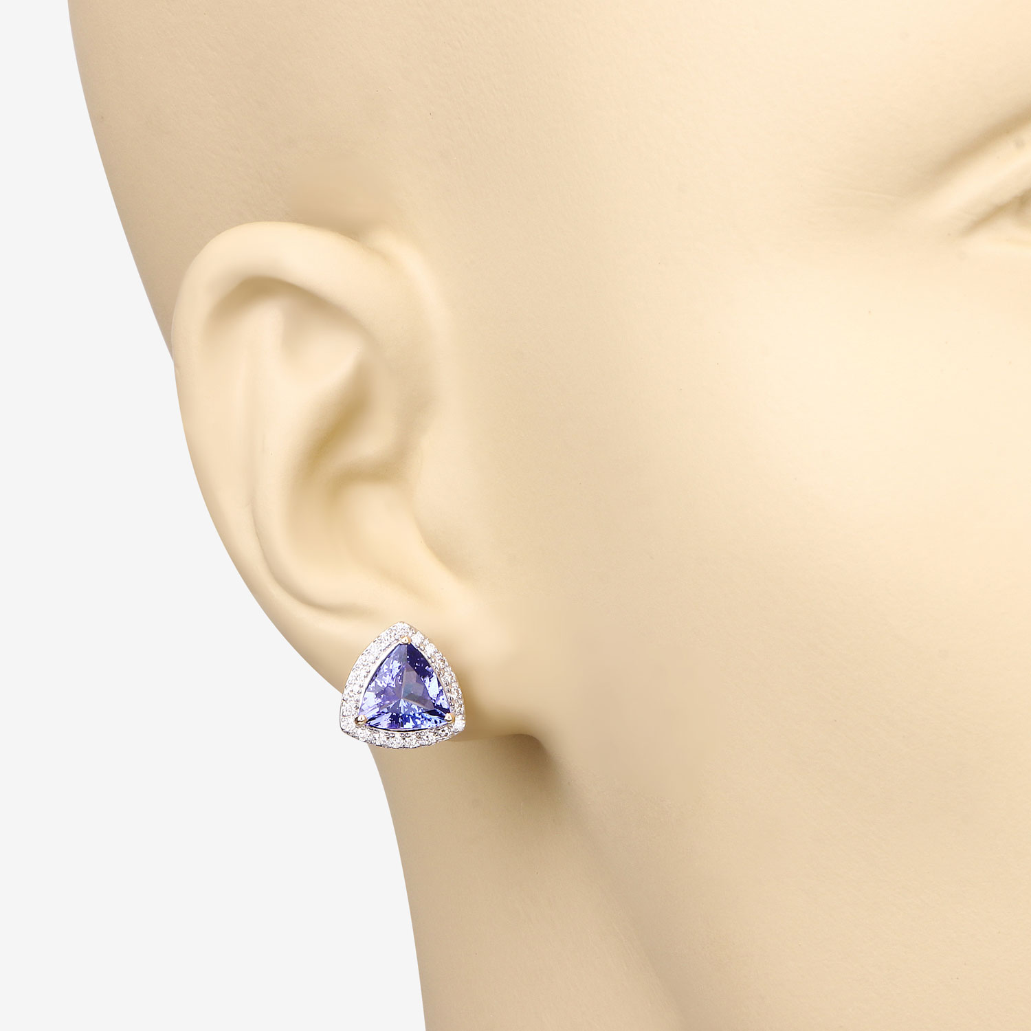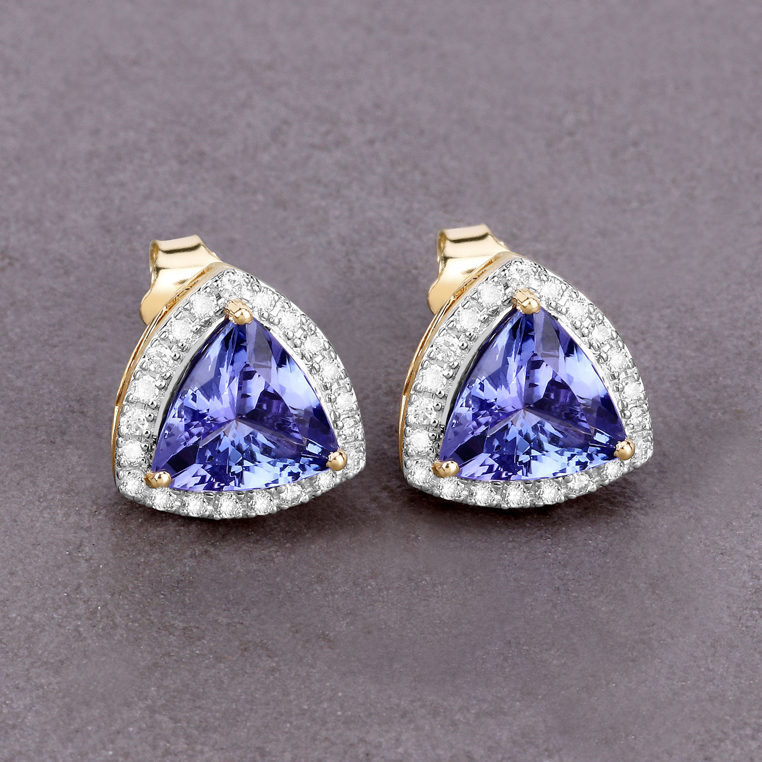 These elegant stud earrings feature 3.48 ctw of natural trillion‑cut tanzanites, glowing in a vivid violet hue. Each 8mm stone is prong‑set in 14K yellow gold and framed in halos comprised of 0.34 ctw (H–I color), adding bright, balanced sparkle. The earrings measure 11.43mm across and attach to the earlobes with comfortable posts‑and‑friction backs. A refined, feminine design perfect for December birthdays or anyone who loves the rare beauty of tanzanite.These elegant stud earrings feature 3.48 ctw of natural trillion‑cut tanzanites, glowing in a vivid violet hue. AdminCode: NQnis/bego8