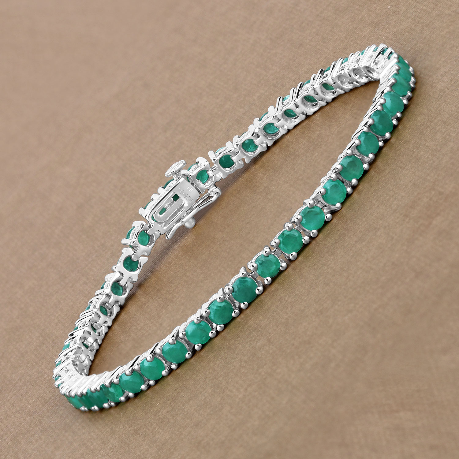 This sterling silver bracelet showcases 7.48 carats of round, faceted, genuine emeralds. These 3.5mm precious gemstones are prong-set in a straight line and the set gemstones are connected by hinges for flexibility. The bracelet is protected with a brilliant rhodium finish. See below for other information. AdminCode: NQnisllg/6