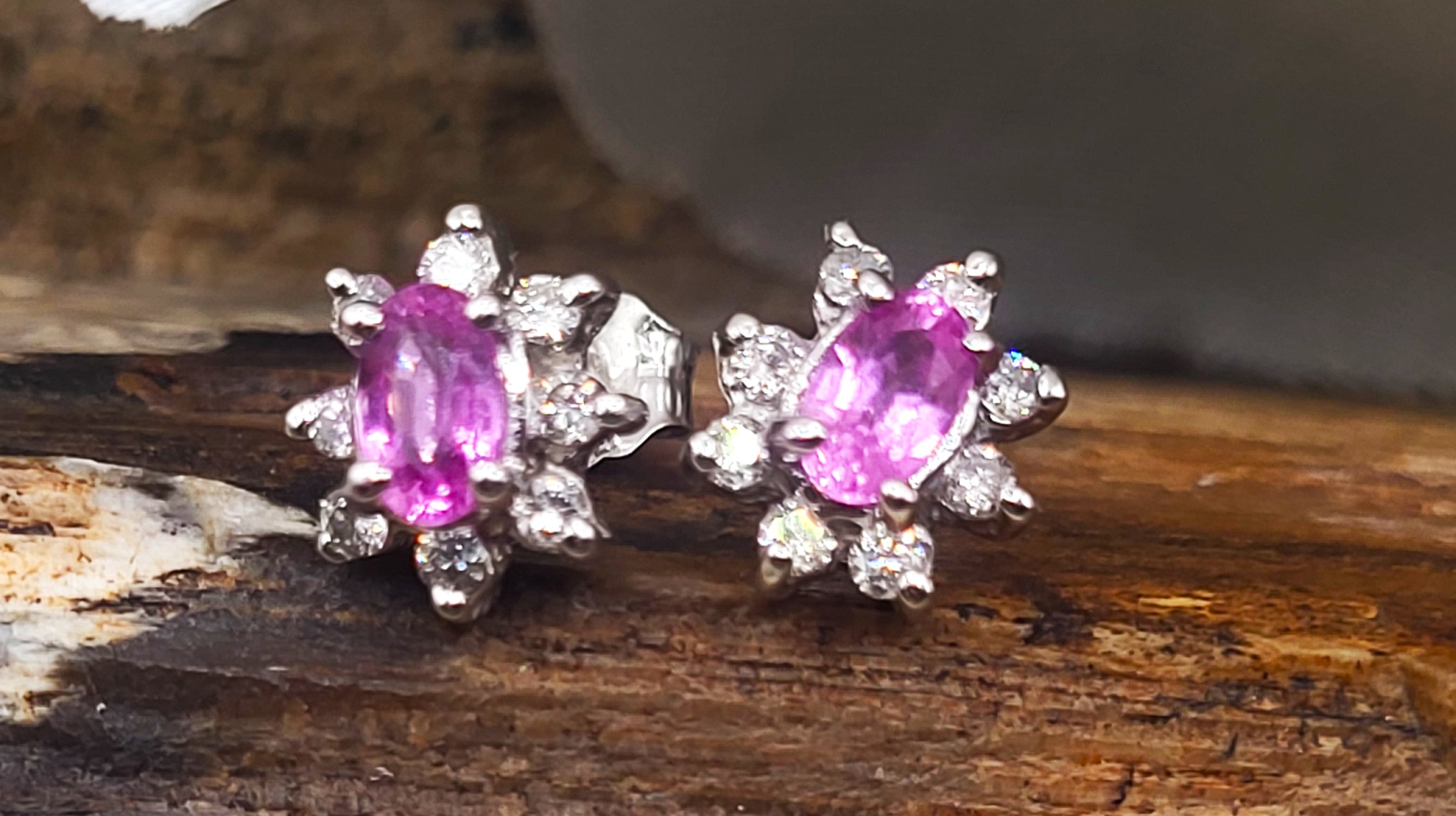 This is a pair of 14 karat white gold earrings that feature .66 carats total weight of oval-cut, prong-set, genuine pink sapphires and .27 carats of round, brilliant-cut, H, SI2-I1 clarity diamonds in the halos. Dainty demeanor with super sapphire shine! The earrings attach to the earlobe with posts and friction backs. Admin: G11241/11ior