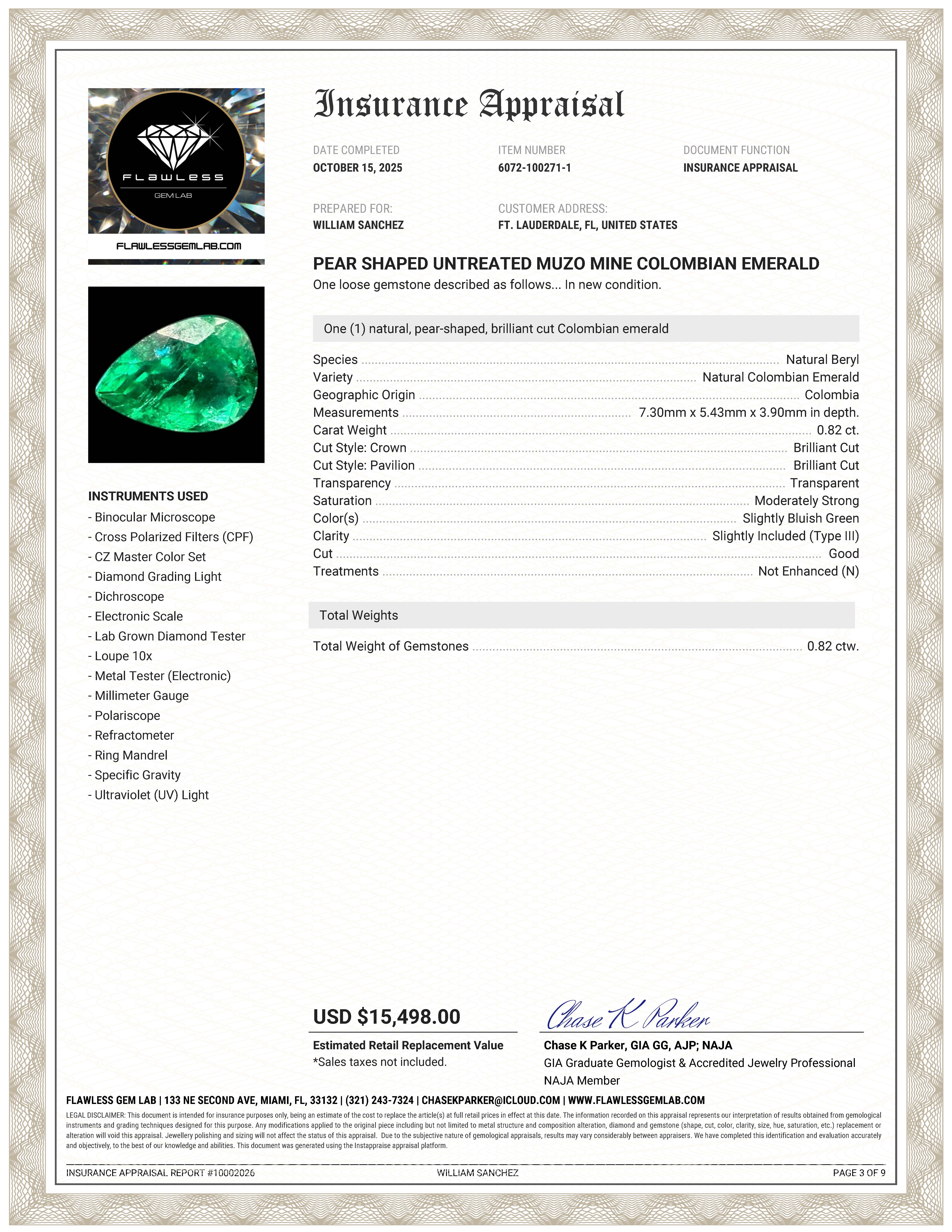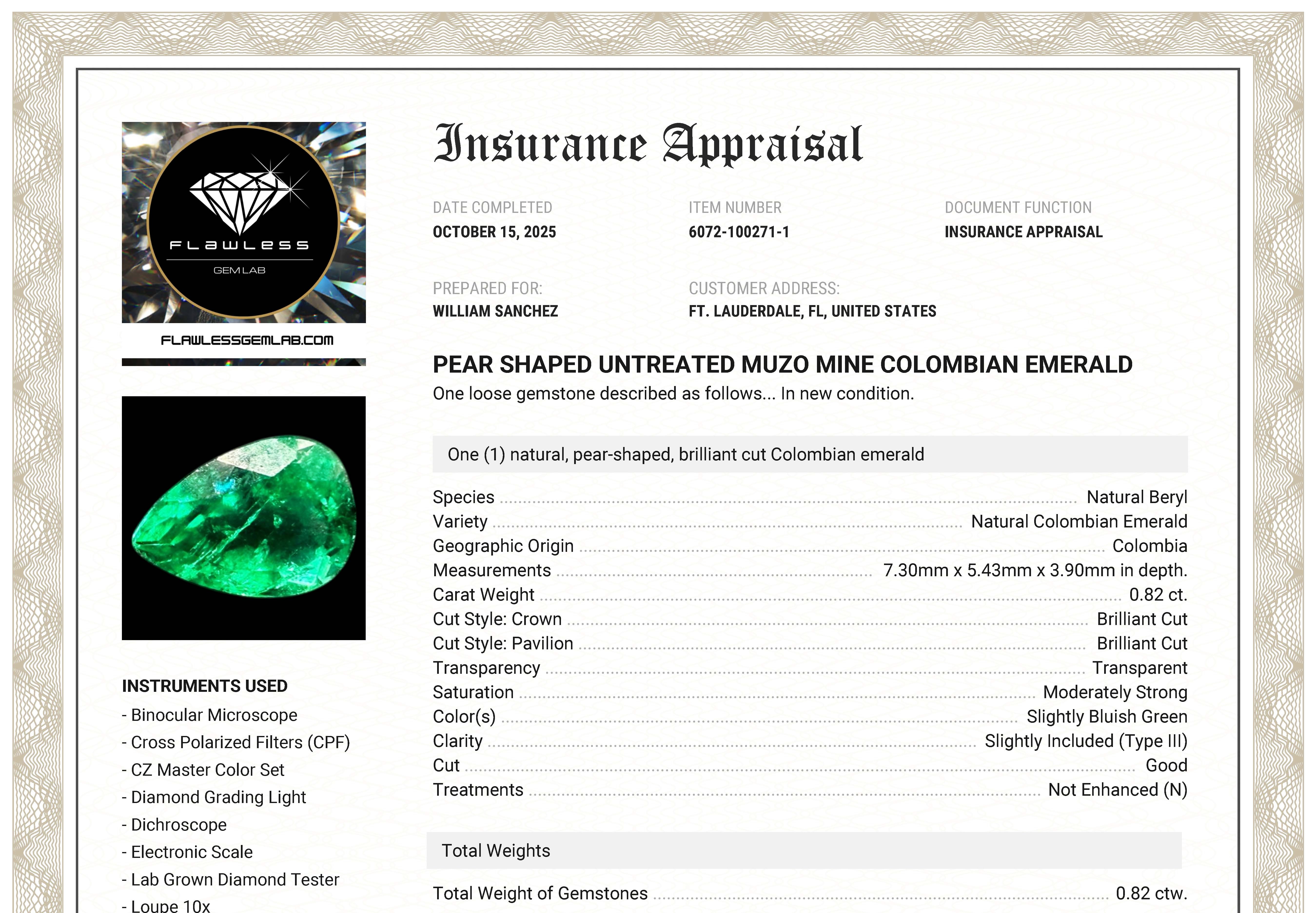 Accompanied by a gemological certificate from the Instituto Colombiano de Gemología, noting Colombian origin and Muzo-related characteristics. An additional insurance appraisal is also included for reference. Suitable for custom jewelry design or for collectors seeking Colombian emerald material. AdminCode: SvCKP/