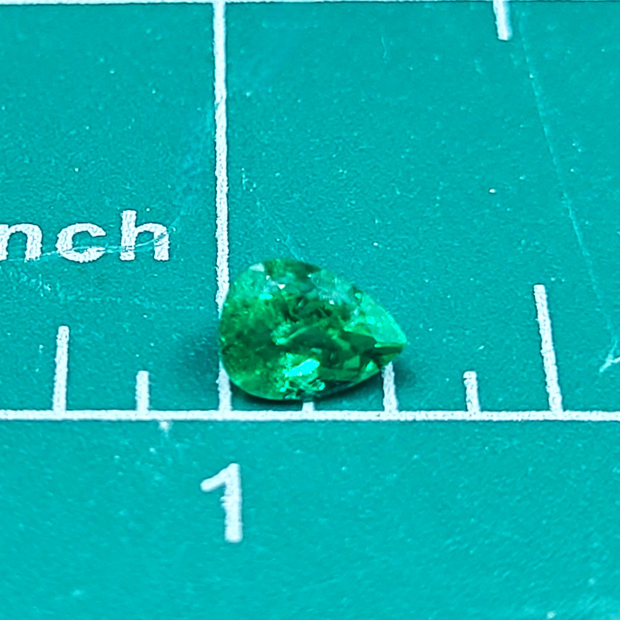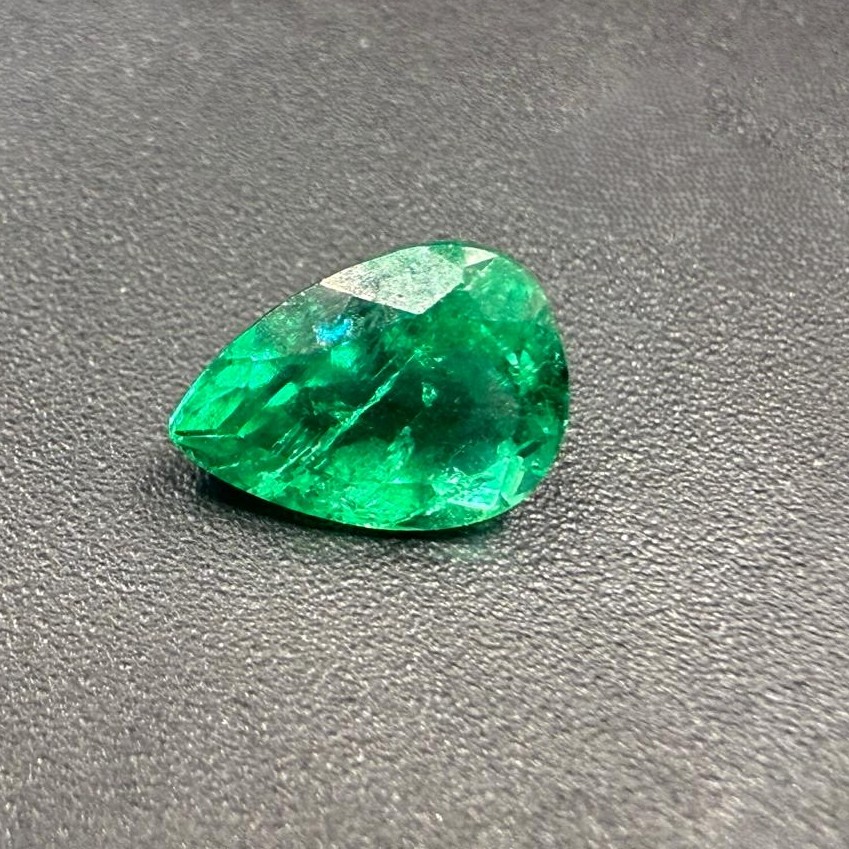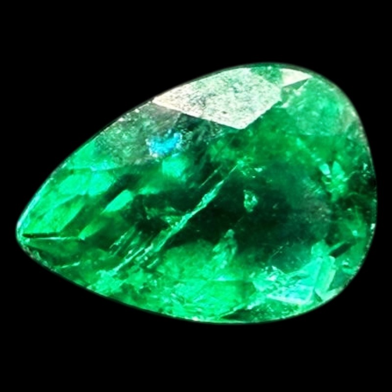 This gemstone displays a vivid green color and transparent appearance, with characteristics consistent with emeralds from the Muzo formation. As is typical for natural emeralds (Type III), internal inclusions may be present and are part of the stone’s natural formation. The stone is reported as having no indications of clarity enhancement and features a faceted pear cut, measuring approximately 7.29 x 5.50 x 3.89 mm, offering a well-balanced and attractive shape.