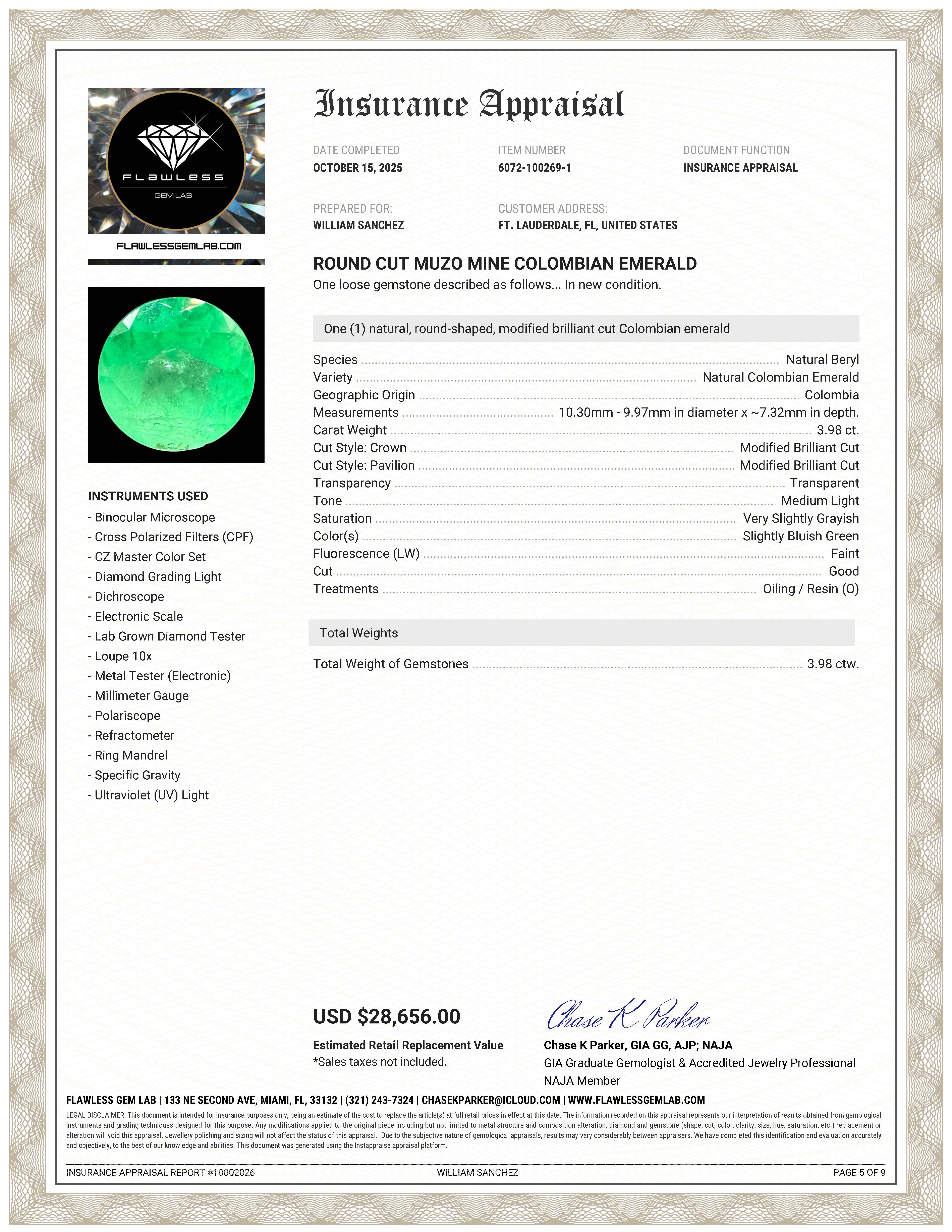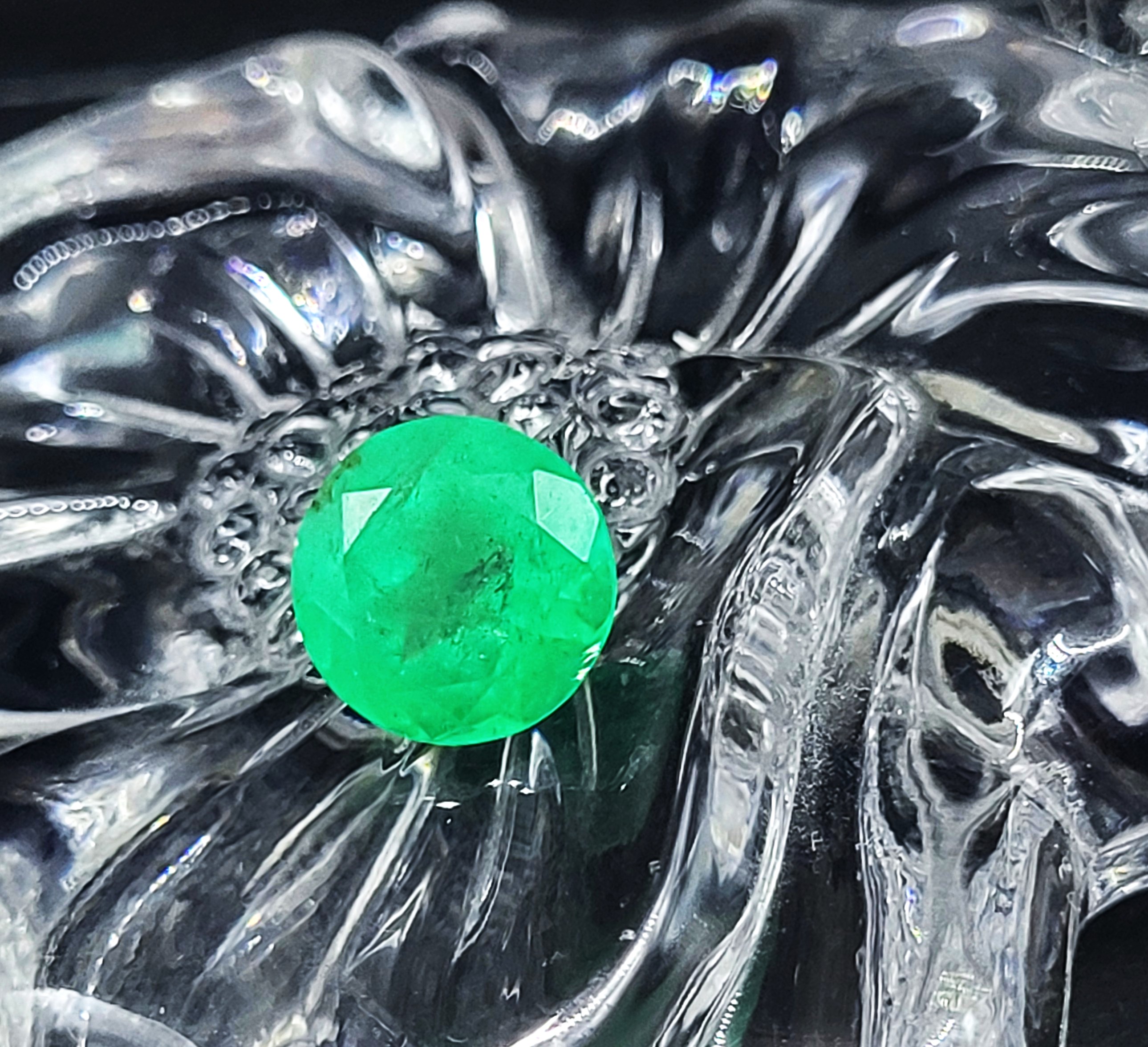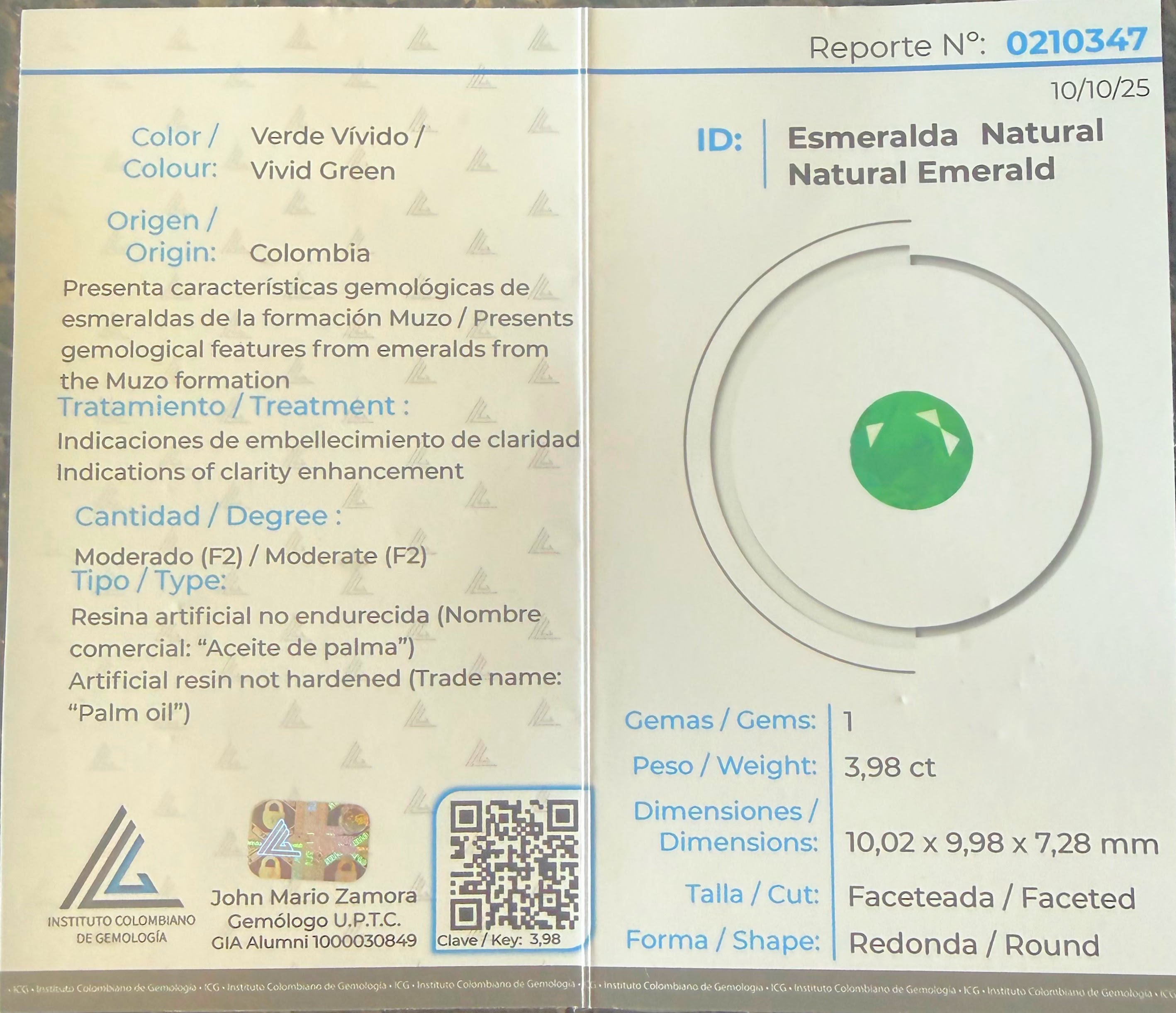 The stone features a round, brilliant cut with approximate measurements of 10.30 x9.97 x7.32mm, offering a well-proportioned and desirable shape for fine jewelry design. Treatment is reported as oil/resin, which is a commonly accepted practice in emeralds. The gemstone is accompanied by a gemological certificate from the Instituto Colombiano de Gemología noting Colombian origin and Muzo-related characteristics. An insurance appraisal will be updated to reflect the correct weight. Suitable for custom jewelry design or for collectors seeking larger Colombian emerald material. AdminCode: SvCKP/