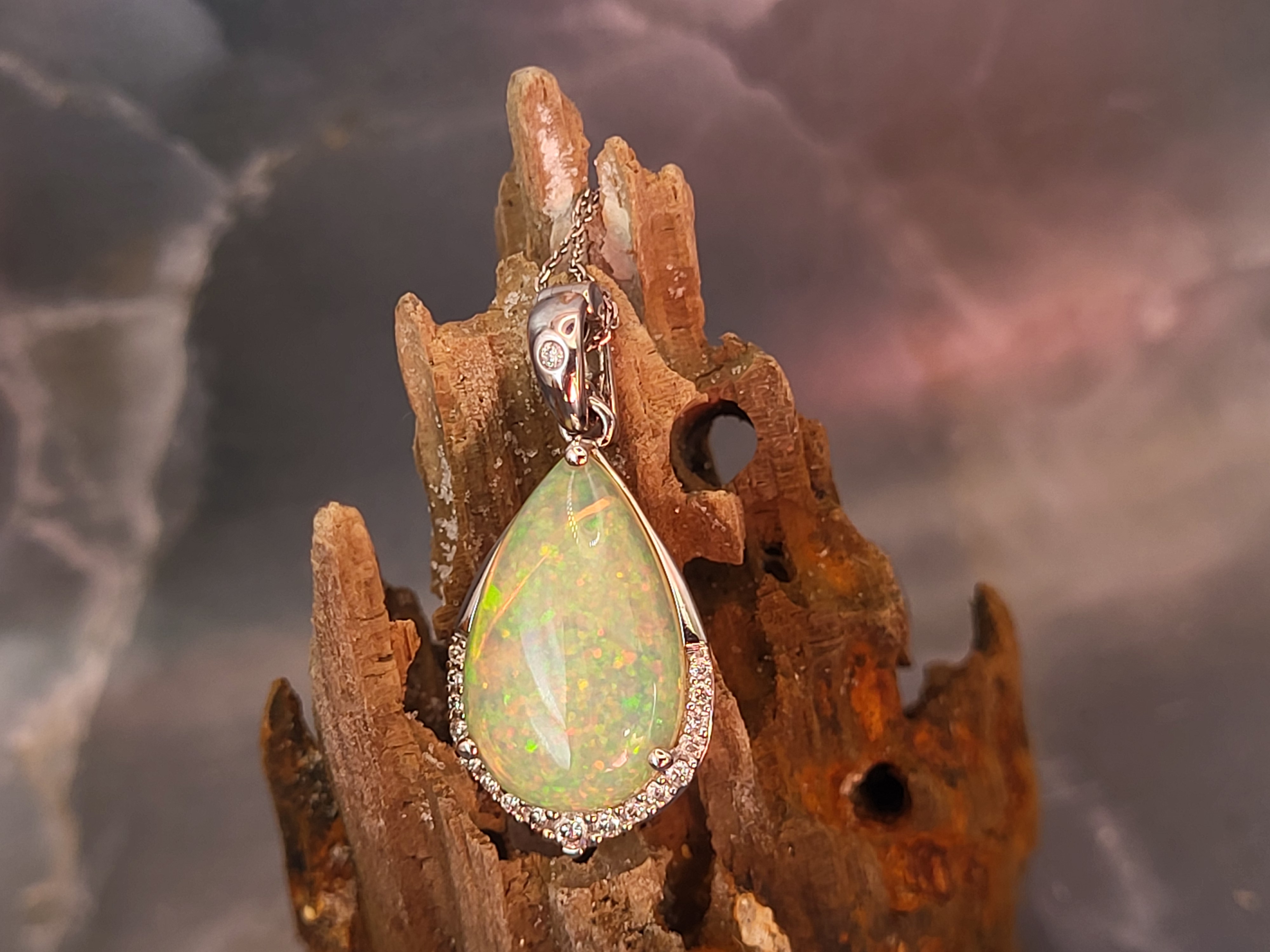 #OpalFire #DiamondAccent #PearShapedOpal #FineJewelry #LuxuryNecklace #14KGold #BidFairTreasures #CollectorElegance