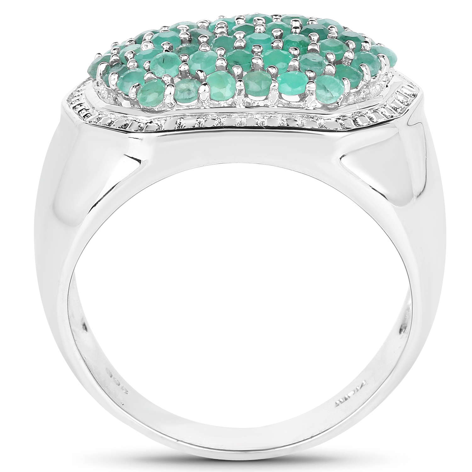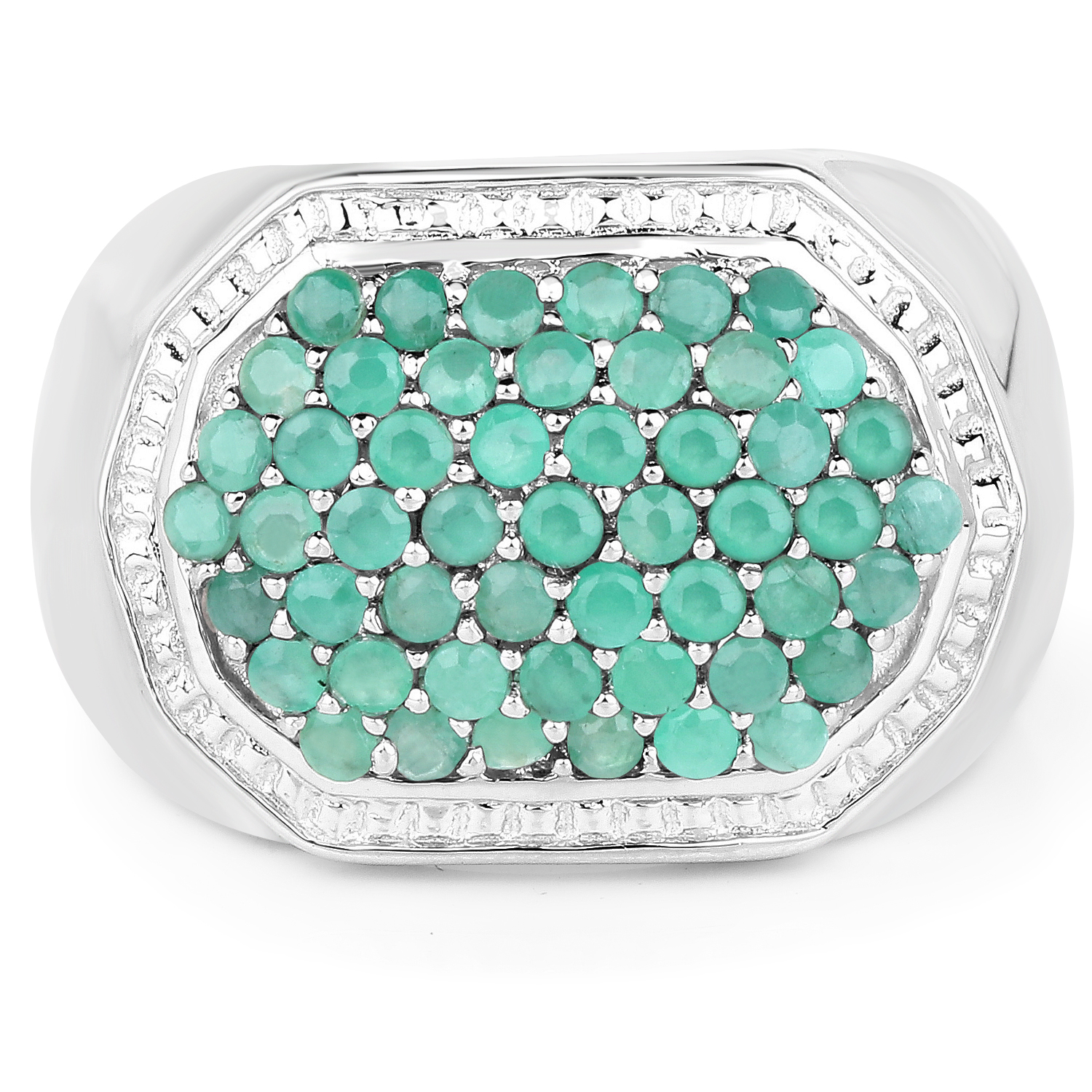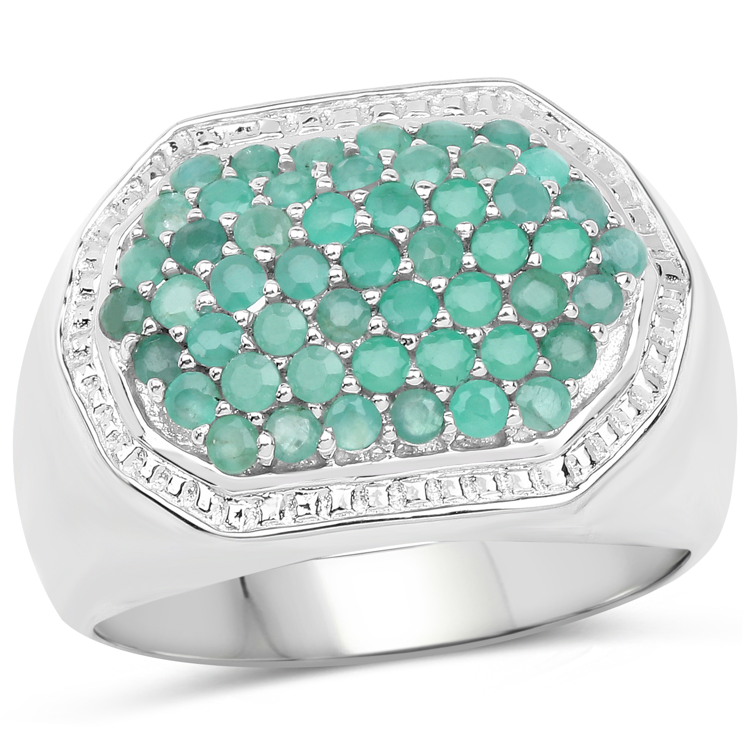 A bold, eye‑catching cluster ring crafted in rhodium‑plated .925 sterling silver, featuring 1.43 ctw of natural round emeralds arranged in a rich, vibrant cluster. The ring has a substantial 10.4‑gram weight and a polished finish that enhances the emeralds’ lush green color.