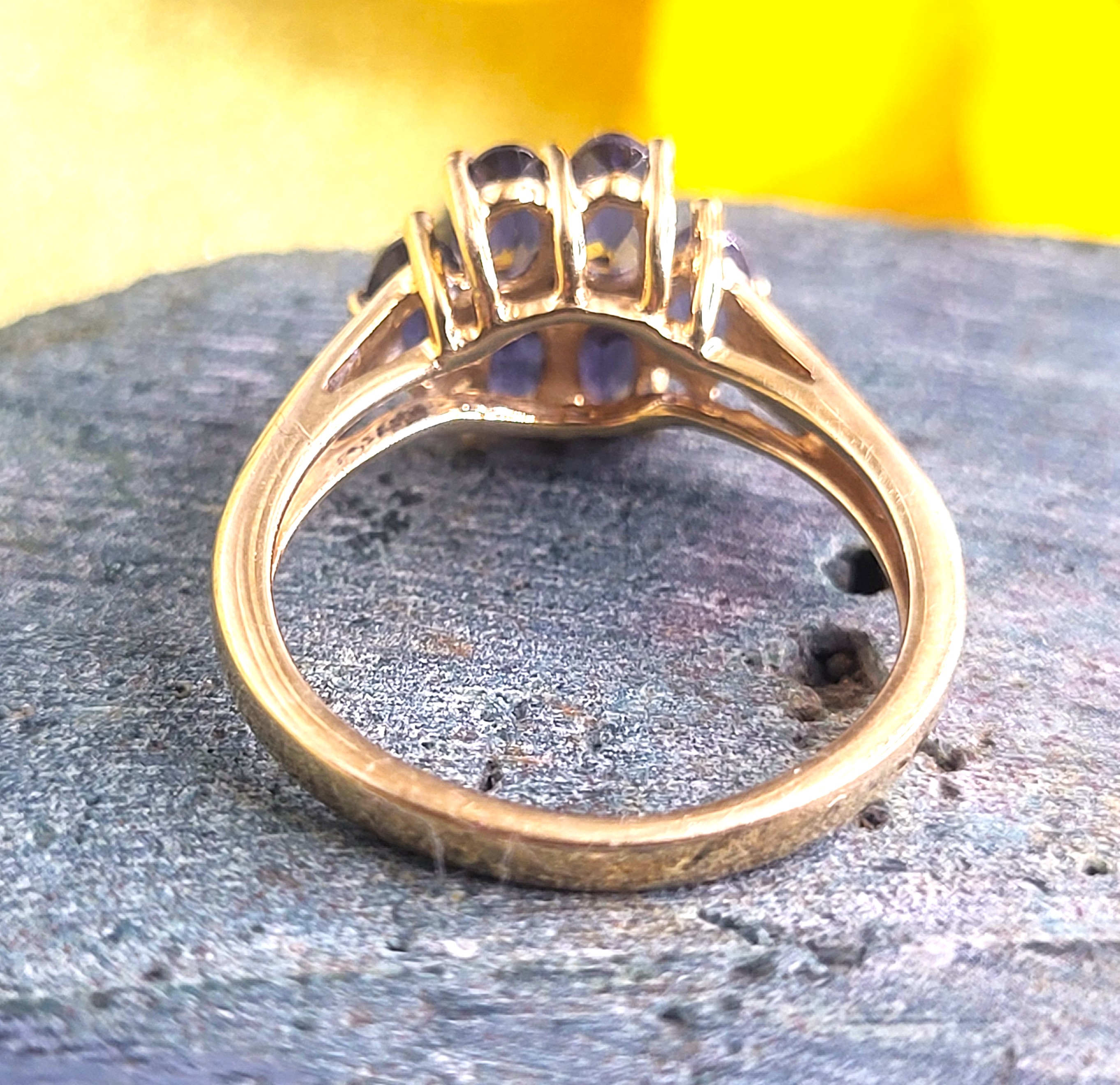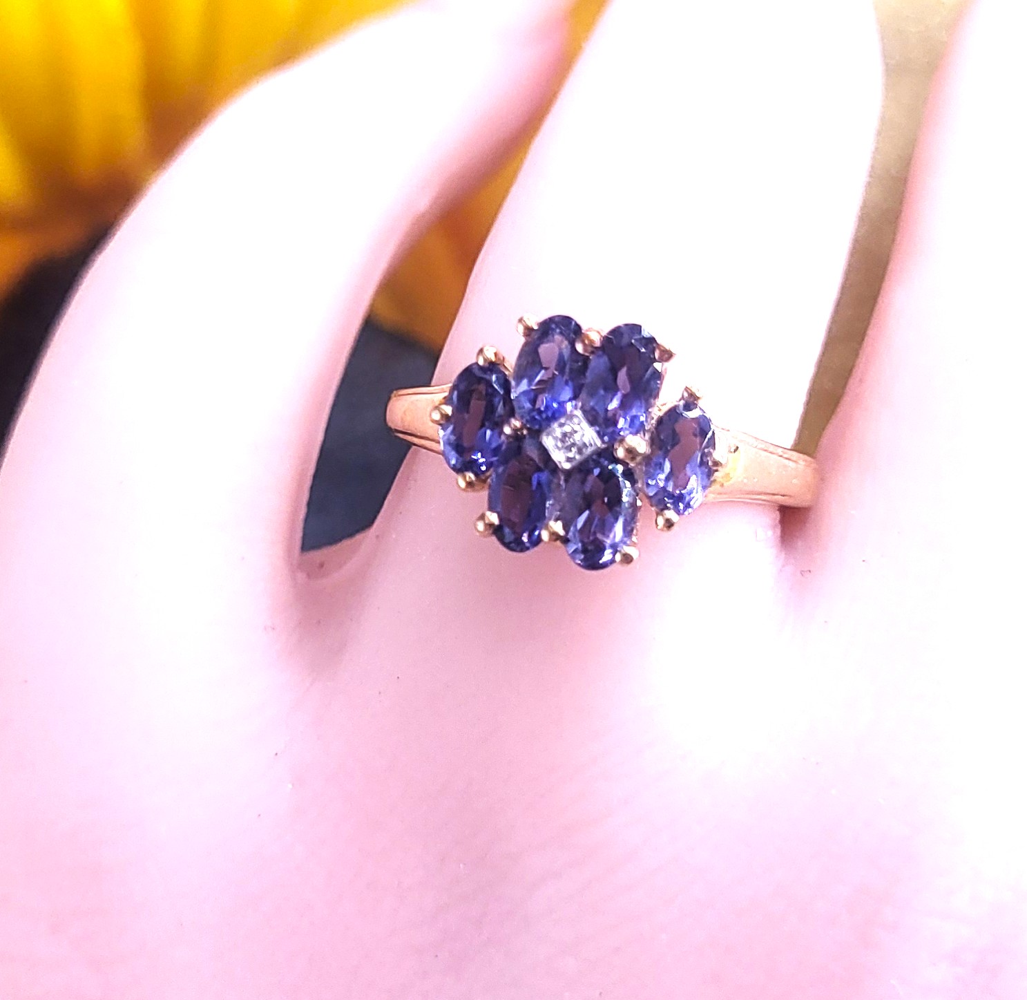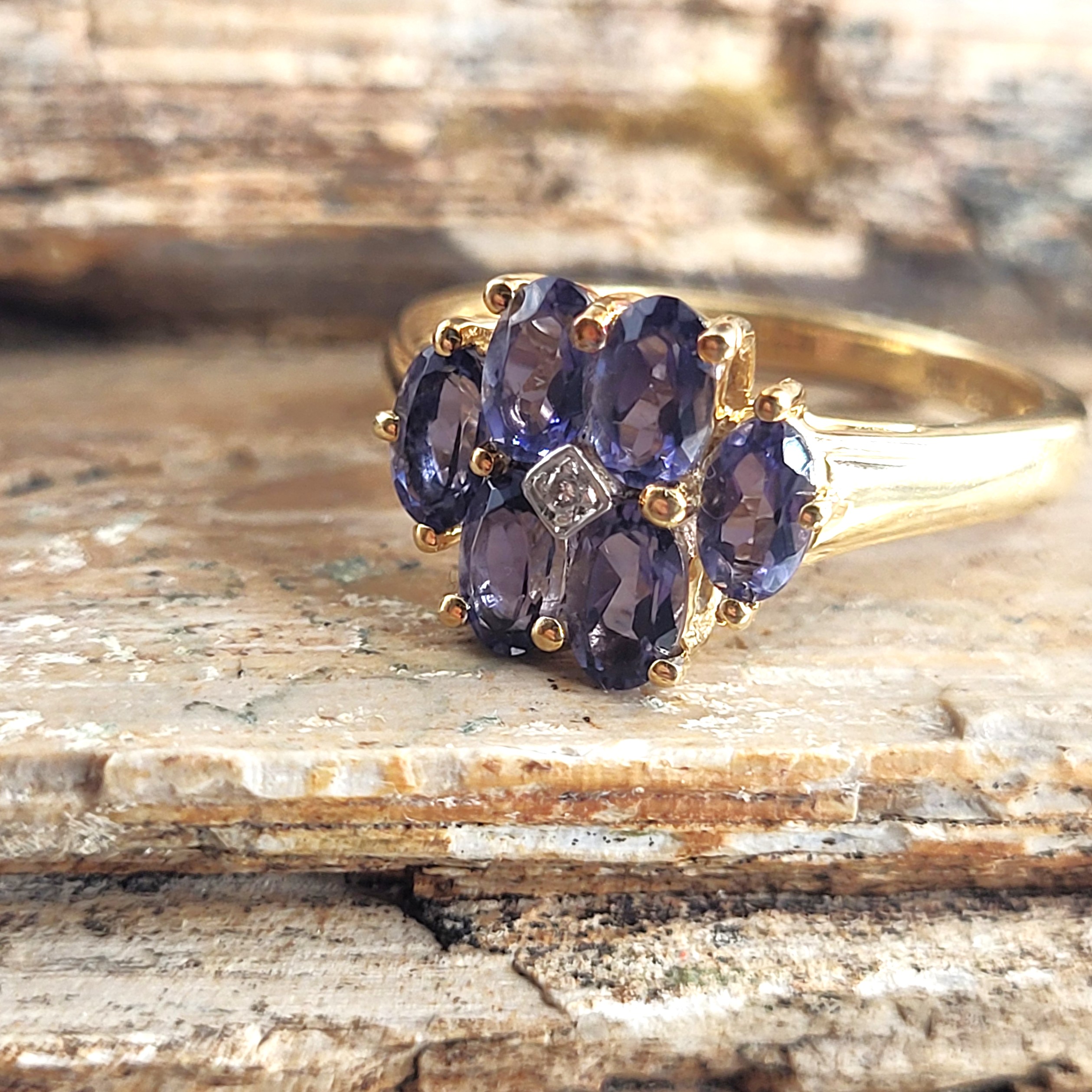 This 14 karat yellow gold ring features approximately 1.25 carats total weight of oval, faceted, genuine purple iolite, a gemstoe that is gaining in familiarity and popularity among jewelry lovers of all ages. A faceted, genuine diamond accents the center of the flower design. The flaired, polished cathedral shoulders taper to an approximate 1.7mm shank and this ring is US size 6.5. See sizing options and other details below. AdminCode: 33110/7-igr