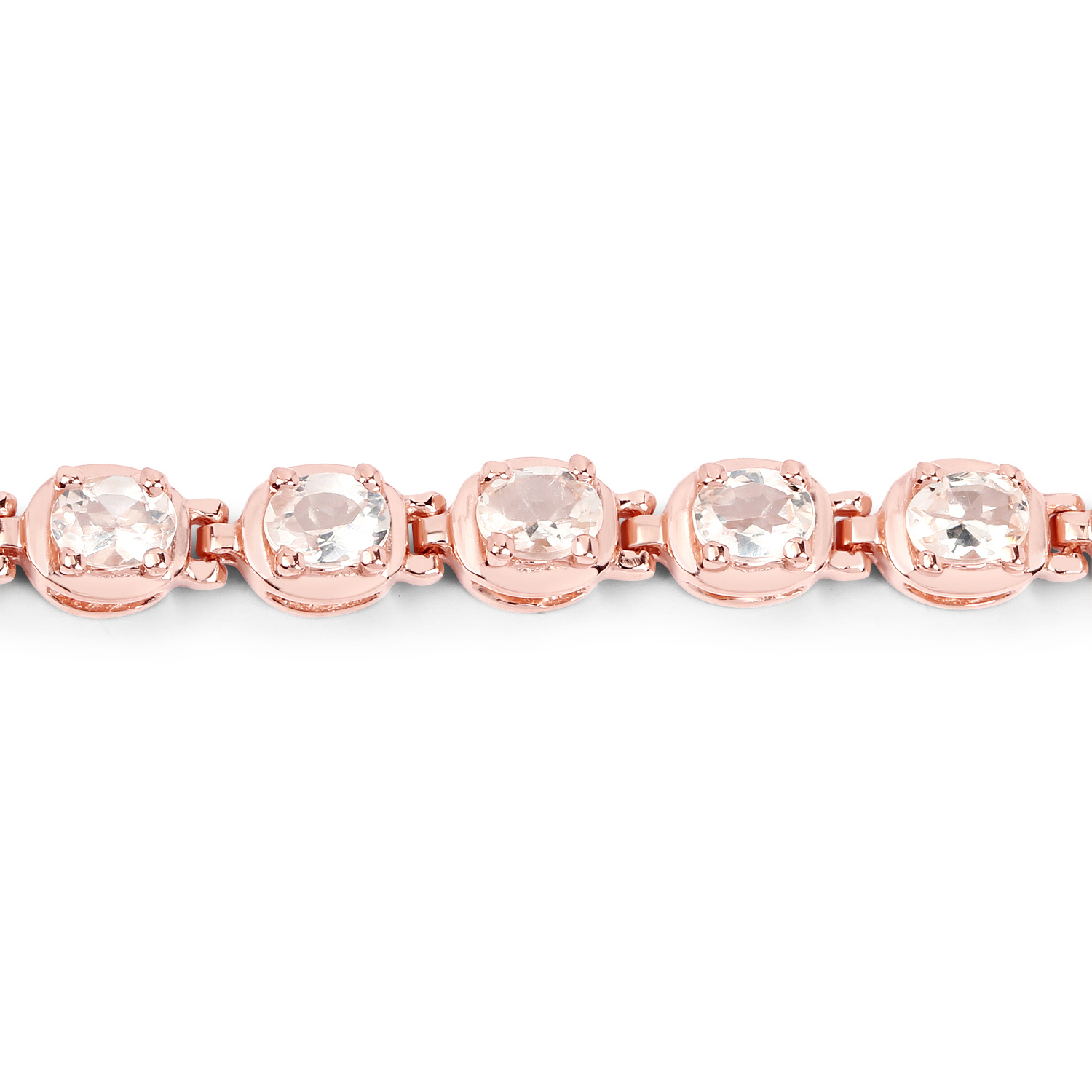 A soft, feminine tennis bracelet crafted in rhodium‑enhanced .925 sterling silver with a warm 14K rose gold plated finish. This piece features 3.90 ctw of natural oval morganites, each 4×3mm and prong‑set to maximize their peach‑pink glow. The stones are arranged in a classic line‑bracelet style, offering continuous sparkle and elegant movement. The bracelet measures 7.50 inches and secures with a sturdy lobster claw clasp. With a total weight of 8.73 grams, it has a comfortable, refined presence on the wrist — perfect for everyday wear or soft, romantic styling.AdminCode: NQnis/blp12