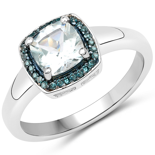 This sterling silve ring features a .75 carat, cushion-cut, genuine aquamarine. The 6mm gemstone is prong-set in a halo of .08 carats total weight of round, faceted, natural blue diamonds that are enhanced with blue rhodium prongs. The ring is US size 10. This is the size the ring was cast in, not altered from another size. Those who have needed sizes greater or less than 2 sizes of their original size, know that the metal and settings can become compromised. This ring CAN be sized one size up or one size down, if needed. See sizing options below. AdminCode: NQnispw/2