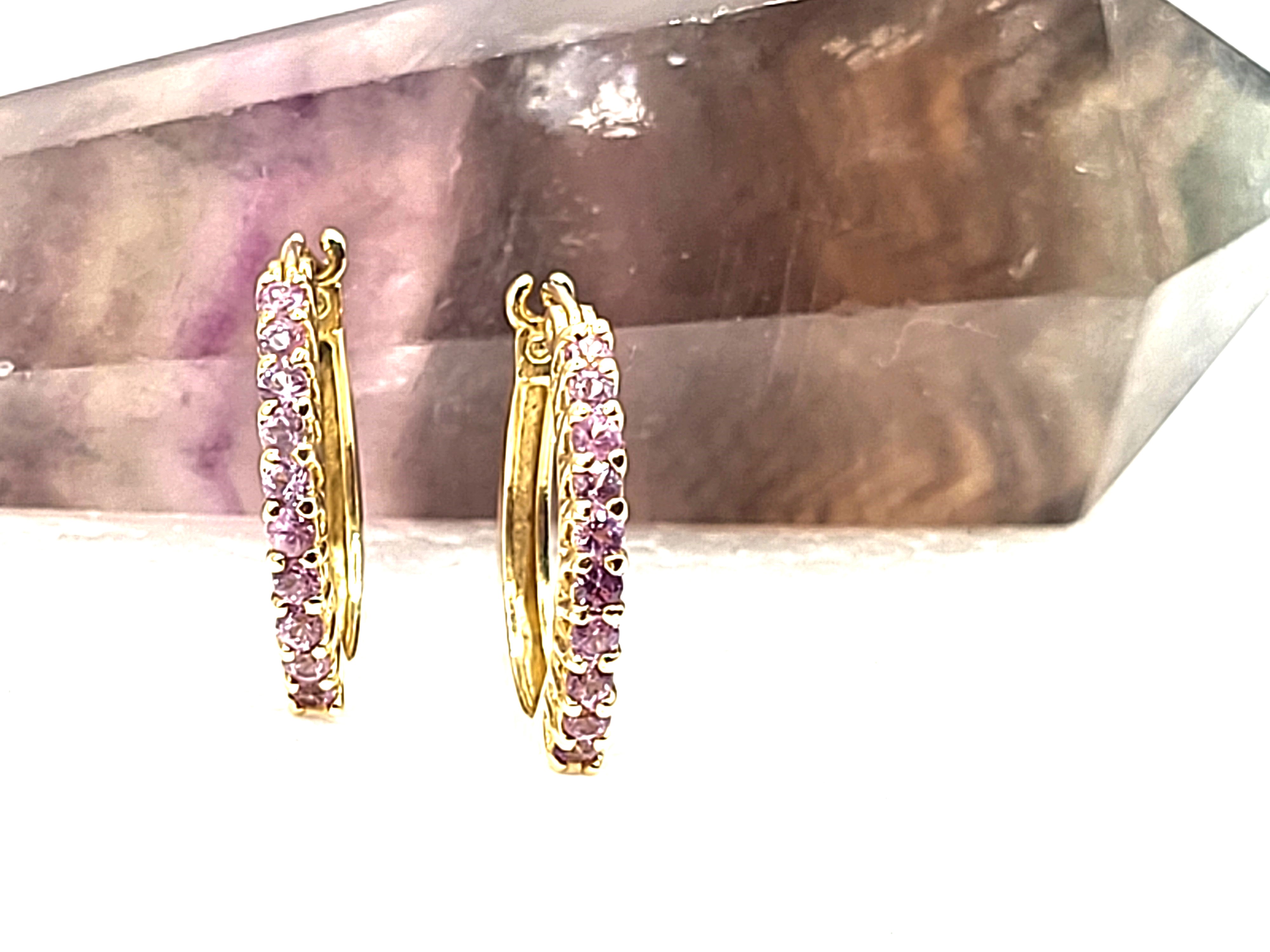 What a great pair of earrings for everyday wear! They are a modest size, at 3/4" diameter, yet sturdy, at 2mm wide and 2.38mm thick. These 14 karat yellow gold earrings have .85 carats total weight of round faceted, prong-set, genuine pink sapphires along the fronts. These earrings attach to the earlobe with hinged posts that lock in the back. Both earrings have a very solid "snap" upon closing! This is a brand new item with manufacturer’s approval to sale in a public auction. It is in excellent condition, but may have fine scratches from shipping or storage. 4.44g Admin: G11241/33iit