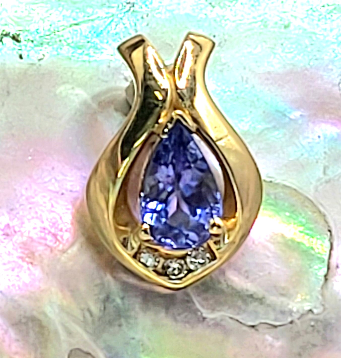 This is a 14 karat yellow gold pendant that features a 1.12 carat pear-cut, prong-set, rich bluish purple, genuine tanzanite. Channel-set at the bottom of the curvy yellow gold frame are .05 carats of round, brilliant-cut, H, SI2 clarity accent diamonds. The pendant is approximately 5/8" diameter and has a built-in bail that can accommodate an approximate 3.75mm wide chain.  Admin: G11241/15grt