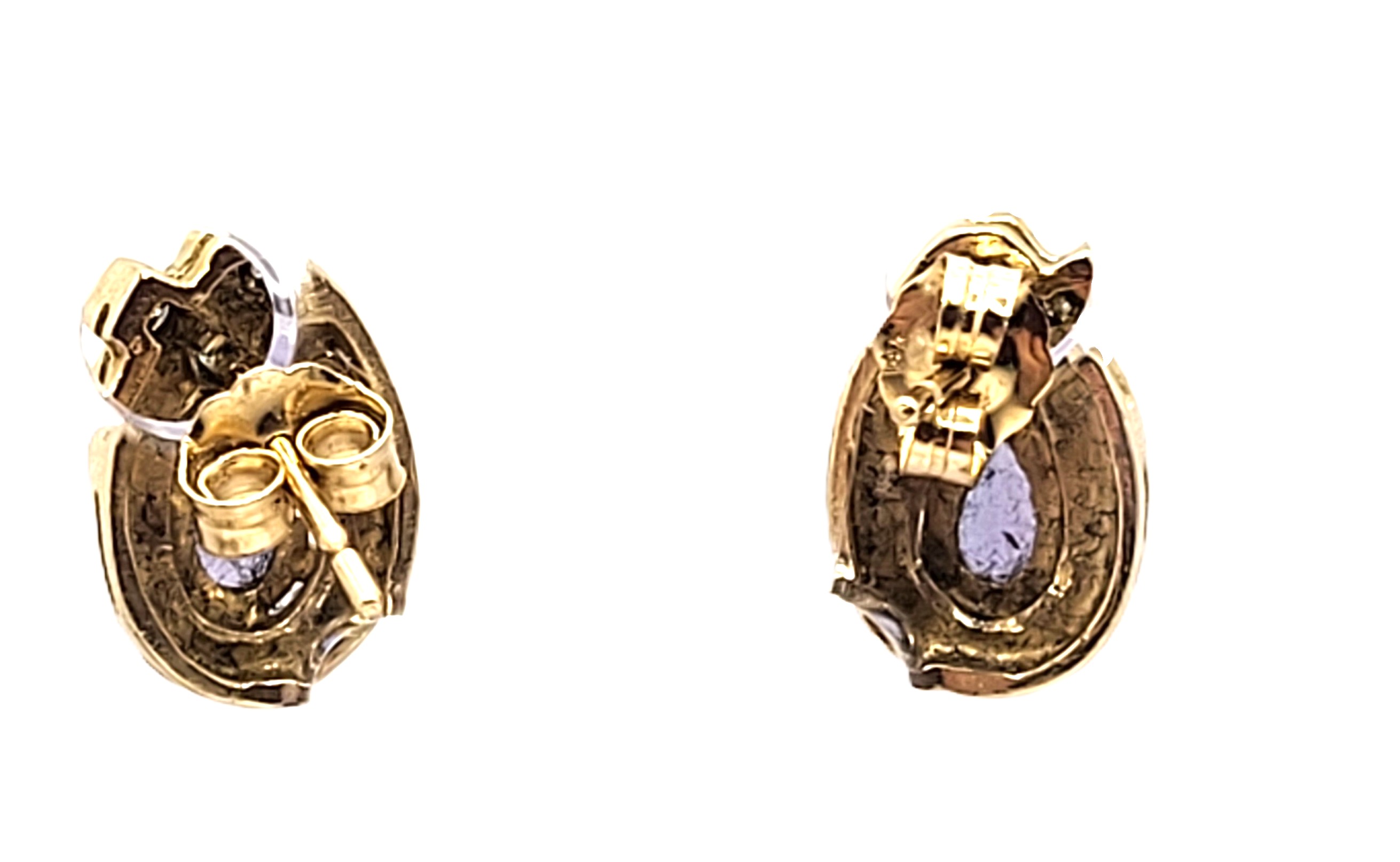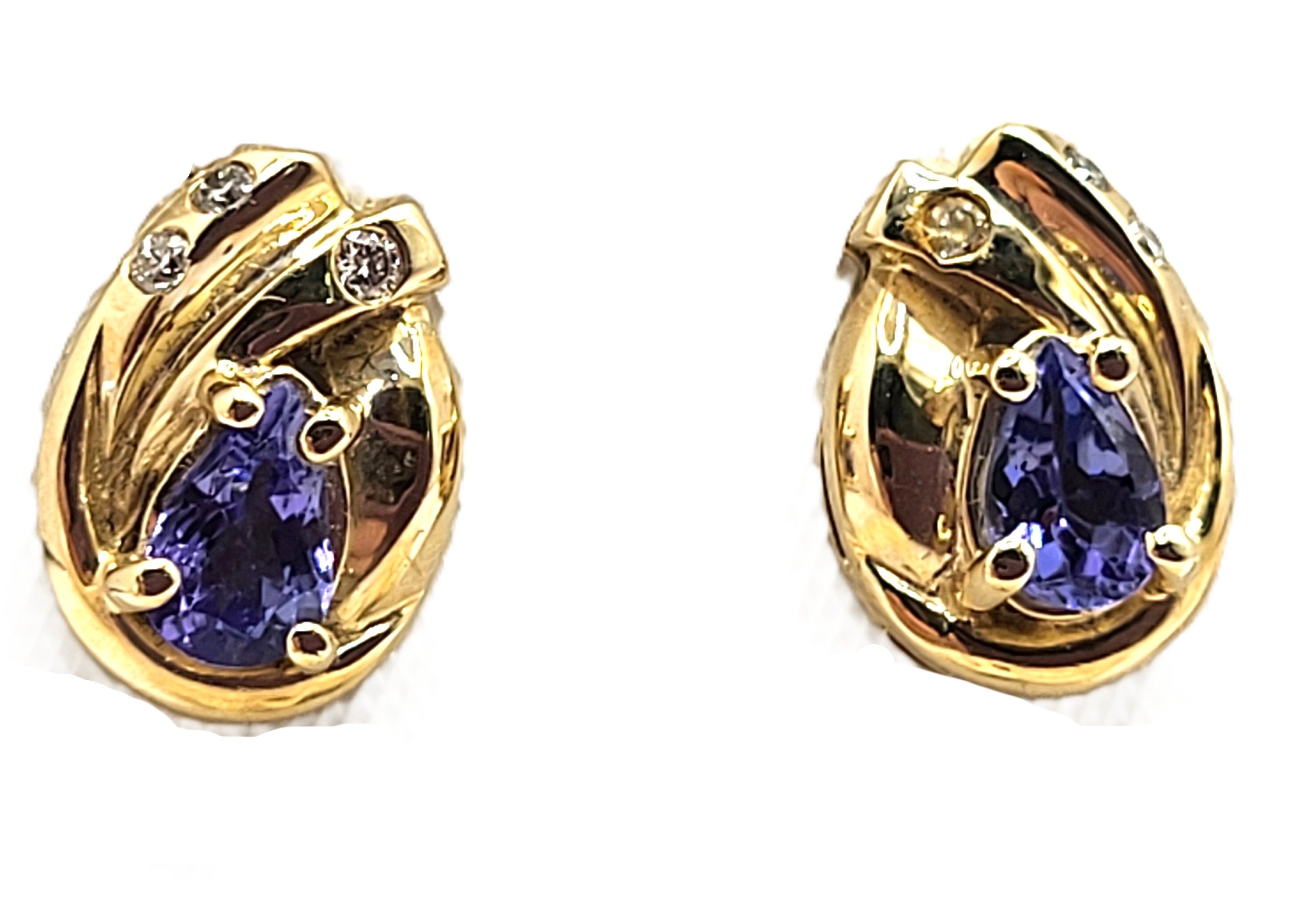 This pair of 14 karat yellow gold earrings are ones you will want to (and can) wear everyday! They feature .80 carats total weight of pear-cut, prong-set, genuine purple tanzanites with .09 carats total weight of round, brilliant-cut, H-I color, SI2-I1 clarity, flush-set, accent diamonds. The earrings are approximately 5/8" long, 3/8" wide, 6mm deep (including the gemstone), and they attach to the earlobe with posts and friction backs. 3.49 grams Admin: G11241/34nlt
