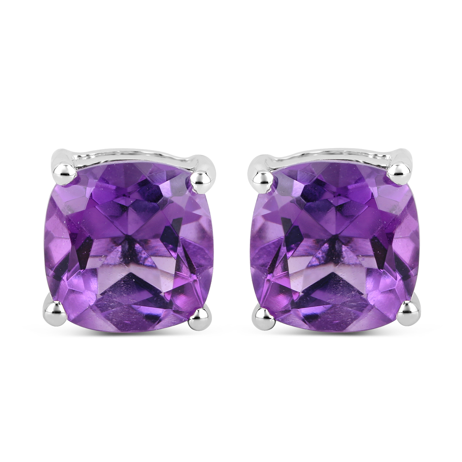 This pair of sterling silver earrings features 3.60 carats total weight of cushion-cut, genuine amethysts with a rich, violet-purple color. The amethysts are prong-set and the settings have a tarnish-resistant rhodium finish. The earrings attach to the earlobes with posts and friction backs. AdminCode: KQJ6463/lr