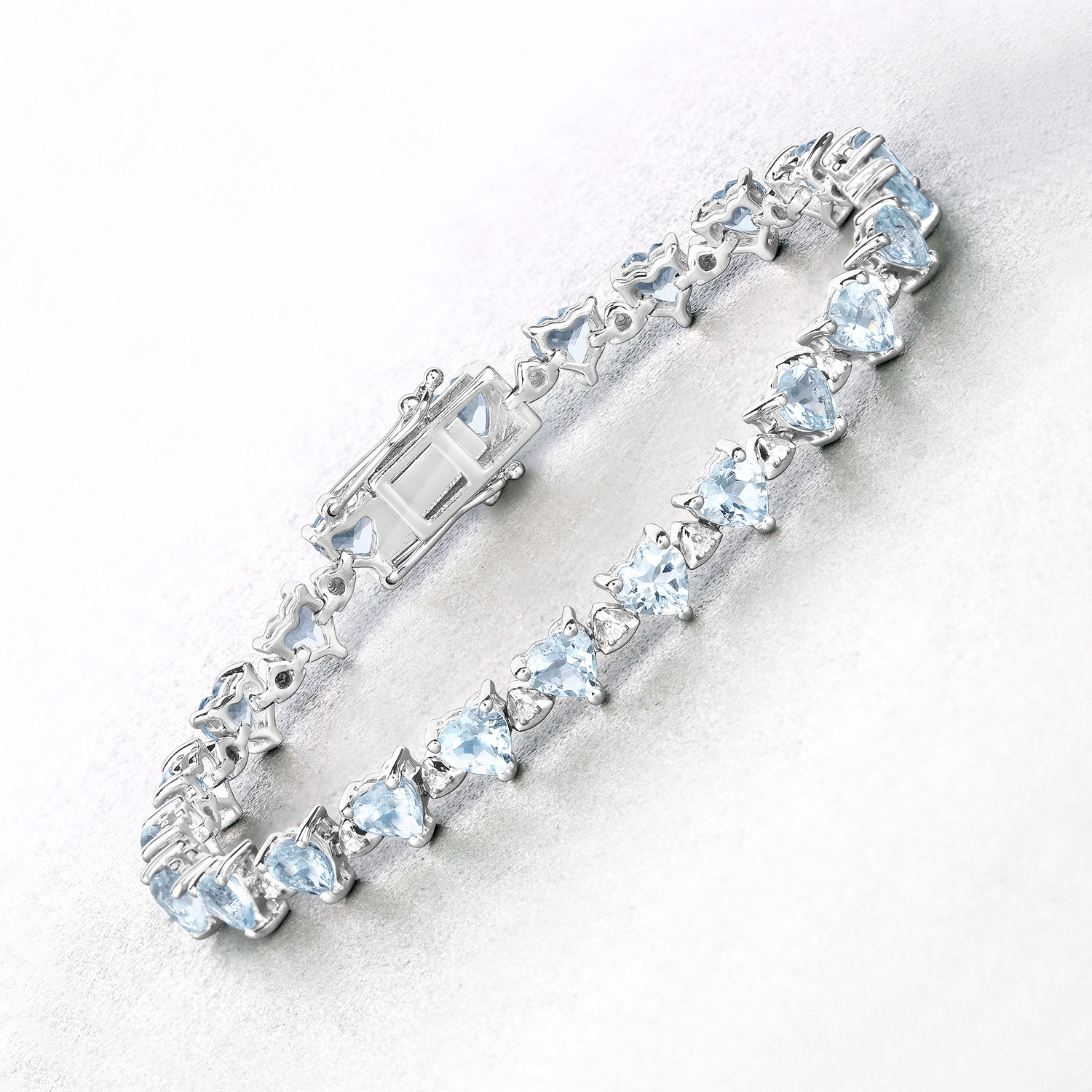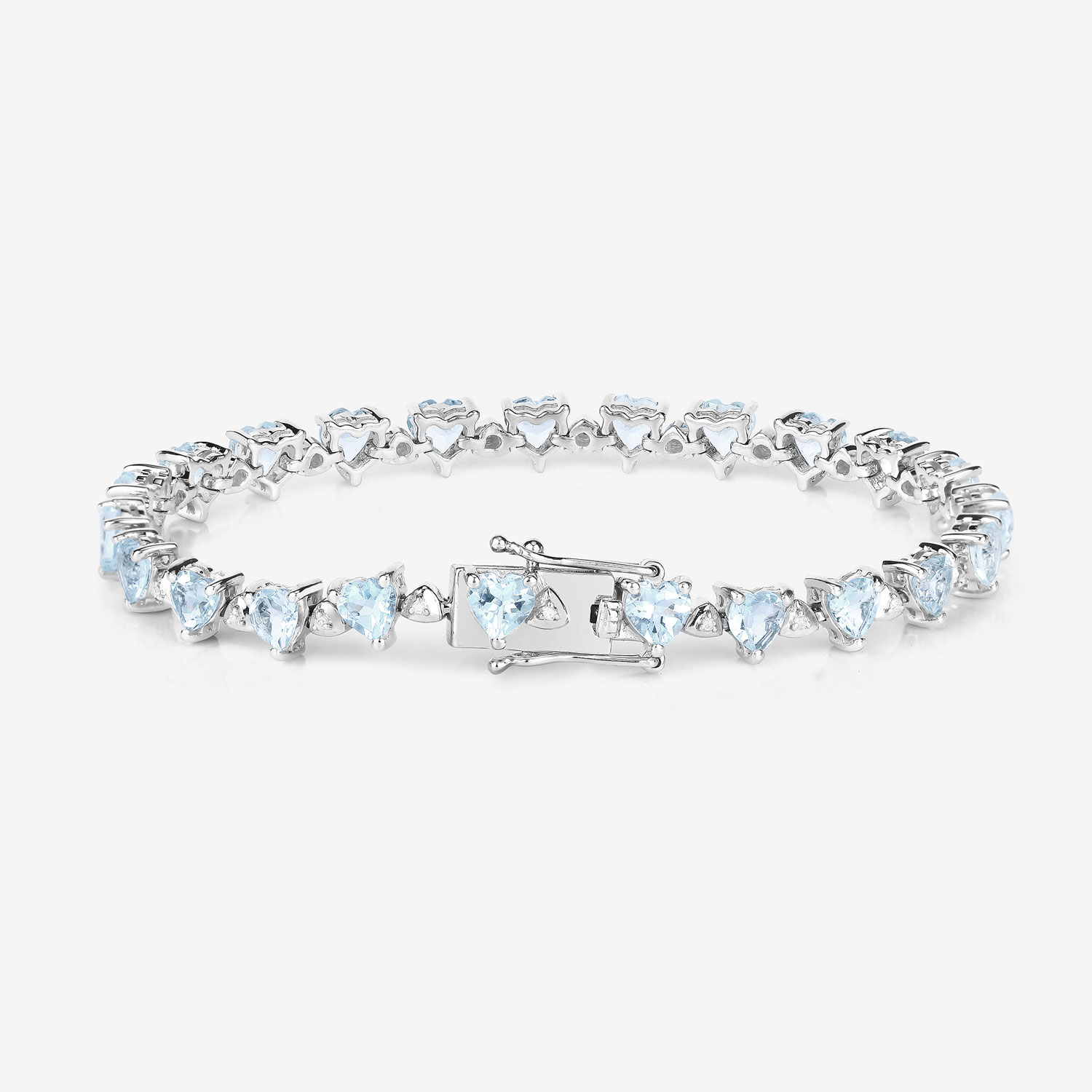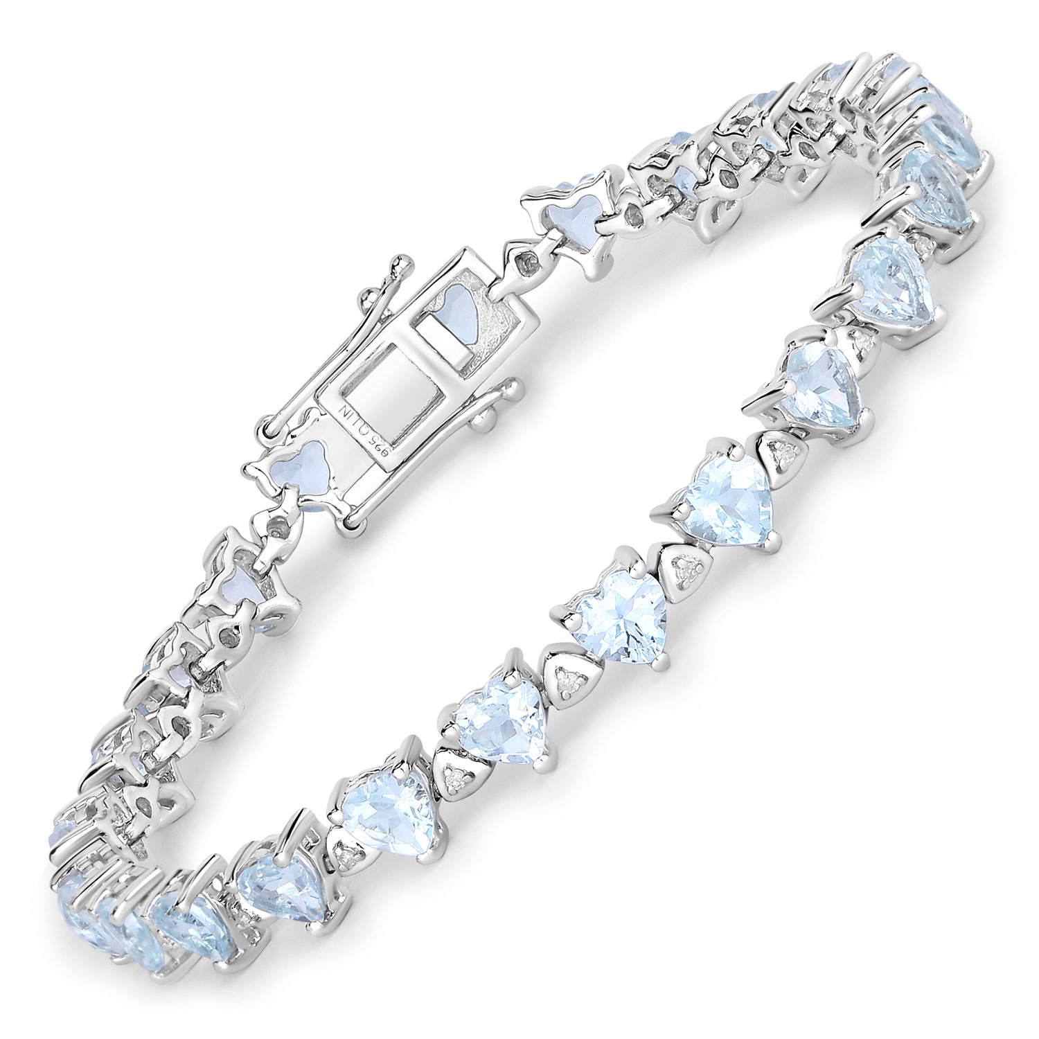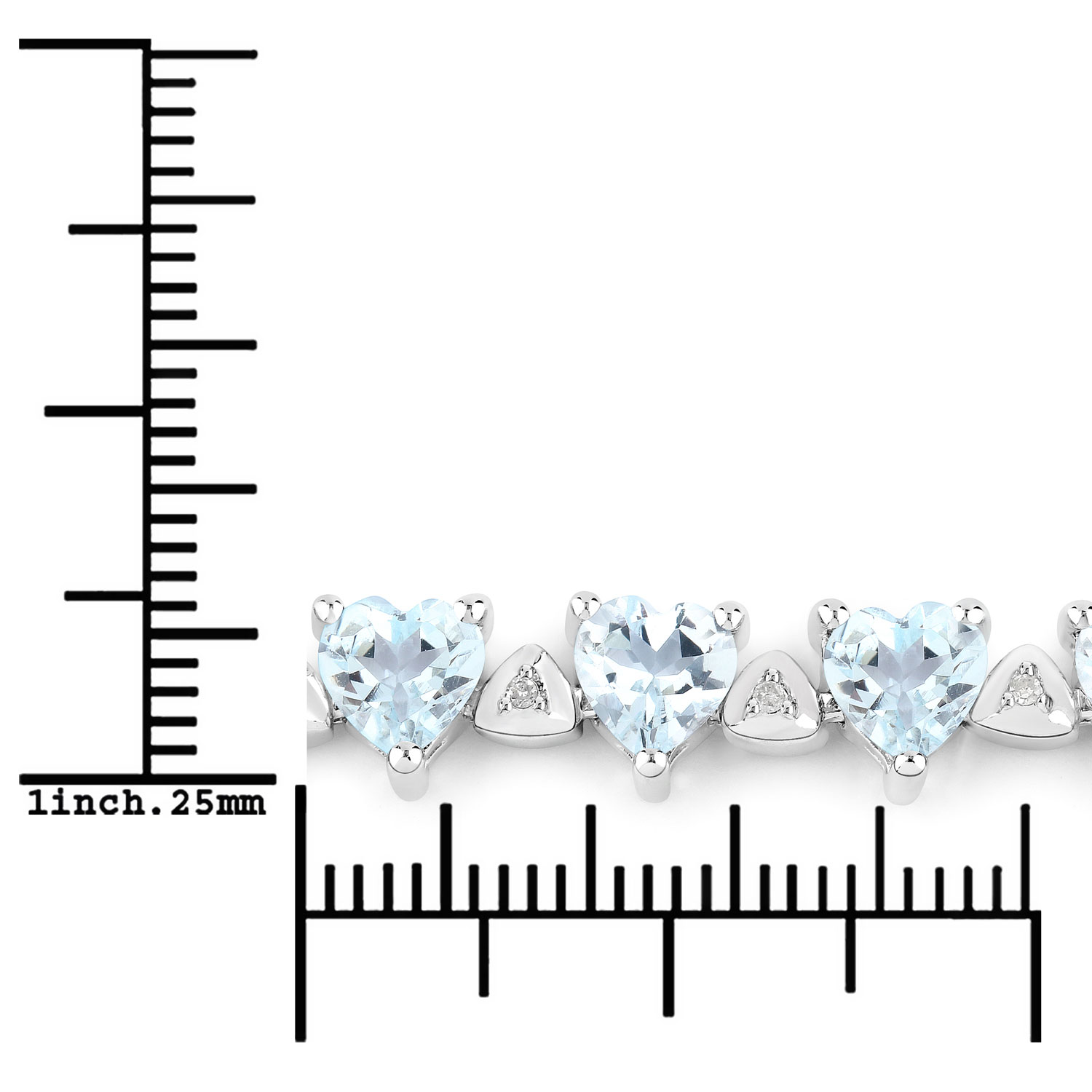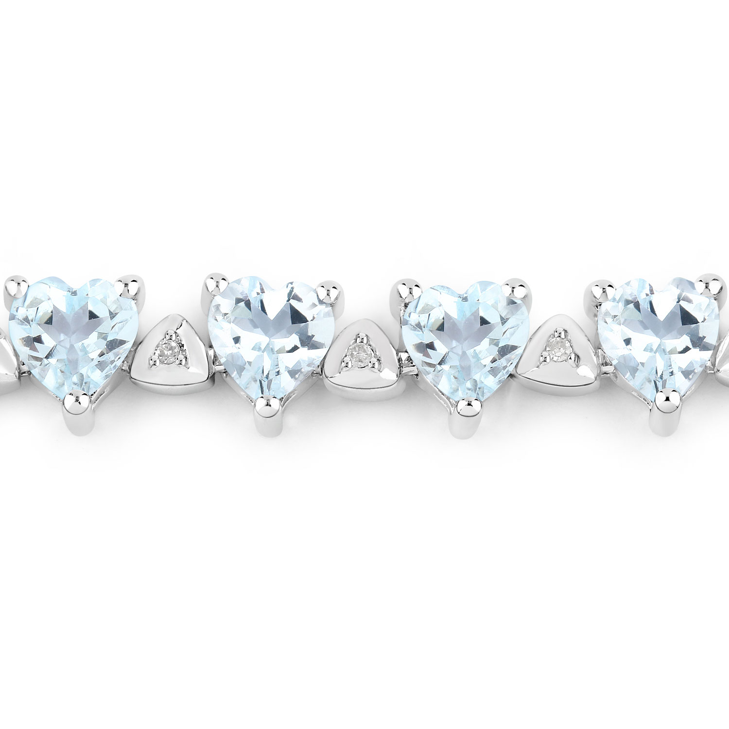This sterling silver bracelet is sweet and romantic, chunky and trendy, affordable and practical, and above all else, just beautiful! It feautres 7.59 carats total weight of heart cut, genuine aquamarines.  The 5mm gemstones are prong set on individual, hinged links and .12 carats total weight of round, brilliant-cut, Earth-mined diamonds accent the separator links between each aquamarine. The bracelet is 7.25" long and closes with a hidden box clasp and 2 safety clips. The bracelet has a tarnish-resistant finish for a great shine and easy cleaning.  See more information below.