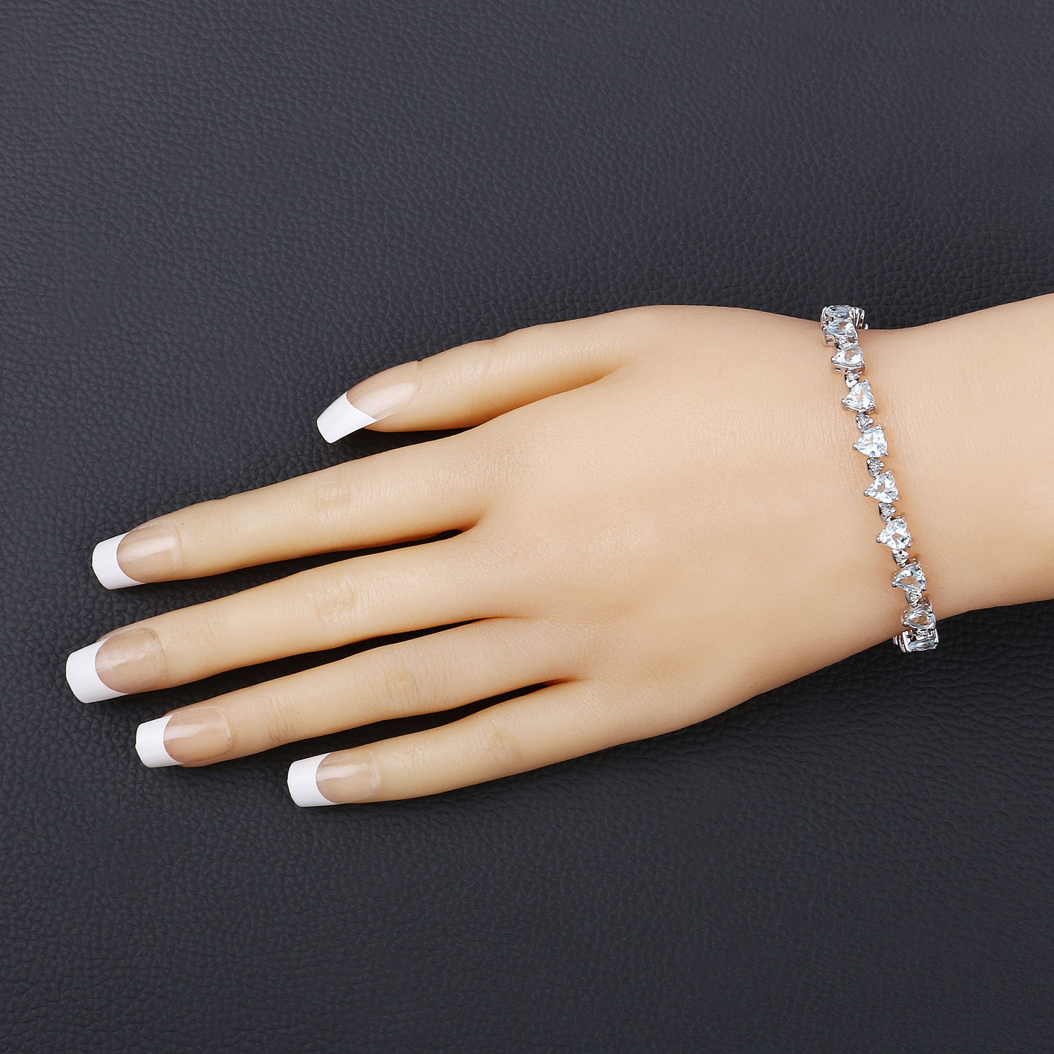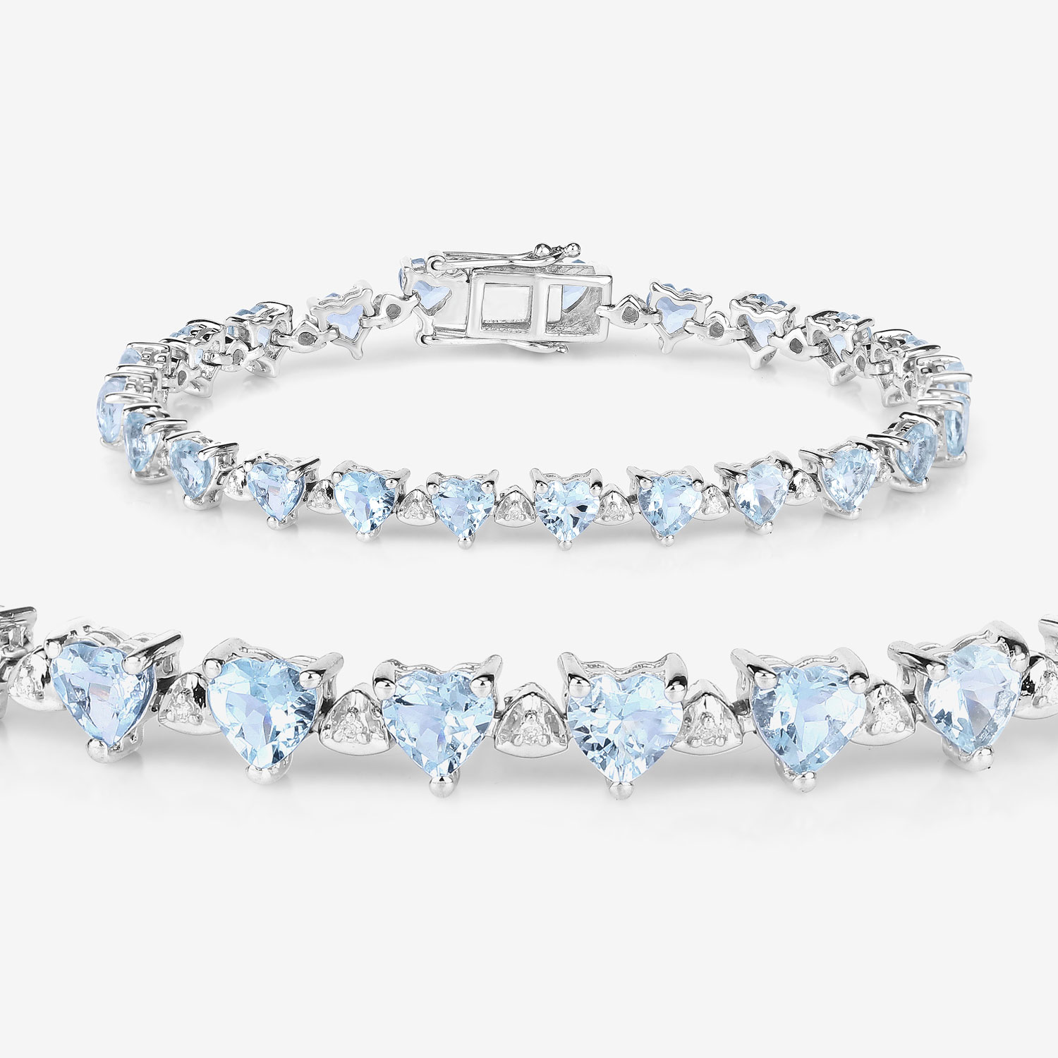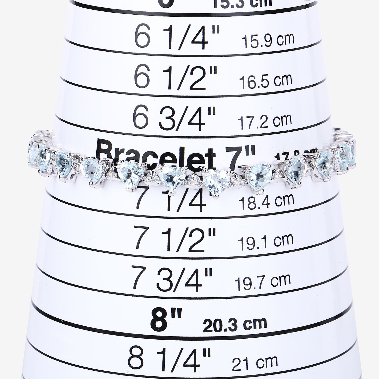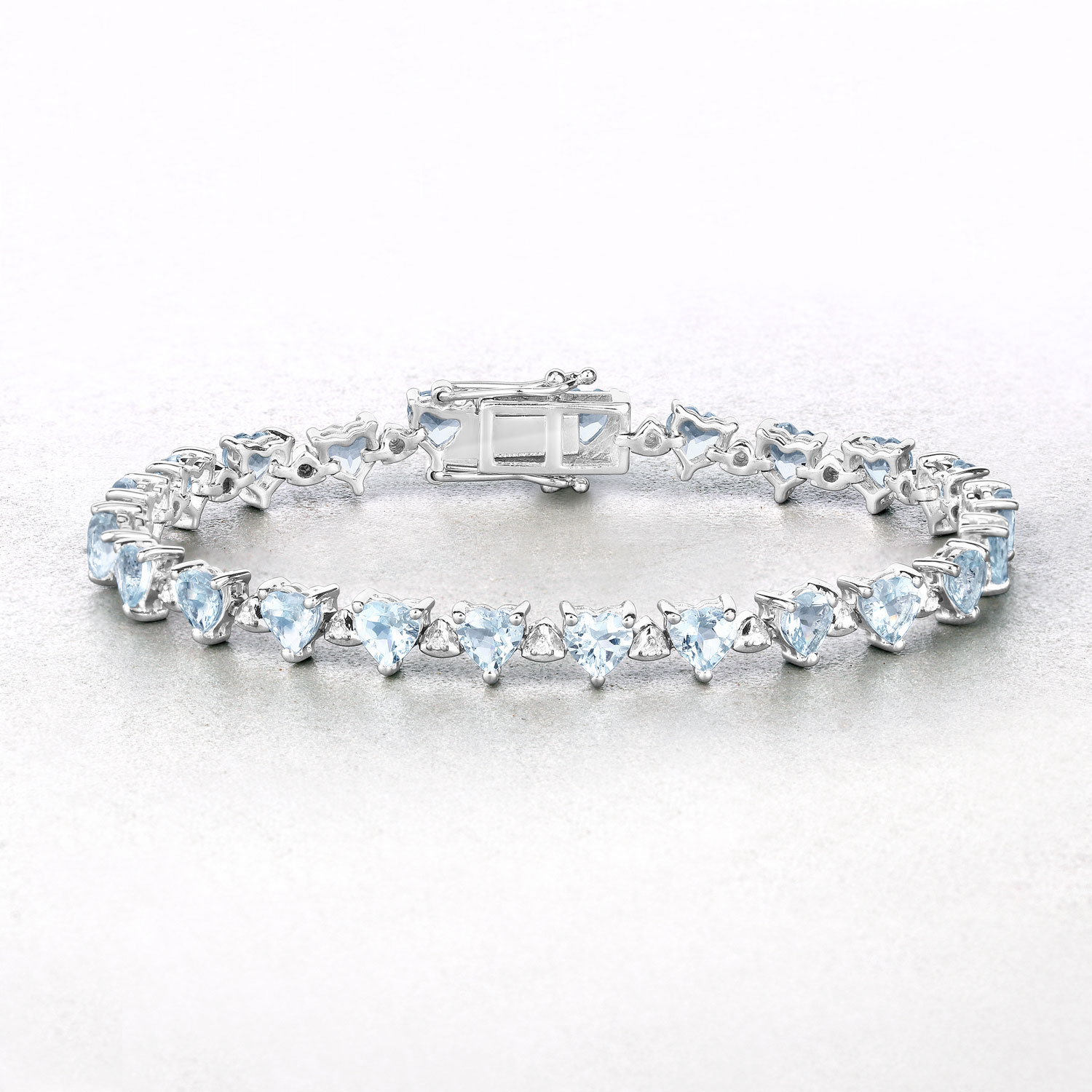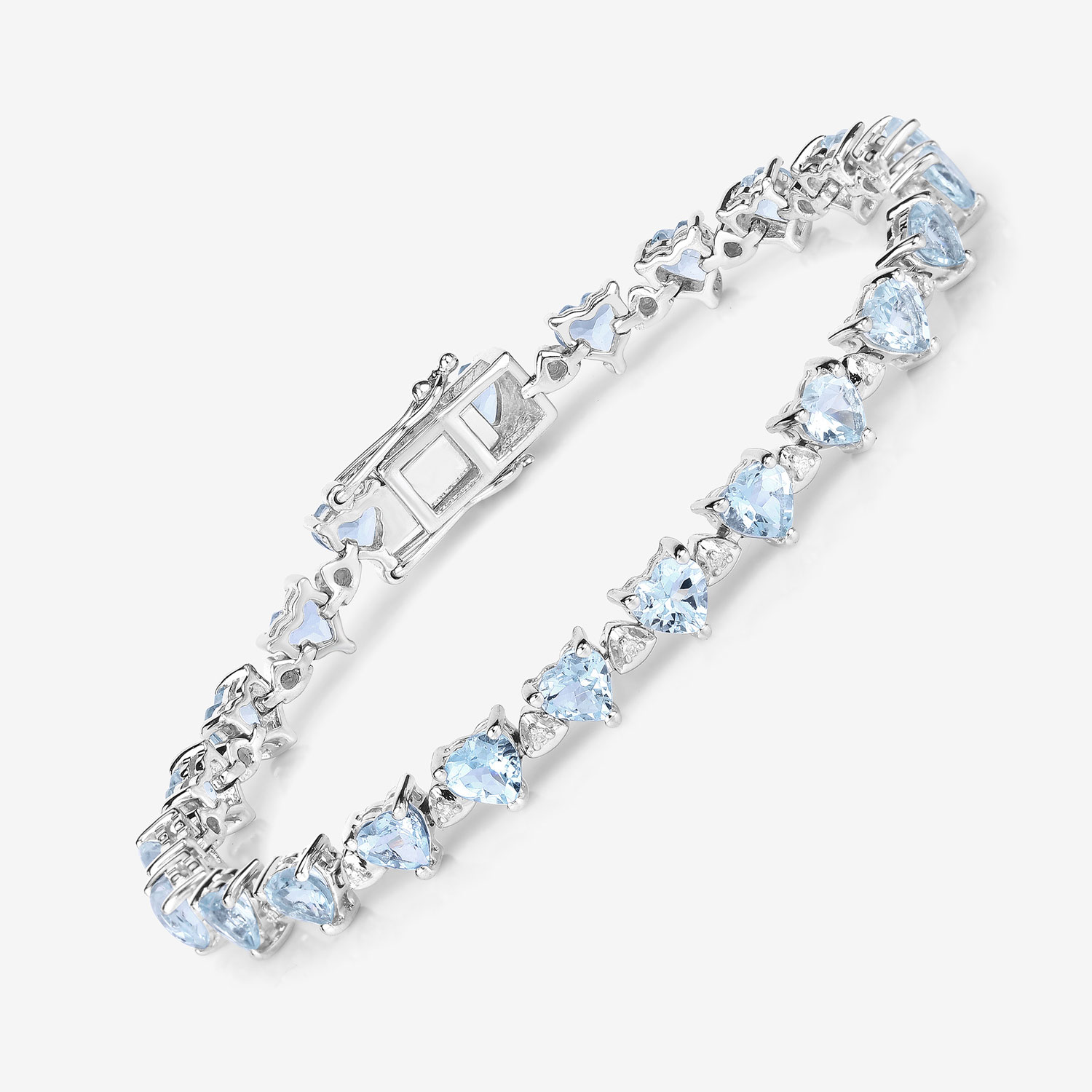 This sterling silver bracelet is sweet and romantic, chunky and trendy, affordable and practical, and above all else, just beautiful! It feautres 7.59 carats total weight of heart cut, genuine aquamarines.  The 5mm gemstones are prong set on individual, hinged links and .12 carats total weight of round, brilliant-cut, Earth-mined diamonds accent the separator links between each aquamarine. The bracelet is 7.25" long and closes with a hidden box clasp and 2 safety clips. The bracelet has a tarnish-resistant finish for a great shine and easy cleaning.  See more information below.