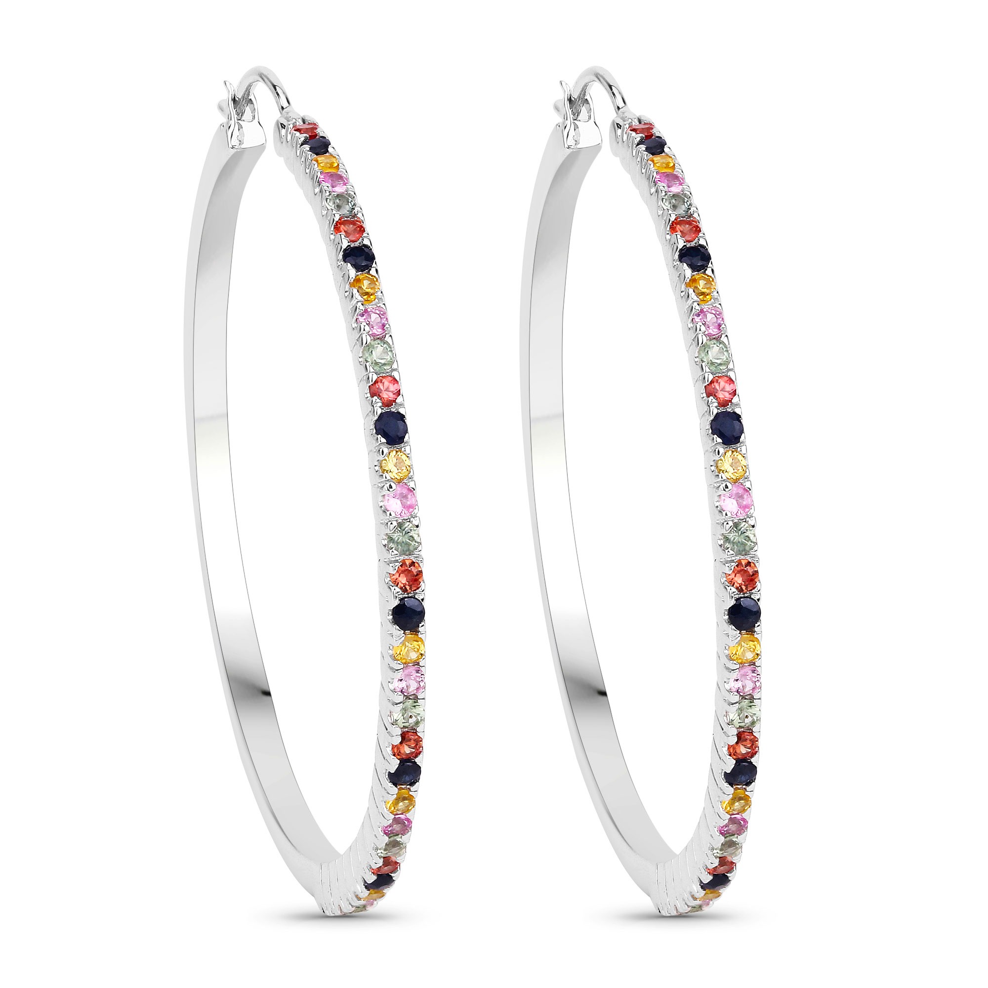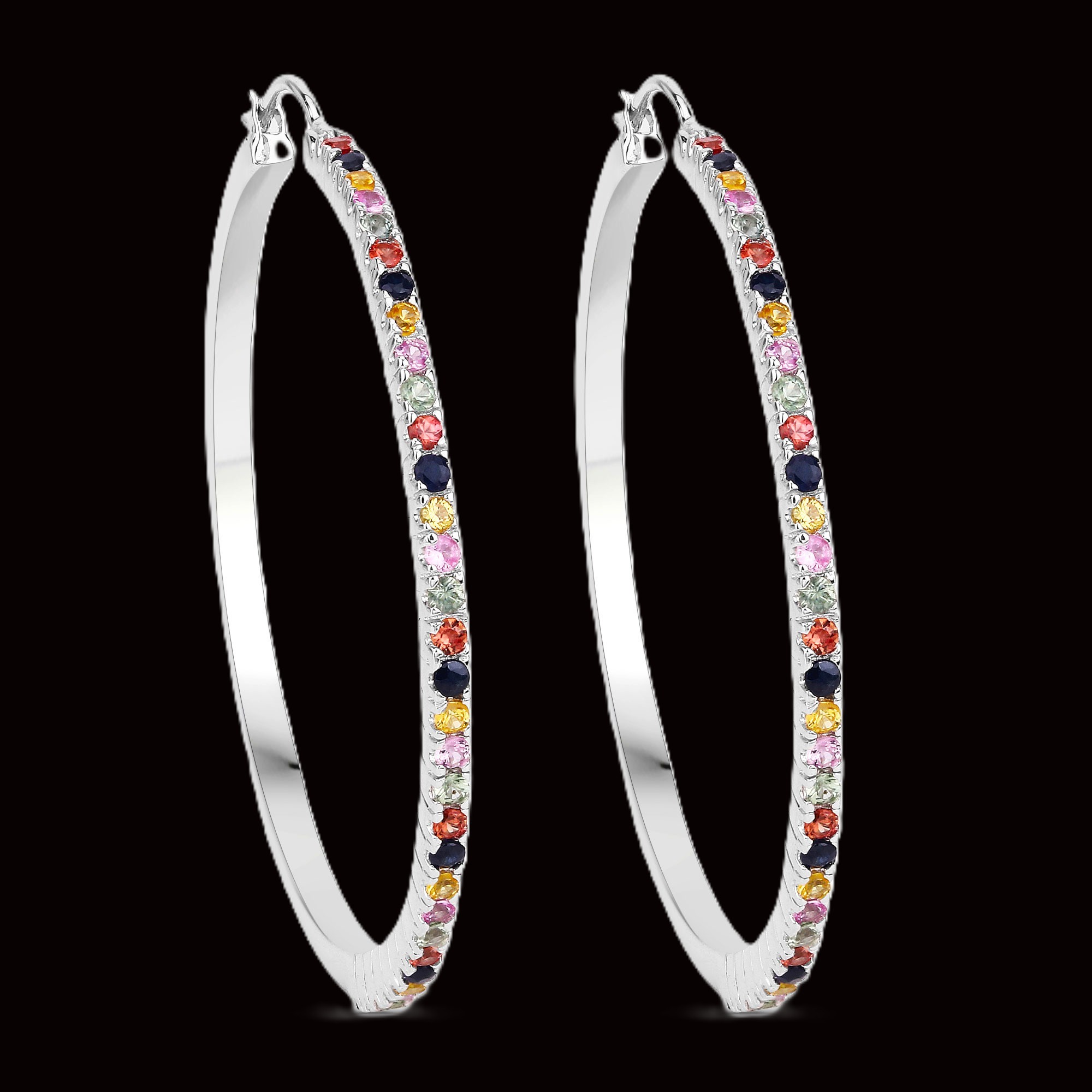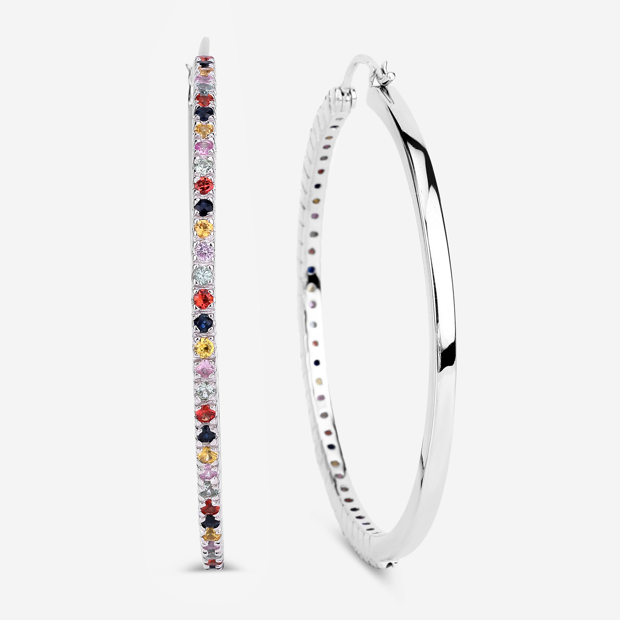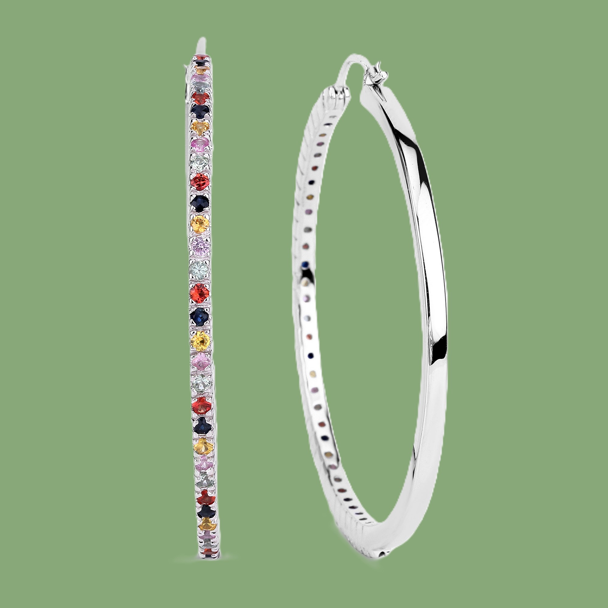 With these sterling silver hoop earrings you are no longer chasing the rainbow, you’ve caught it! The 2.24 carats of genuine, Earth-mined sapphires are prong-set, flush on the front of these glam 2" hoops and they flash their blue, yellow, orange, green, and pink brilliance the way only sapphires can! They have a gleaming rhodium finish that protects against oxidation and they attach to the earlobes with hinged posts and clip backs. See below for more information.