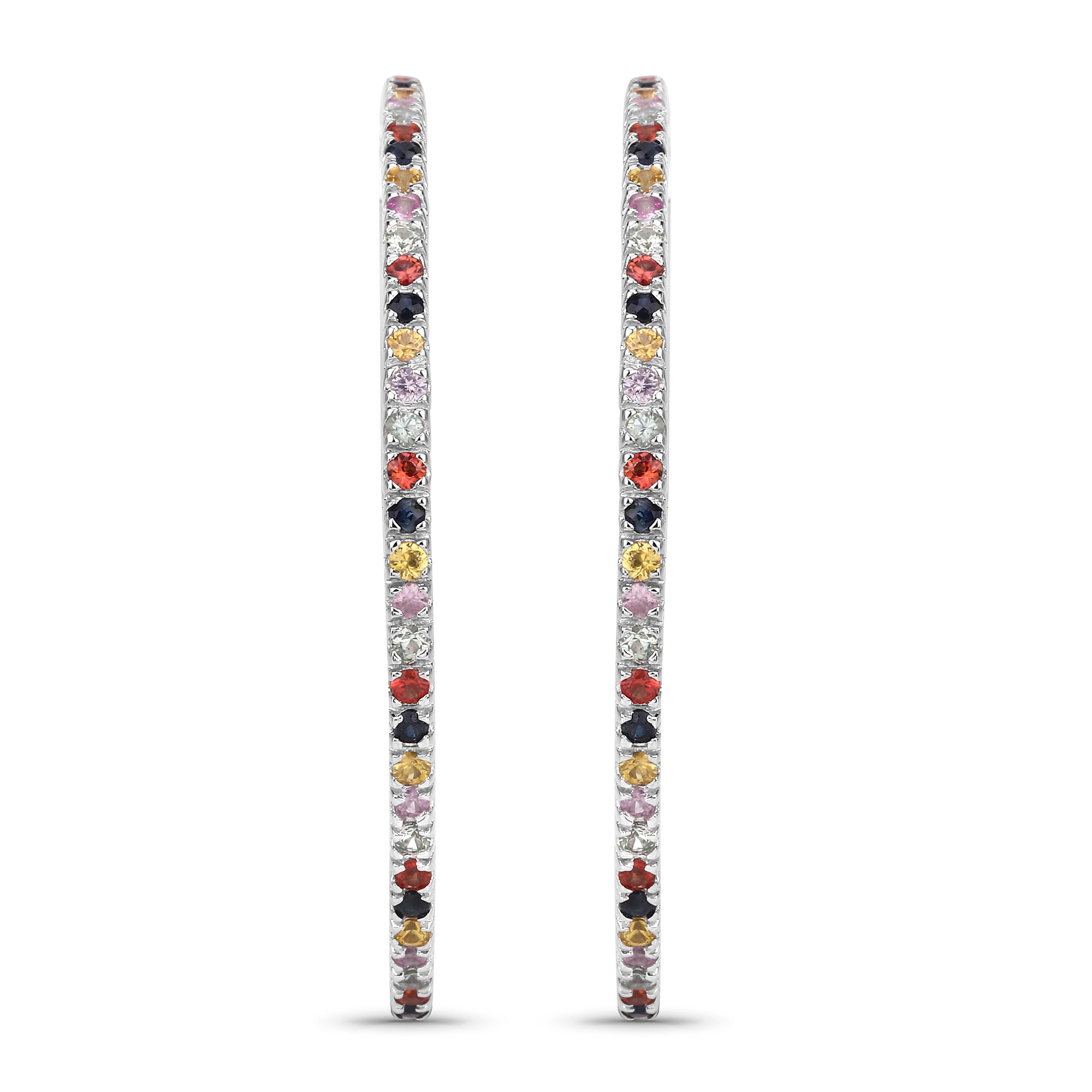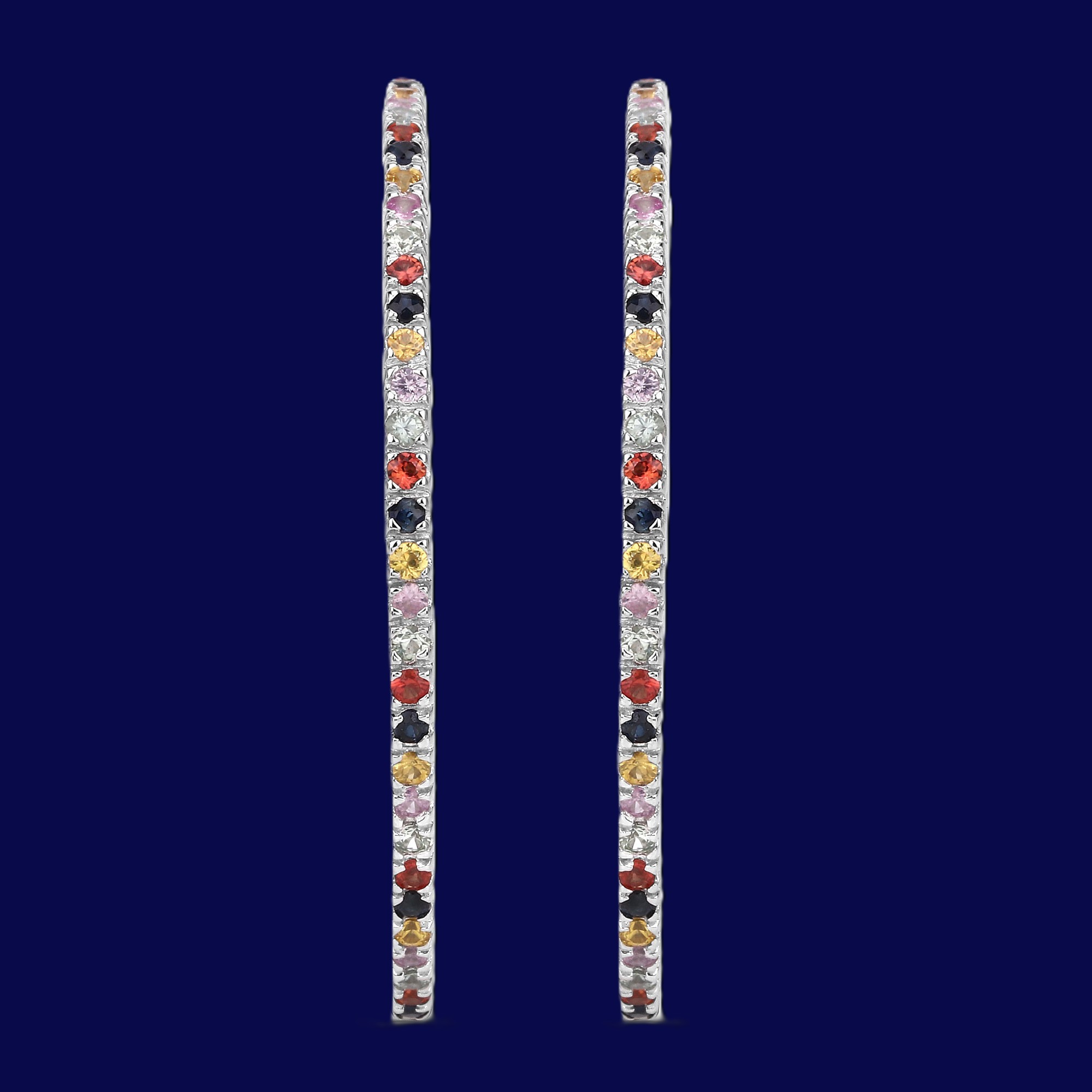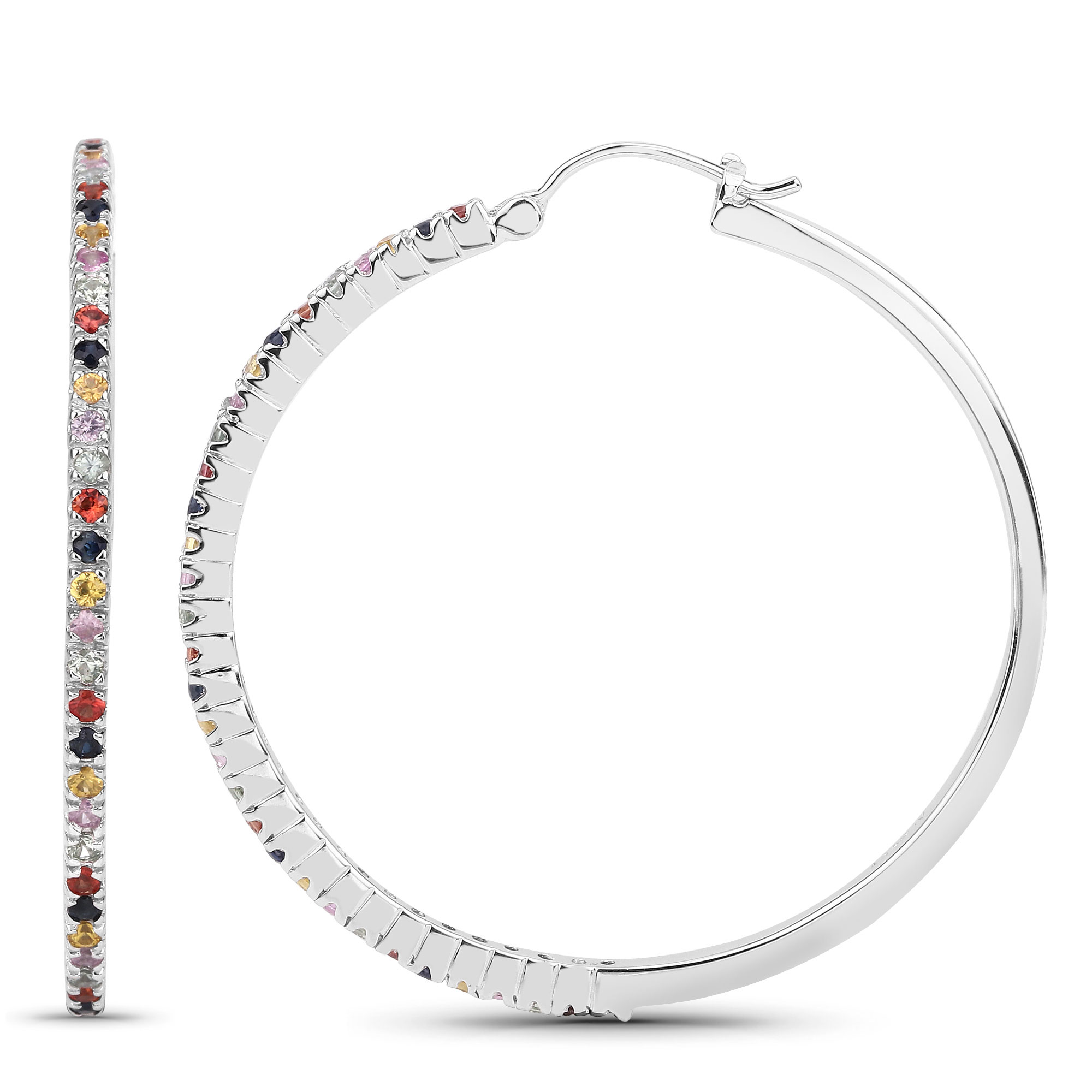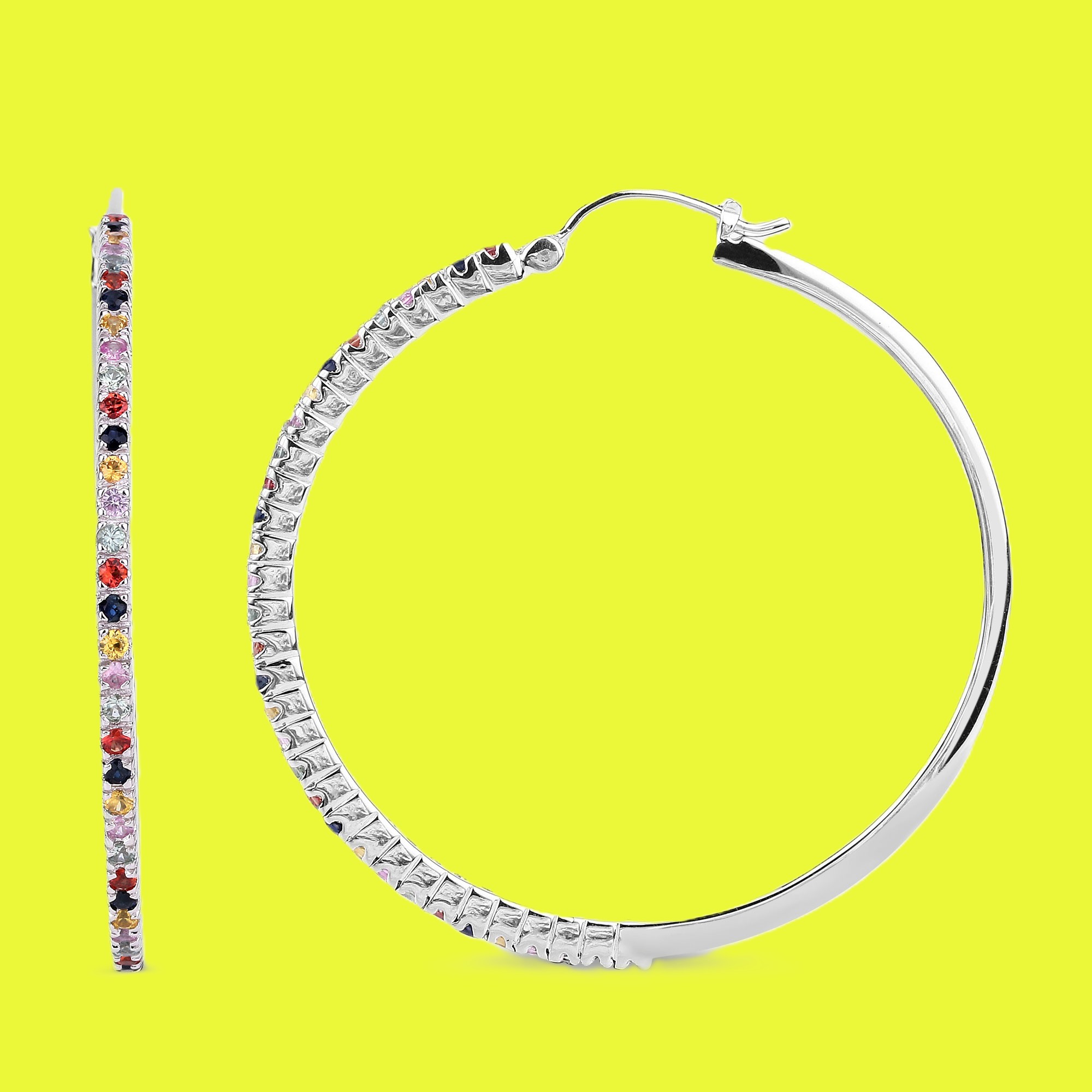 With these sterling silver hoop earrings you are no longer chasing the rainbow, you’ve caught it! The 2.24 carats of genuine, Earth-mined sapphires are prong-set, flush on the front of these glam 2" hoops and they flash their blue, yellow, orange, green, and pink brilliance the way only sapphires can! They have a gleaming rhodium finish that protects against oxidation and they attach to the earlobes with hinged posts and clip backs. See below for more information.