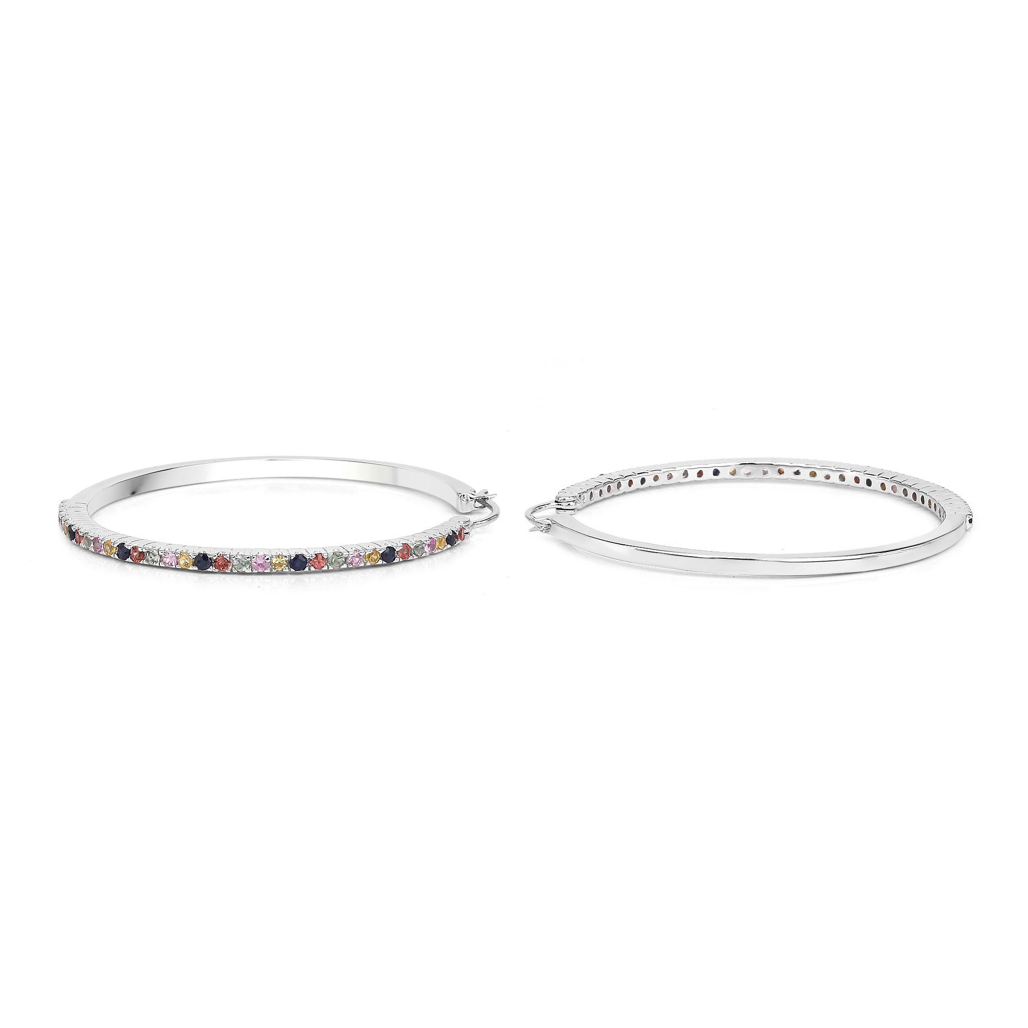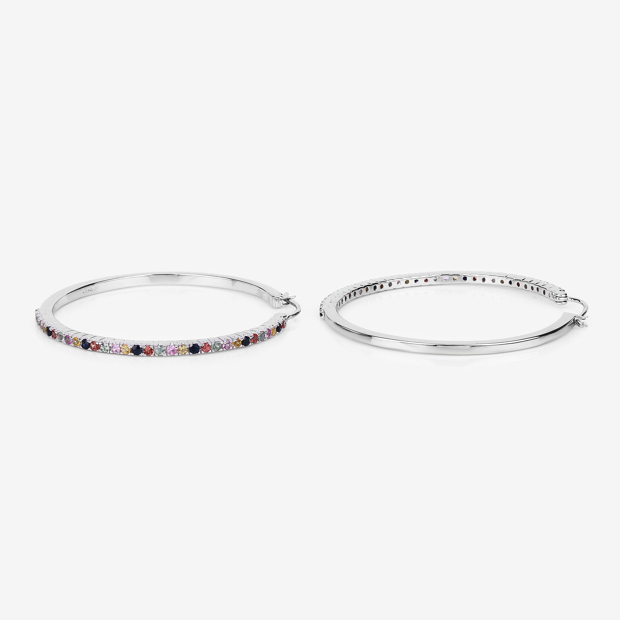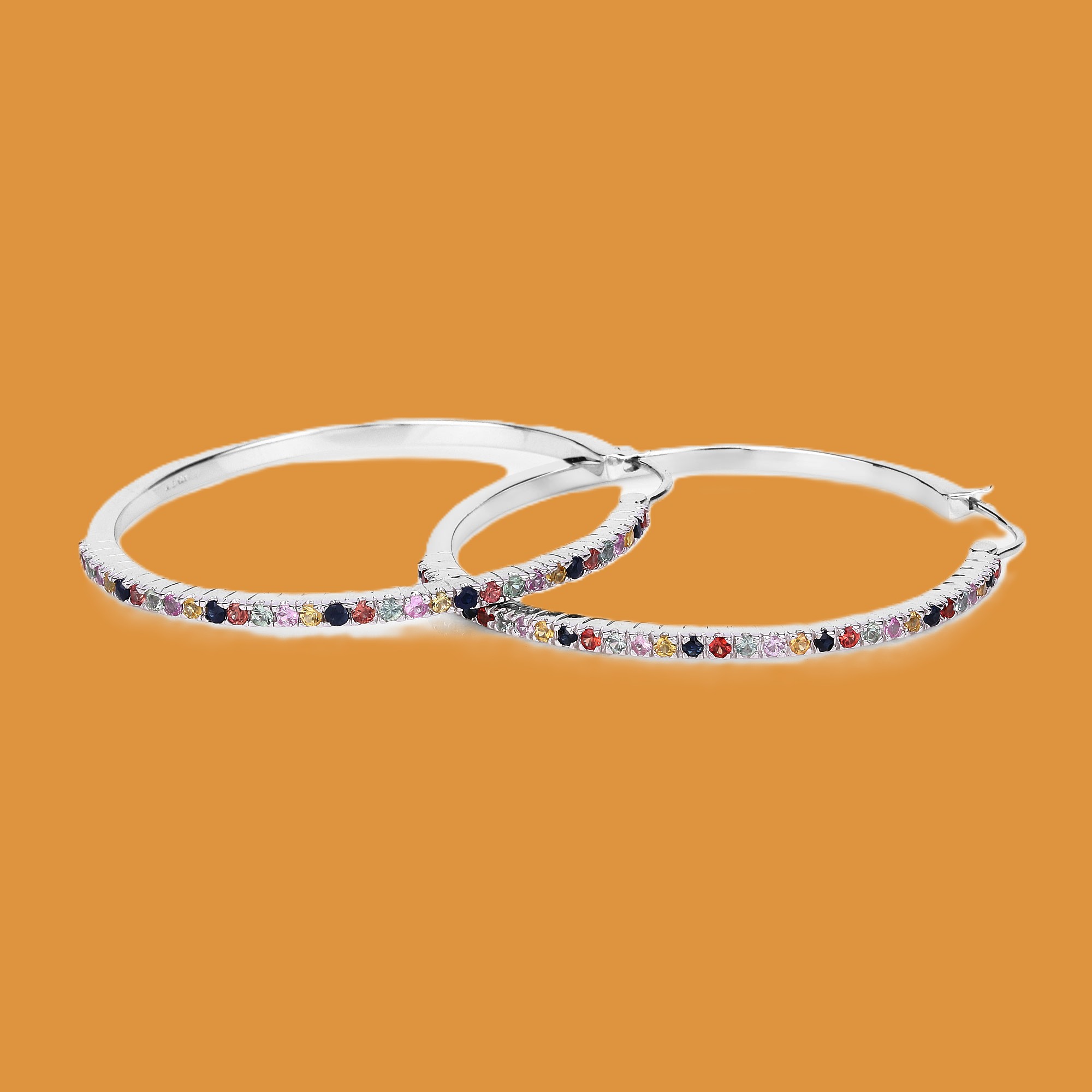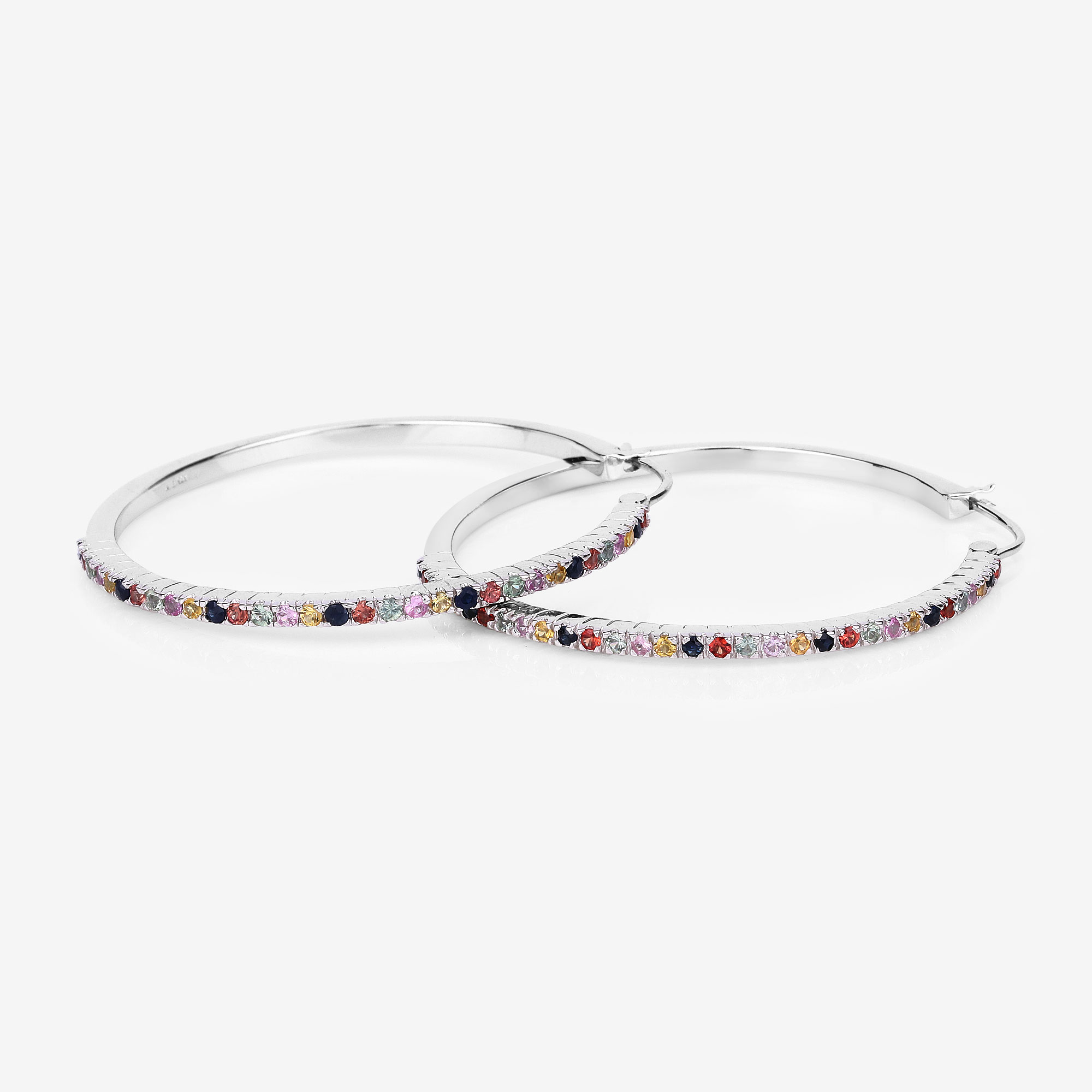 With these sterling silver hoop earrings you are no longer chasing the rainbow, you’ve caught it! The 2.24 carats of genuine, Earth-mined sapphires are prong-set, flush on the front of these glam 2" hoops and they flash their blue, yellow, orange, green, and pink brilliance the way only sapphires can! They have a gleaming rhodium finish that protects against oxidation and they attach to the earlobes with hinged posts and clip backs. See below for more information.