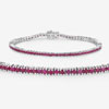 This sterling silver bracelet glows with fiery elegance as it showcases 4.44 carats total weight of genuine, round, faceted rubies. Each ruby is prong-set on a single hinged link and the bracelet is protected with a tarnish-resistant rhodium finish. These natural rubies are enhanced with heat and possibly a flux or glass additive. Read about treated rubies, and other important information below this description. The bracelet is 7" long and closes with a hidden box clasp plus two safety clips. This ruby bracelet symbolizes strength and sophistication., It is perfect for July birthdays or 40th anniversaries. AdminCode: Q/bgo