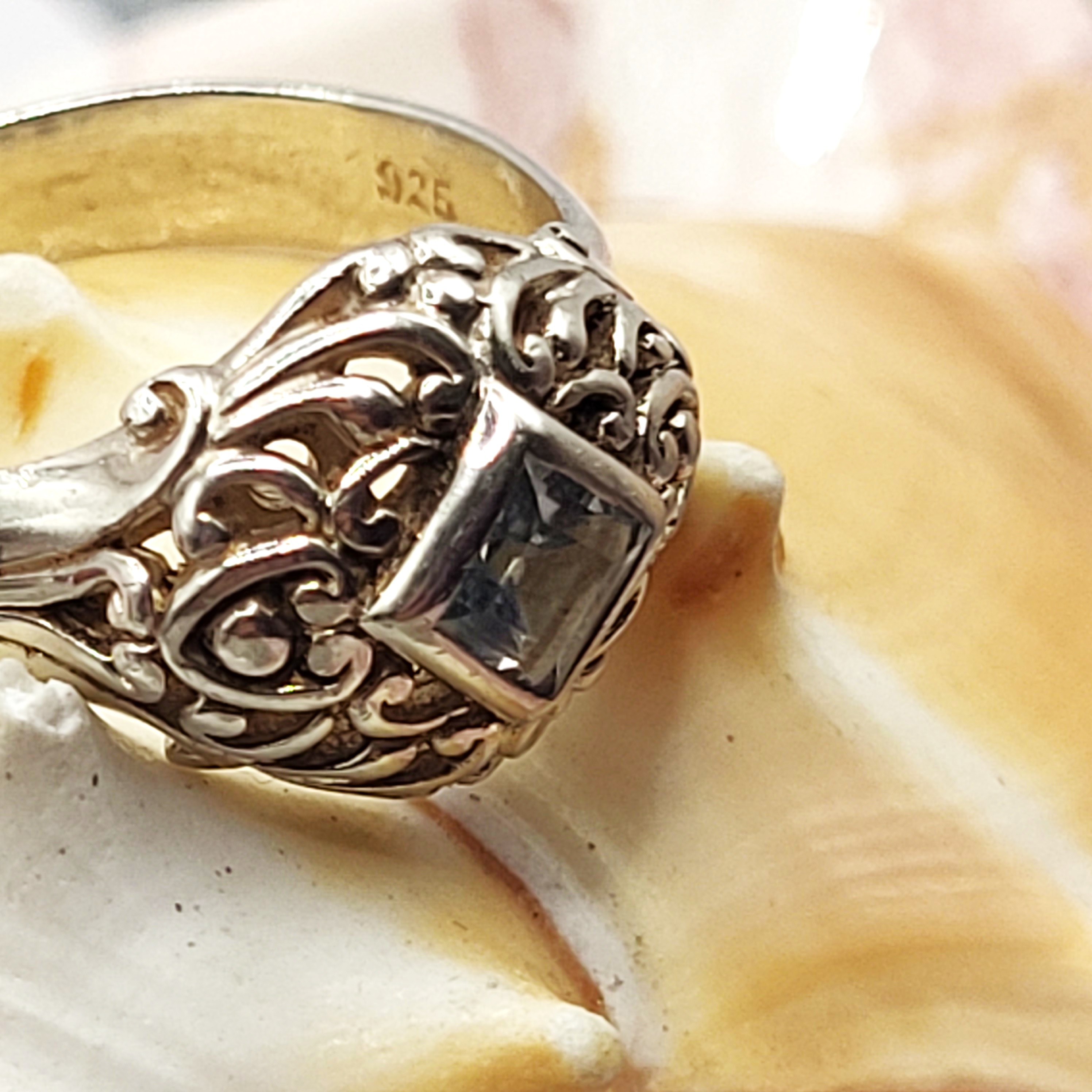 This ring appears to be custom-crafted, and very well-made. An approximate .50 carat square-cut, sky blue topaz is bezel-set in a domed frame of ribbony swirls. The split shoulders taper to a "comfort fit" smooth, polished sterling silver shank that is approximately 3.75mm wide. The ring has a reticulated gallery plate. It is US size 7.5 and can be sized for an additional charge. Please contact Bidfair Fine Jewelry for sizing details. Admin: 33122/13e-rrr