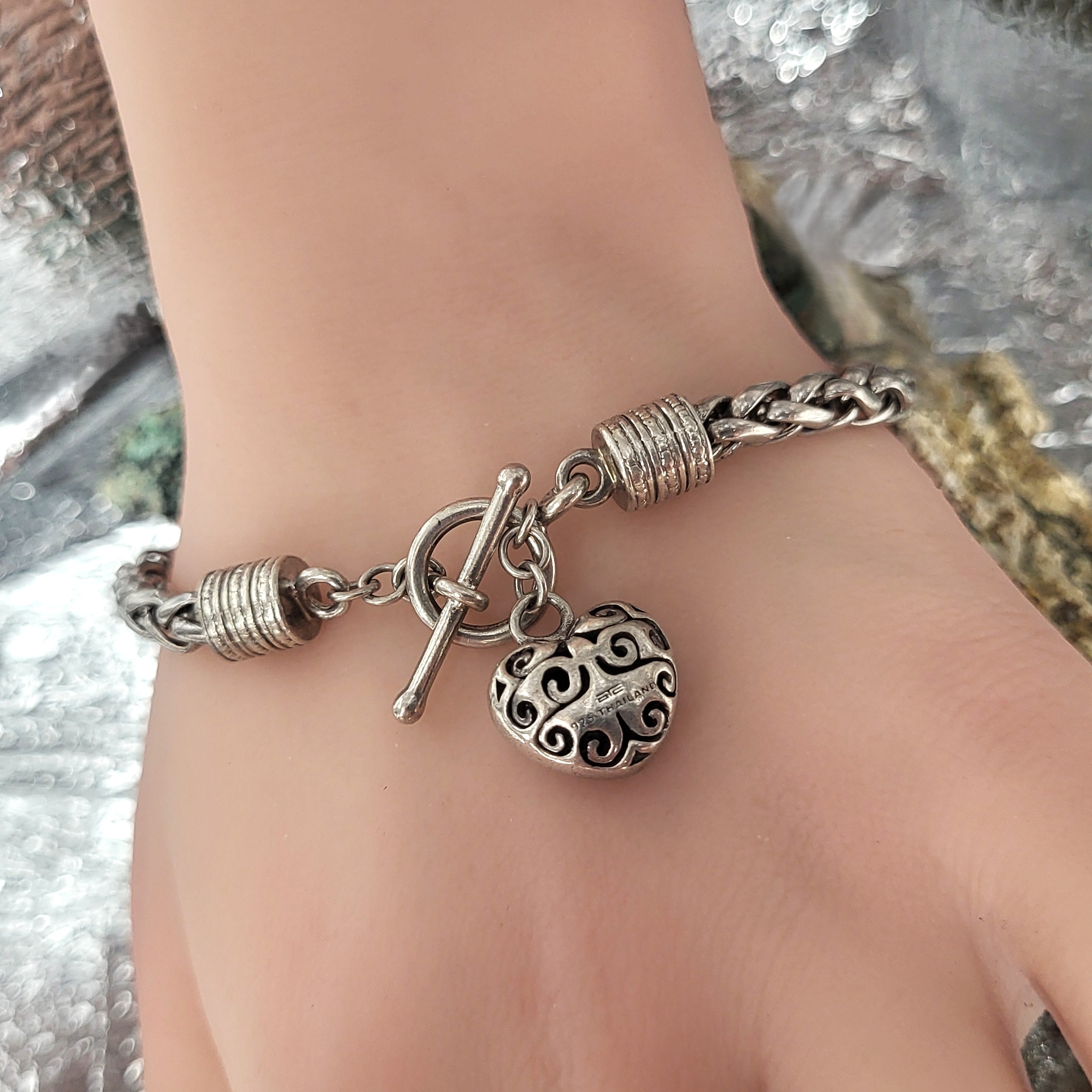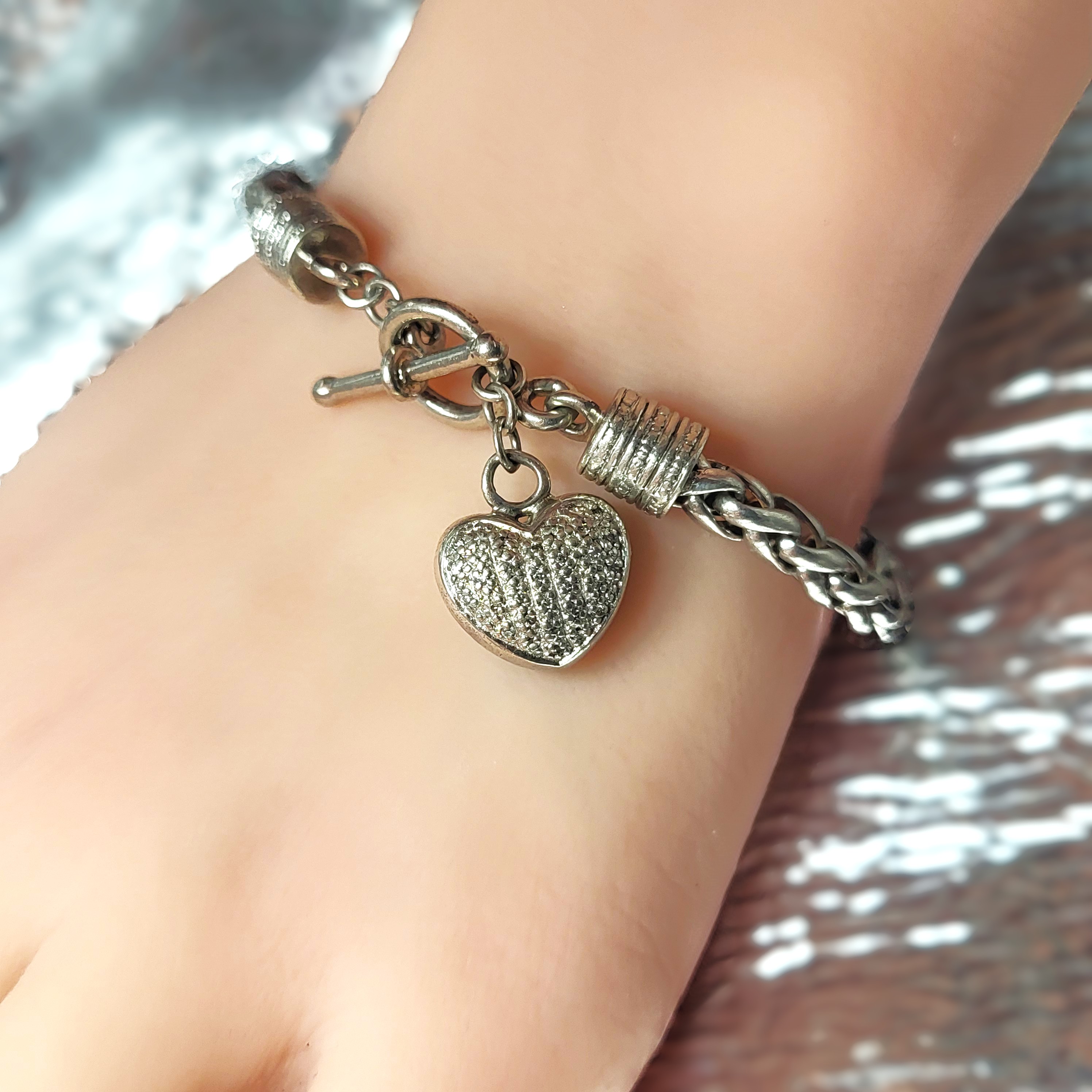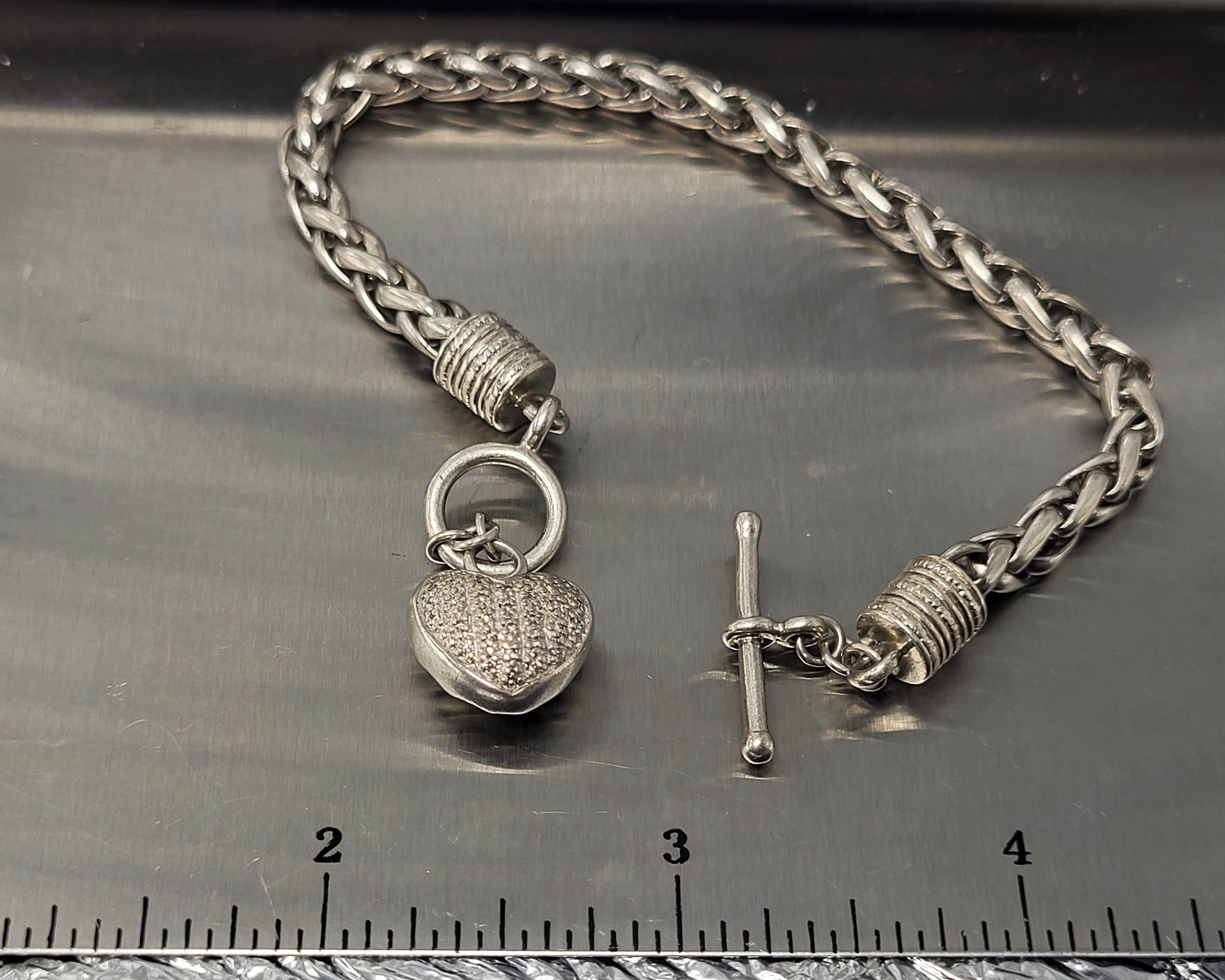 This is a sterling silver toggle bracelet with a dangling heart that features approximately .10 carats total weight, micro-pave’ set, genuine, natural, round, faceted I-J color, I2-I3 clarity diamonds on one side and the Touch of Class hallmark on the ohter. reticulated swirls. The round, wheat-link bracelet is 7" long and has beaded, deep-well end caps on each end with soldered hardware to hold the the toggle closure and diamond heart dangle charm. AdminCode: KabsC/or