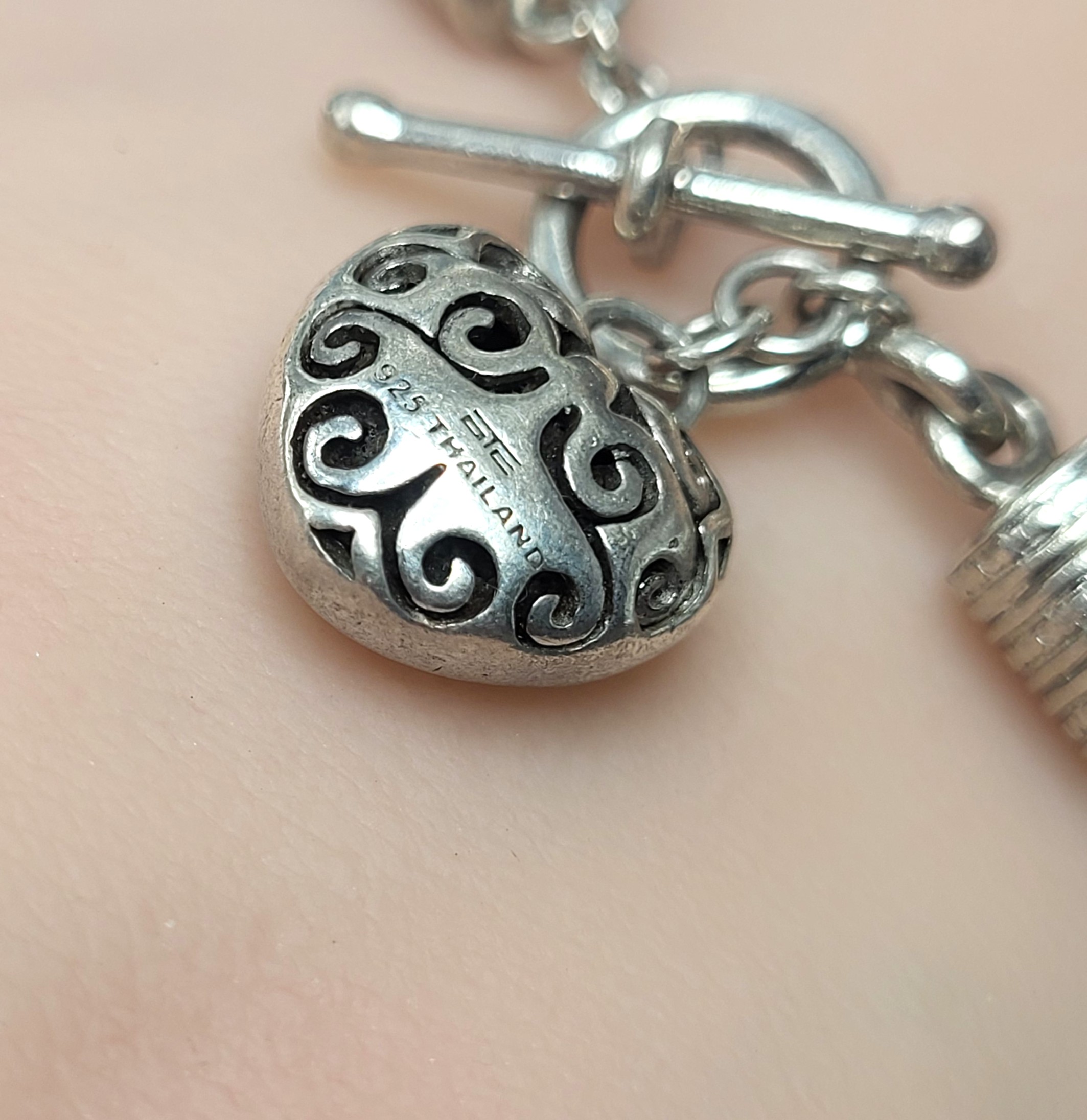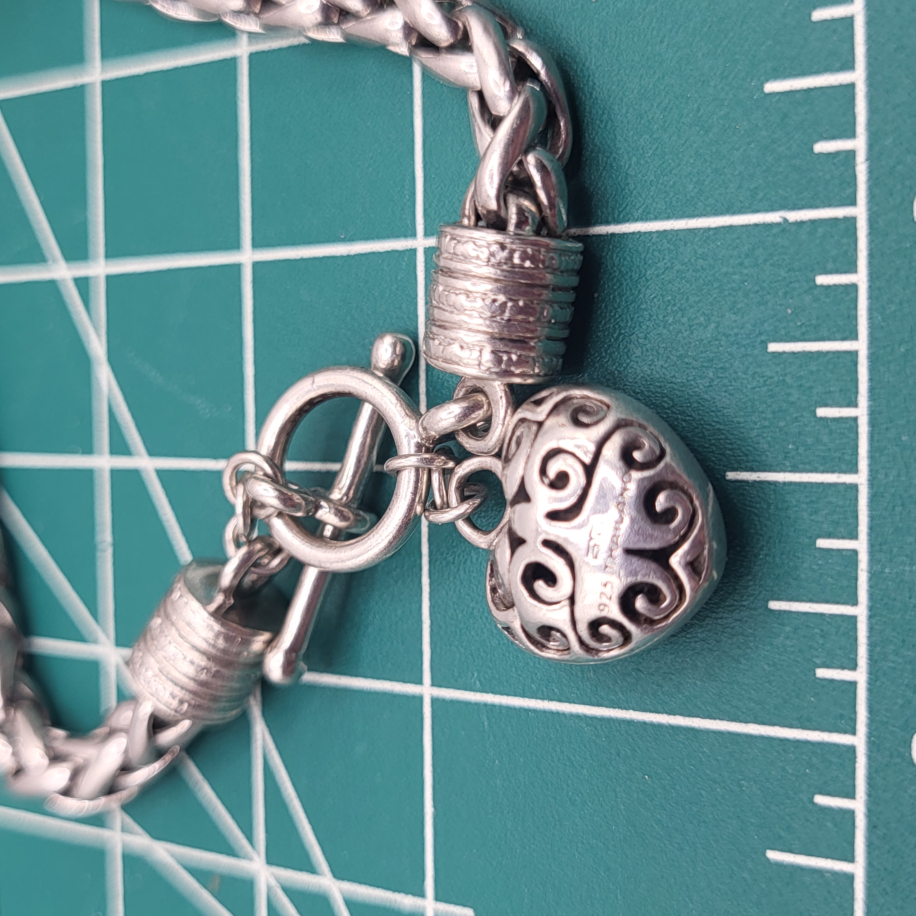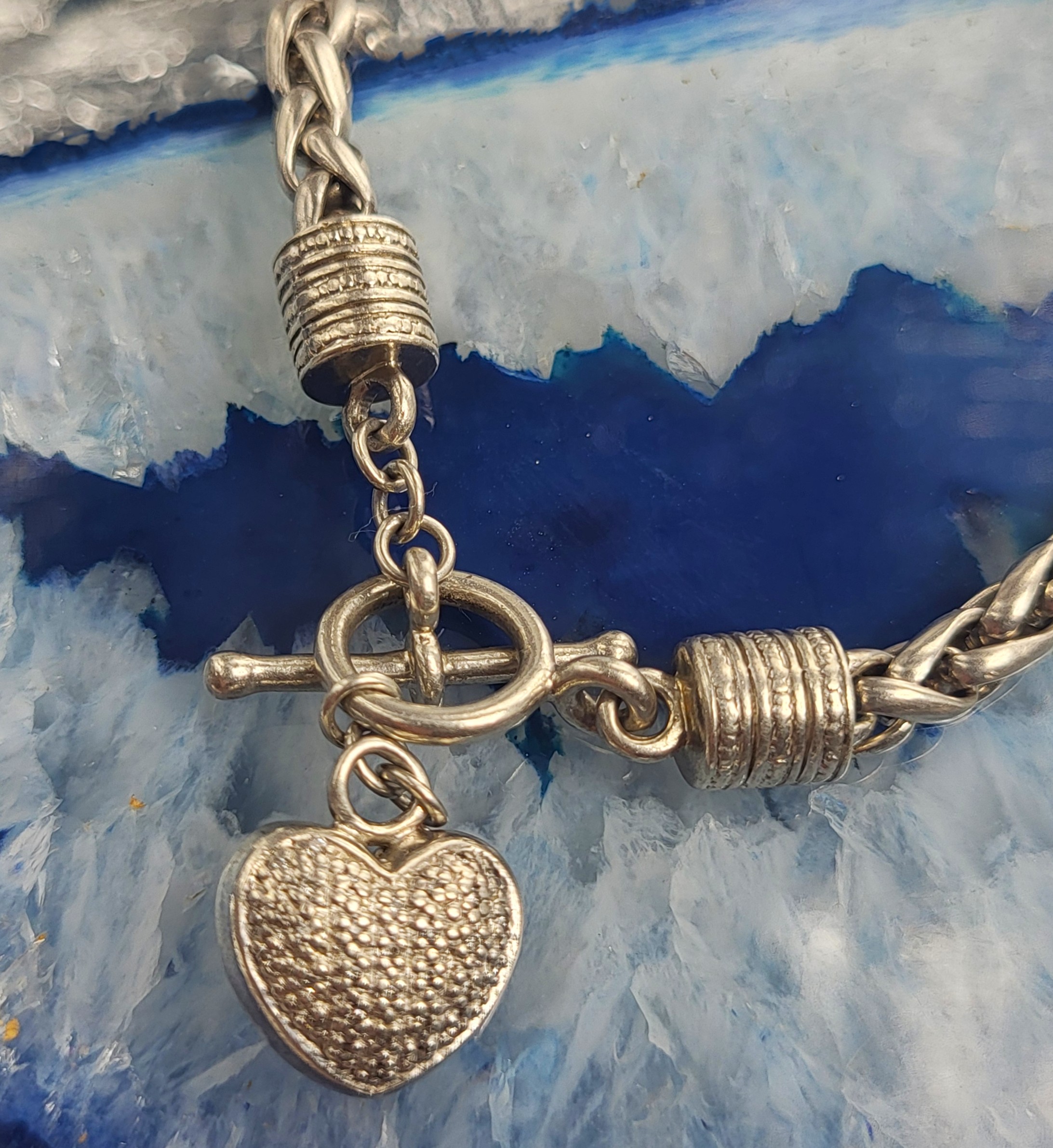 This is a sterling silver toggle bracelet with a dangling heart that features approximately .10 carats total weight, micro-pave’ set, genuine, natural, round, faceted I-J color, I2-I3 clarity diamonds on one side and the Touch of Class hallmark on the ohter. reticulated swirls. The round, wheat-link bracelet is 7" long and has beaded, deep-well end caps on each end with soldered hardware to hold the the toggle closure and diamond heart dangle charm. AdminCode: KabsC/or