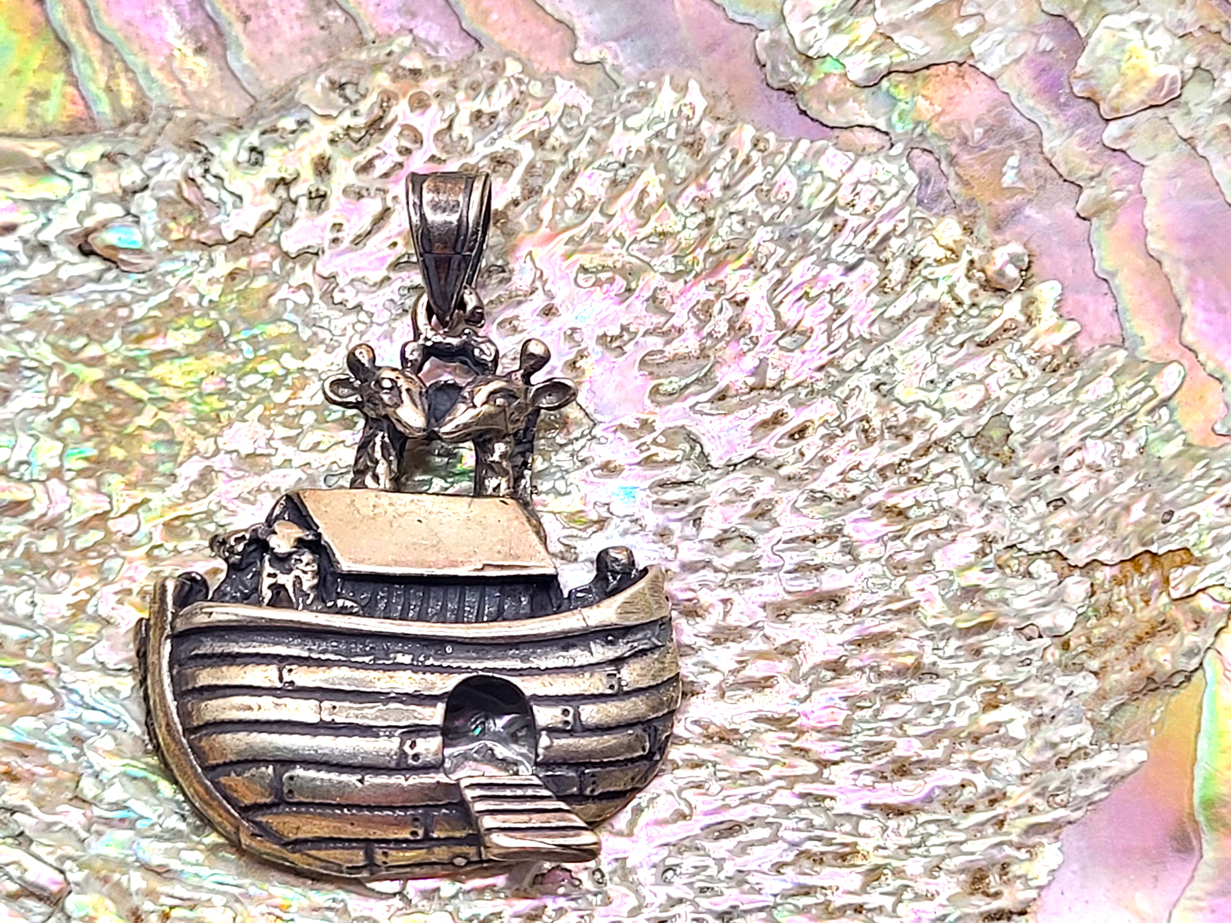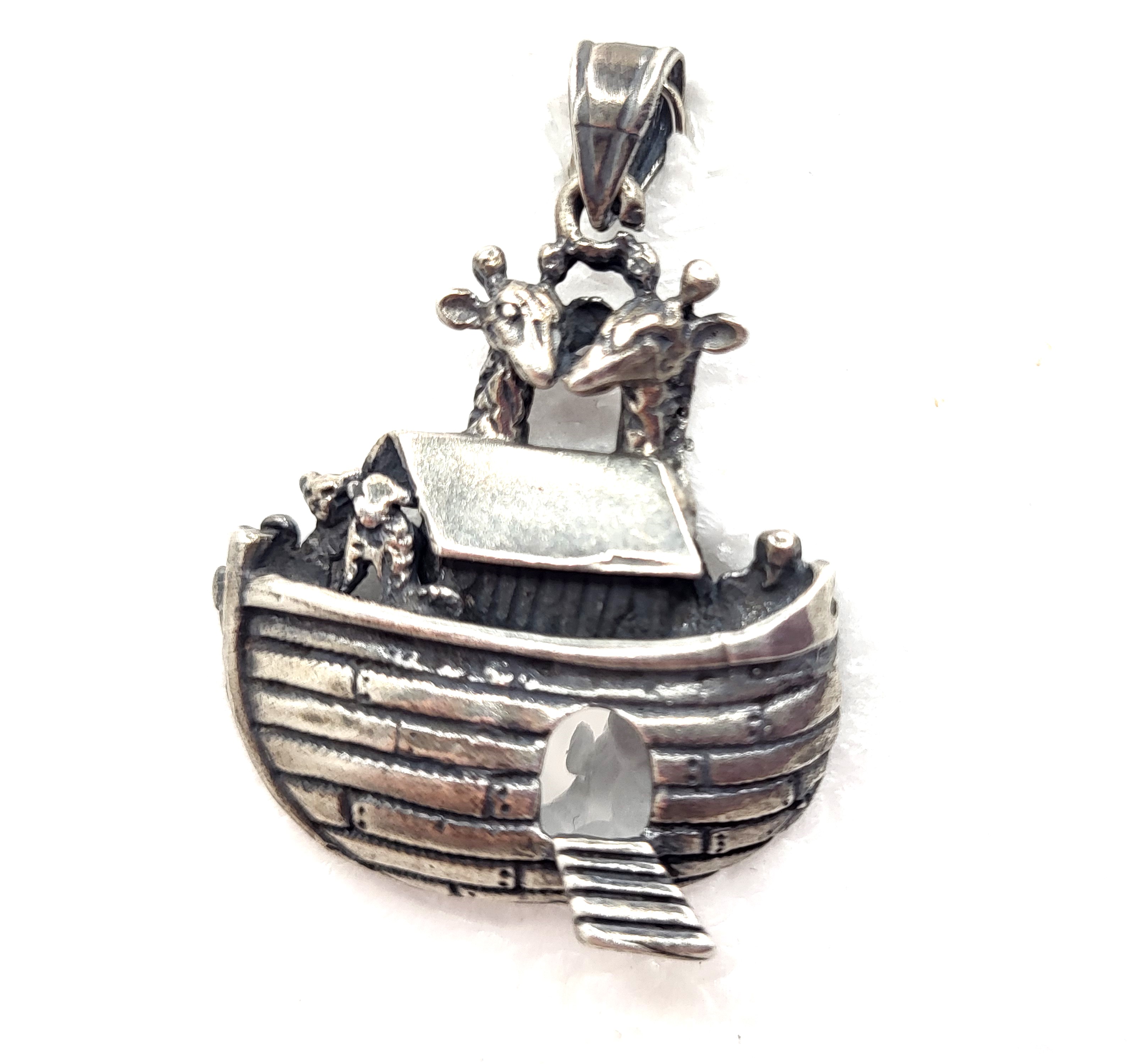 This is a sterling silver pendant, circa mid-’90’s. The figural pendant depicts Noah’s Ark, with giraffes, a lion cub, a lamb, and perhaps, Noah himself?. Feel free to give us your opinion of the figure at the stern! The pendant measures approximately 1.5" x 1.75" and has a bail that can accommodate an approximate 4mm wide chain. The hallmark on this pendant is G.S.J. with the copyright mark. (Gold Stone Jewelry-no import stamps indicating made somewhere other than (the US) America. This is much nicer looking than others seen online that appear to have been recast from an original.
