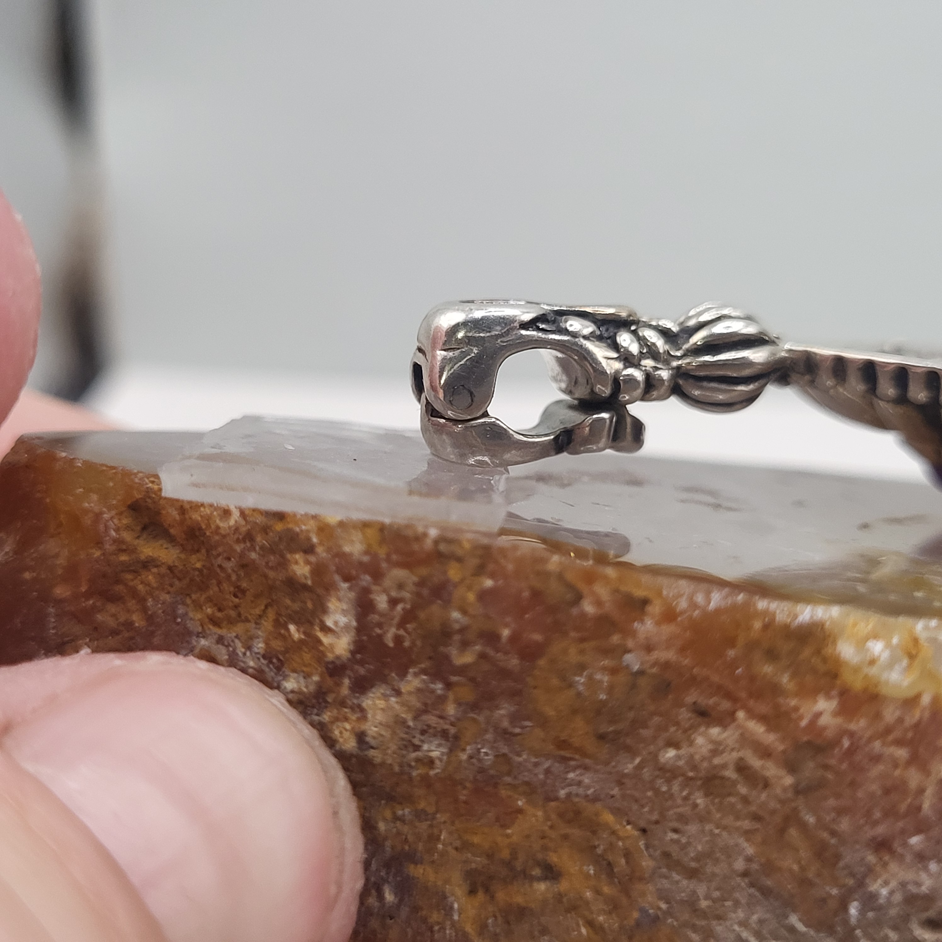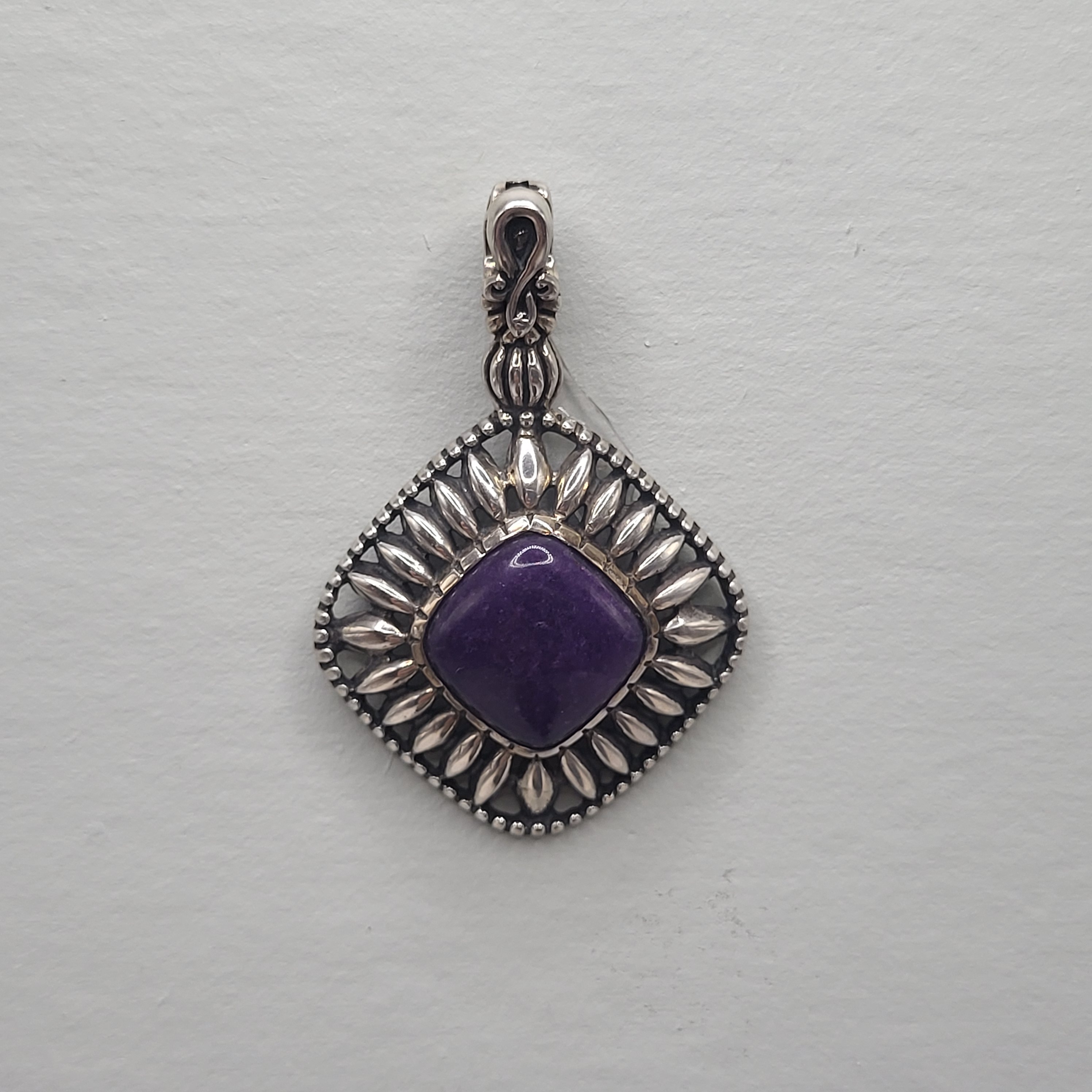 The square frame features a radiant floral motif with petal-like silver accents and beaded edges, while the bail is adorned with elegant scrollwork—signature touches of Carolyn Pollock’s Relios design.