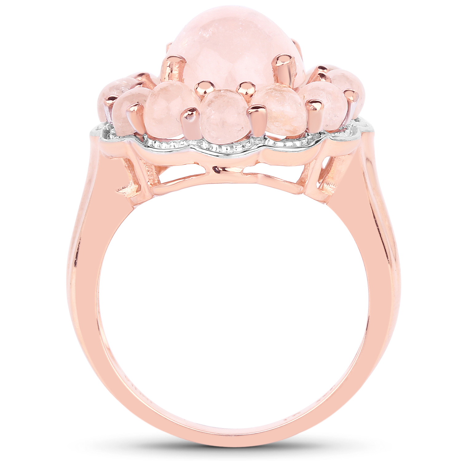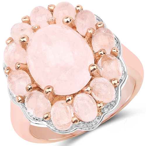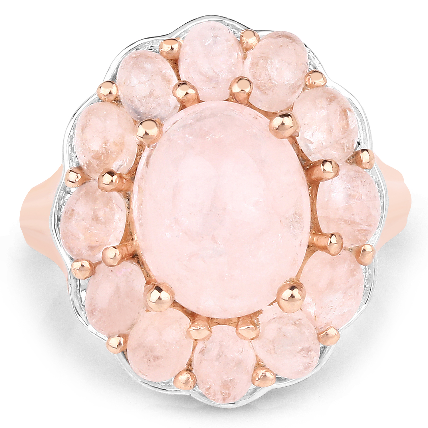 This sterling silver ring sings the praises of Morganite with 6.76 carats total weight of cabochon-cut and polished, genuine morganite. The soft pink semitranslucent gemstones literally glow from within. The center 4 carat Morganite measures 11x9mm and is prong-set in a chunky halo of 2.76 carats of 4x3mm oval, prong-set cabochons Morganite. This is definitely a statement ring. It is US size 8. See sizing options and other information below. AdminCode: NQnis/ee3